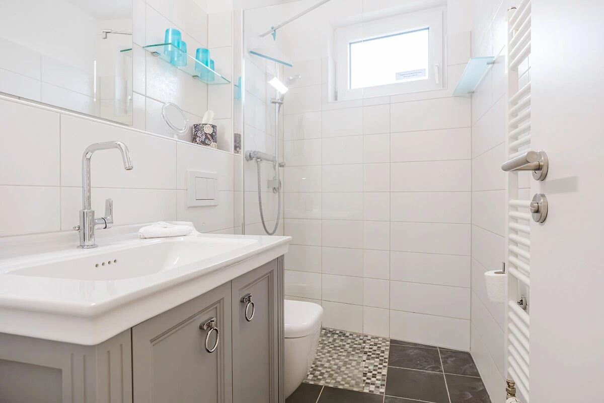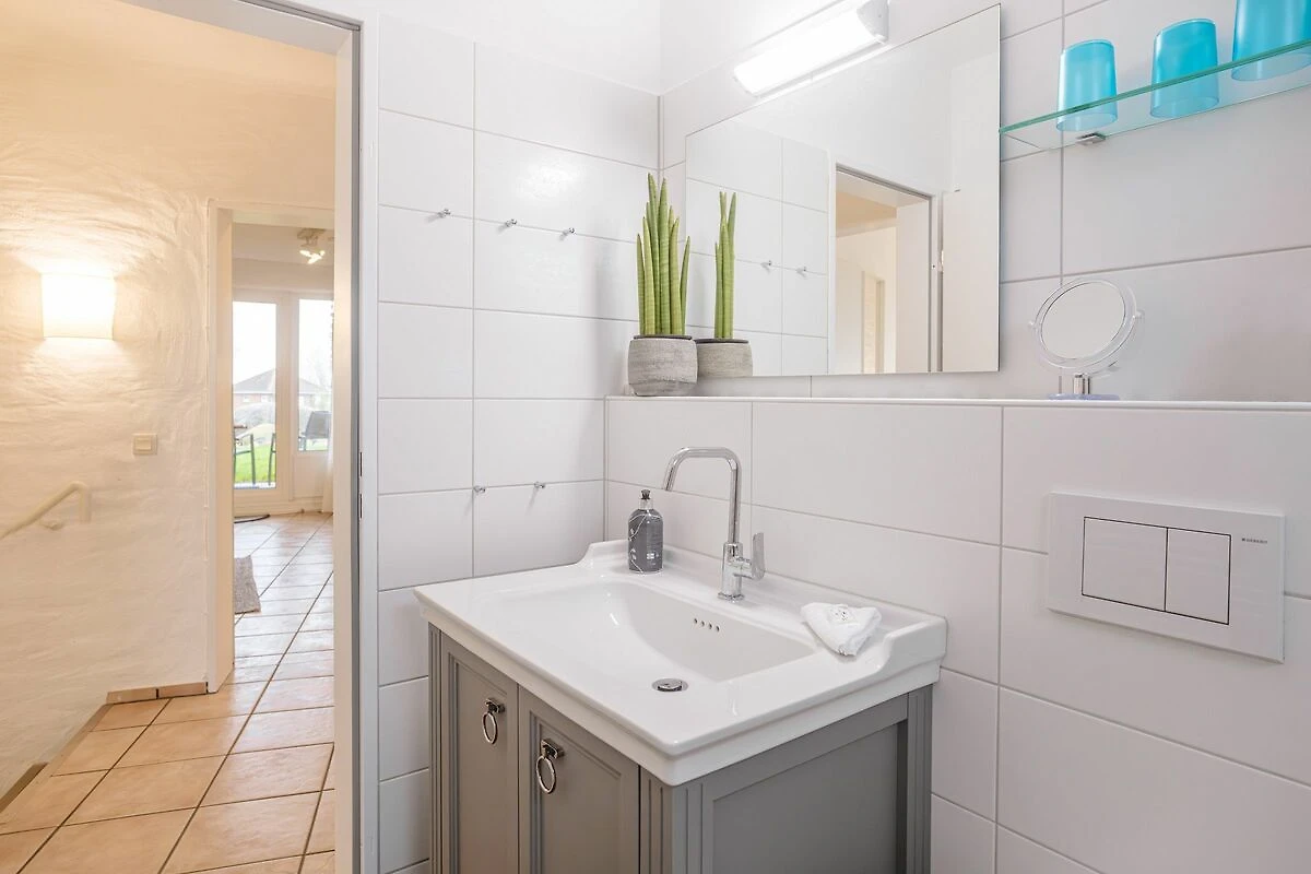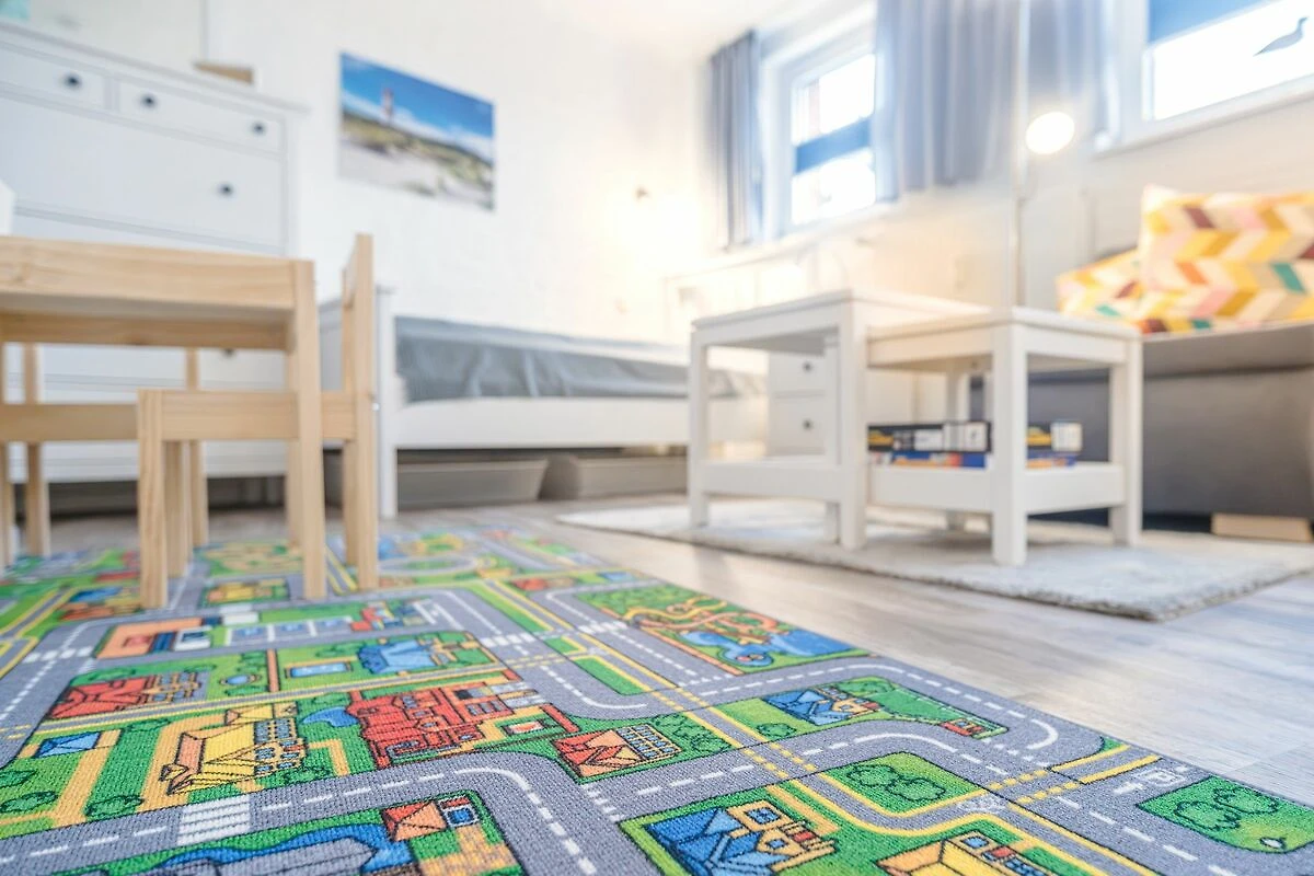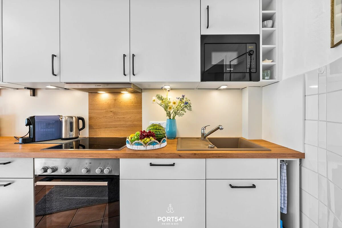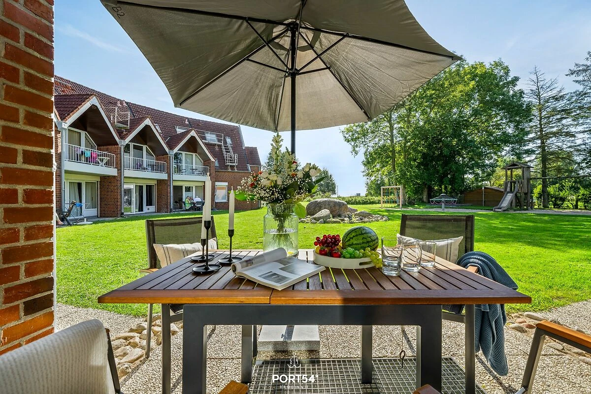 Nur 50m vom schönen Sandstrand entfernt, umgeben von unberührter Natur nahe dem Landschaftsschutzgebiet „Geltinger Birk“ und den Orten Gelting, Maasholm und Kappeln in unmittelbarer Nähe wohnen Sie in der hochwertig eingerichteten Ferienwohnung "Meerblick", die auf 51m² Platz für 5 Personen bietet, ebenerdig mit Terrasse und Blick auf die Ostsee. Das Interieur der Unterkunft ist modern und skandinavisch gemütlich aufeinander abgestimmt. Ein komfortables Ecksofa für bis zu 5 Personen mit angenehmer Beleuchtung und Teppich lädt zum gemütlichen Lesen, zu einem Glas Wein oder Fernsehen ein. Der an der Wand befestigte und schwenkbare 40‘ Fernseher ist von jedem Sitzplatz im Wohn- und Essbereich einsehbar. Am langen, hochwertigen Holz-Esstisch genießen Sie das Wohlfühlambiente, nicht nur beim zubereiteten Essen, sondern gerne auch bei Brett- und Kartenspielen, begleitet von Musik der Stereoanlage. Zum Essbereich gehört die modern ausgestattete Einbauküche, die keinen Wunsch an Küchenutensilien und „kleinen Helfern“ offen lässt; Cerankochfeld, Backofen, Geschirrspüler, Kaffee- und Kaffee-Kapselmaschine (Tassimo), Wasserkocher, Toaster, Handmixer, Eierkocher und ganz viel Platz für „dütt un datt“ inbegriffen. Auch eine hochwertige Einbau-Mikrowelle istr vorhanden. Damit Sie für jede Situation die richtige Stimmung erzeugen können, stehen Ihnen zahlreiche Beleuchtungsmöglichkeiten zur Verfügung. Das Schlafzimmer besteht aus einem Doppelbett (180 x 200 cm), 2 Nachttischen, einer offenen Kleider-, Regal- und Schubladenkombination mit ausreichend Platz für Ihre Urlaubsgarderobe, einer Ambiente-Leuchte, 2 Wand- und 2 Leselampen, Verdunkelungs-Plissées und Vorhängen sowie einem eingebauten Fliegengitter. Das ebenerdige Tageslichtbad besteht aus einer Dusche mit Glasabtrennung und Duschregal, Handtuchwärmer, Föhn, Kosmetikspiegel und Waschtisch mit geräumigen Unterbauschrank. Das zweite Schlafzimmer im Souterrain besteht aus 2 Einzelbetten (90 x 200 cm), mit je einer Wandleuchte, einer Leselampe, einer geräumigen Kommode, ein auf 90 x 200 cm ausziehbarer Schlafsessel mit Matratzenauflage im Abstellraum sowie Couchtisch, Teppich, Deckenfluter mit integrierter Leselampe, Dartscheibe und - falls Sie mit kleinen Kindern anreisen: ein Spielteppich mit kleinen Autos, Maltisch und 2 Stühlchen vervollständigen das Interieur. Ferner ist das Zimmer ebenfalls mit Verdunkelungs-Plissées, Vorhängen und im Fenster integriertem Fliegengitter ausgestattet. Zusätzlich finden Sie Sonnenschirm, Staubsauger, Wäscheständer, Wäschekorb, Dusch-Sitz-Hocker, 2-Trittleiter, Bügeleisen und -brett, Kinderhochstuhl, Baby-Reisebett, Kinder-Rausfallschutz und 2 Sandschaufeln im Abstellraum. Ein kostenloser Parkplatz ist ebenfalls für Sie vor der Unterkunft reserviert. Auf der Terrasse mit den hochwertigen Alu-, Holz-Terrassenmöbeln können Sie sich mit Blick auf die Ostsee und der gepflegten Gartenanlage wohlfühlen. Die großzügige Wiese, die sowohl zur Aktivität als auch zur Entspannung einlädt, kann von der Terrasse aus der direkte Weg zum Strand sein. Es erwartet Sie in der Zeit von Ostern bis zum letzten Wochenende im September ein kostenloser Strandkorb ohne Strandgebühr oder Kurtaxe. Zudem bietet die Apartmentanlage einen kostenfreien Zugang zum Schwimmbad in der Zeit von Ostern bis Oktober, einen Aktivraum mit Tischkicker und einer Tischtennisplatte (Schläger und Bälle bitte selbst mitnehmen) sowie einen gemeinschaftlich genutzten Wellnessbereich mit einer Infrarot-Sauna, die mit 2€-Münzen betrieben wird, eine Wärmekabine, Waschmaschine und Trockner gegen kleine Gebühr sowie einen abschließbaren, gemeinschaftlichen Fahrradraum.
