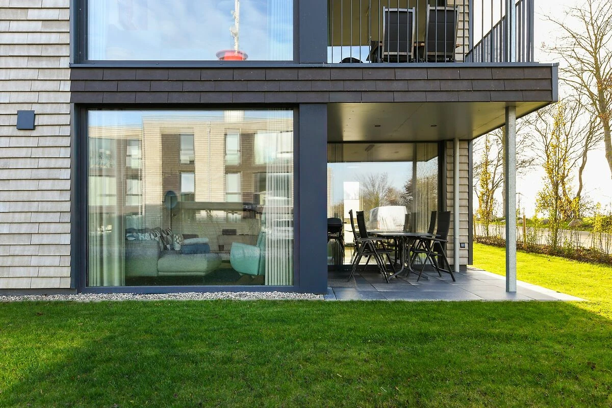 Ob Frühstück an der frischen Luft oder ein Glas Wein beim Sonnenuntergang – auf der überdachten Terrasse mit Sitzmöbeln genießt du jederzeit den Blick aufs Meer. Der angrenzende Garten ist exklusiv zur alleinigen Nutzung vorgesehen – mit viel Platz zum Spielen, Toben oder einfach zum Durchatmen.