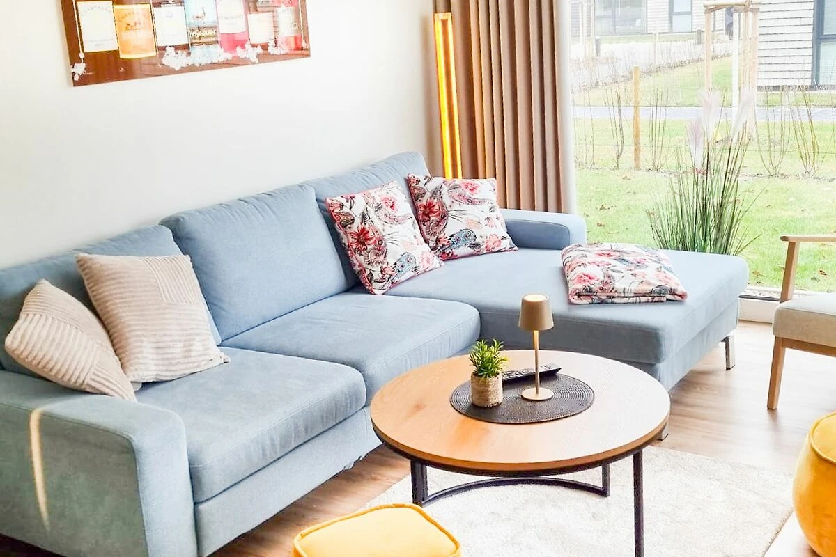 Der offene Wohnbereich verbindet Wohnzimmer, Küche und Essplatz zu einem harmonischen Raumkonzept. Große bodentiefe Fenster lassen viel Licht herein und eröffnen dir den direkten Zugang zur überdachten Terrasse. Die voll ausgestattete Küche mit hochwertigen Markengeräten wie Geschirrspüler, Backofen und Kaffeemaschine lädt zu entspannten Kochabenden ein. Im gemütlichen Wohnbereich mit Smart-TV kannst du dich zurücklehnen und die Seele baumeln lassen – oder gesellige Stunden mit deinen Liebsten verbringen.