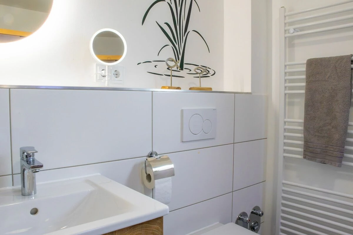 Das moderne Badezimmer im Erdgeschoss bietet dir pure Entspannung: