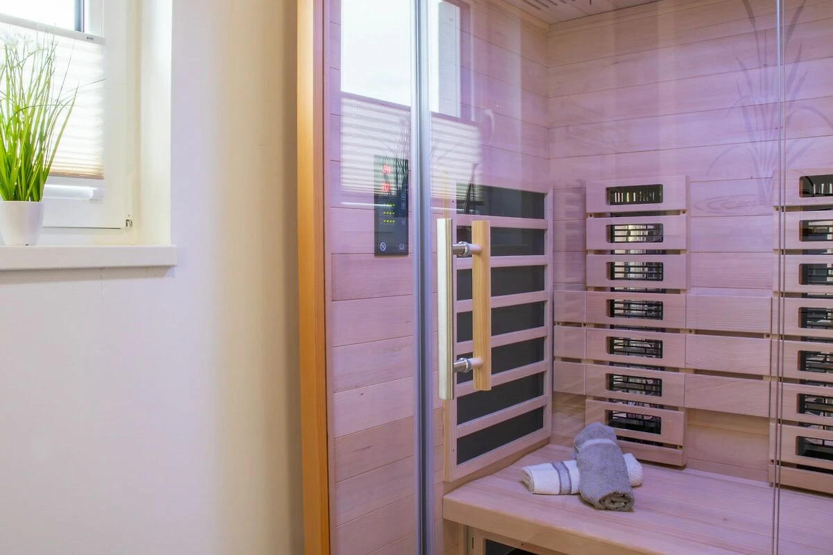 Eine großzügige, bodengleiche Dusche und eine private Infrarotsauna sorgen für wohlige Wärme – ideal nach einem langen Strandspaziergang oder einer Wattwanderung.