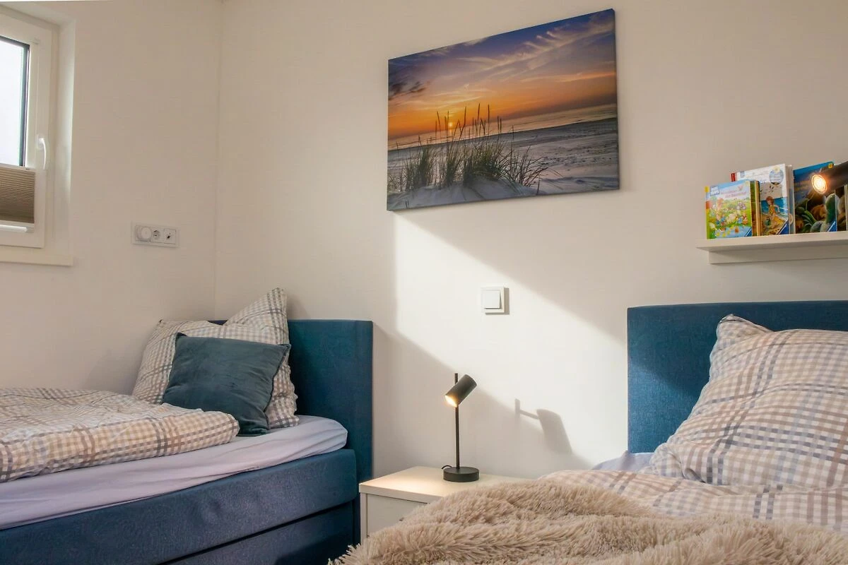Im Obergeschoss erwarten dich zwei liebevoll eingerichtete Schlafzimmer. Eines davon ist mit einem hochwertigen Boxspringbett (180x200 cm) und einem Smart-TV ausgestattet – perfekt für entspannte Abende. Das zweite Schlafzimmer verfügt über zwei komfortable Einzel-Boxspringbetten (je 90x200 cm) und eignet sich ideal für Kinder, Freunde oder Geschwister. Beide Räume sind mit Verdunkelungsplissees versehen, die dir einen ruhigen, erholsamen Schlaf ermöglichen.