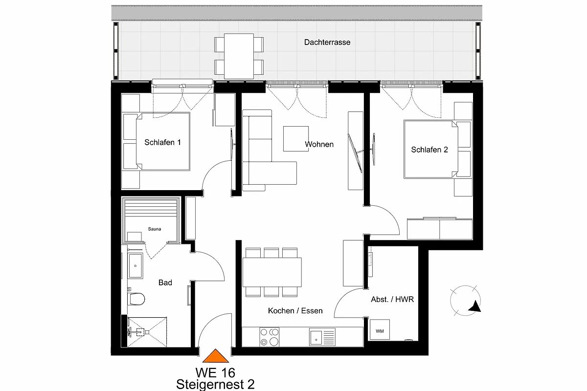 Zwei gemütliche Schlafzimmer mit hochwertigen Boxspringbetten (je 180 × 200 cm) sorgen für erholsamen Schlaf. Eines der Schlafzimmer verfügt über einen Smart-TV und einen direkten Zugang zur Dachterrasse – für den ersten Kaffee am Morgen mit Ausblick. Verdunkelungsplissees sorgen überall für angenehme Nächte.