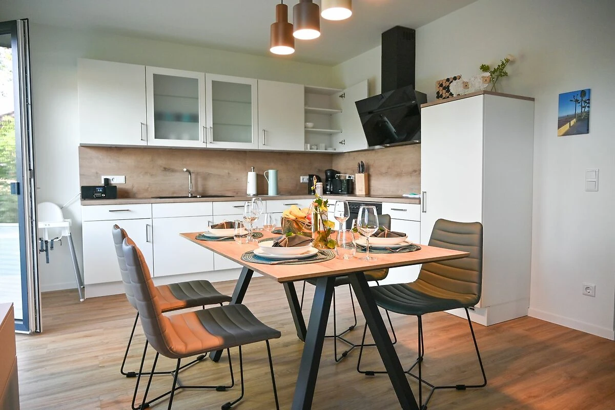 Der offene Wohnbereich mit Zugang zur möblierten Terrasse und angrenzender Rasenfläche schafft eine helle, freundliche Atmosphäre. Große Fenster lassen viel Tageslicht herein, der ebenerdige Zugang sorgt für höchsten Komfort. Die voll ausgestattete Küche mit hochwertigen Geräten und Raclette-Grill macht Kochen auch im Urlaub zum Vergnügen. Ein Elektrogrill auf der Terrasse lädt zu entspannten Abenden im Freien ein.