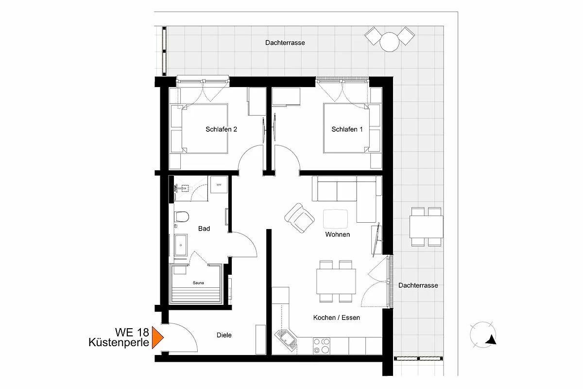 Der helle Wohnbereich mit großen Fenstern öffnet sich zur weitläufigen Dachterrasse. Hier könnt ihr sonnenbaden, gemeinsam essen oder einfach nur entspannen. Die offene Küche ist mit hochwertigen Geräten voll ausgestattet – ideal für gemeinsames Kochen. Für Unterhaltung sorgen Smart-TV, SONOS-Sound und eine gemütliche Sofaecke.