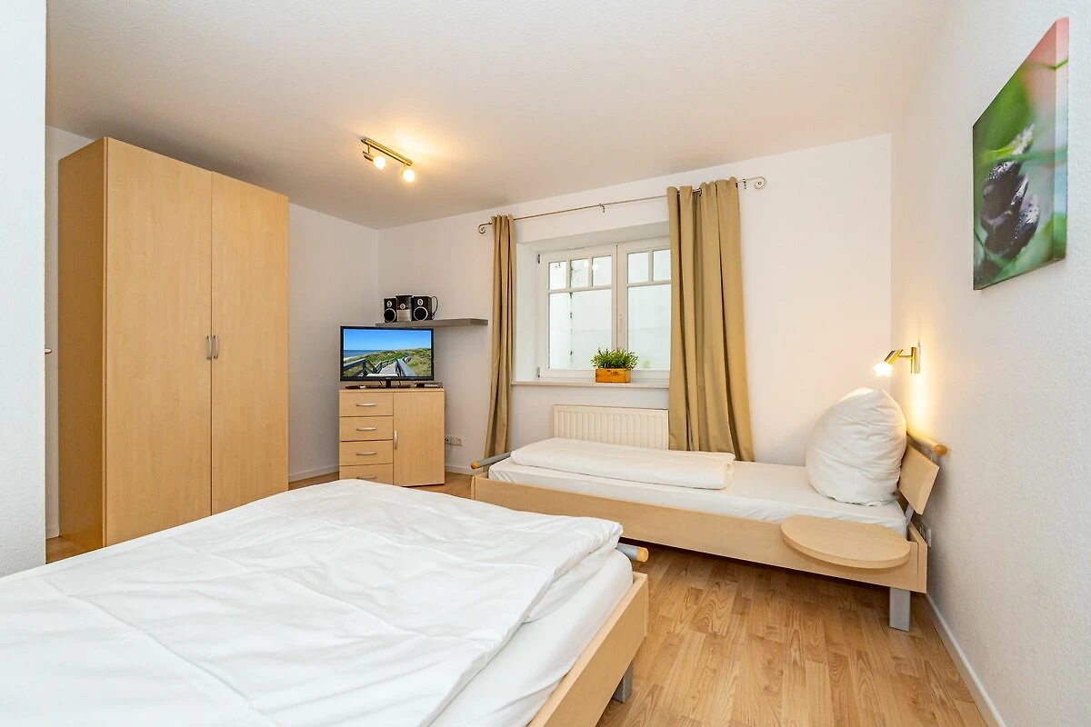Der helle Wohnbereich ist einladend gestaltet und bietet neben TV und WLAN auch einen direkten Zugang zur eigenen Terrasse. Hier können Sie entspannte Stunden im Freien verbringen und den Tag bei frischer Nordseeluft ausklingen lassen. Die Terrasse eignet sich ideal zum Frühstücken im Freien oder zum gemütlichen Beisammensein am Abend.