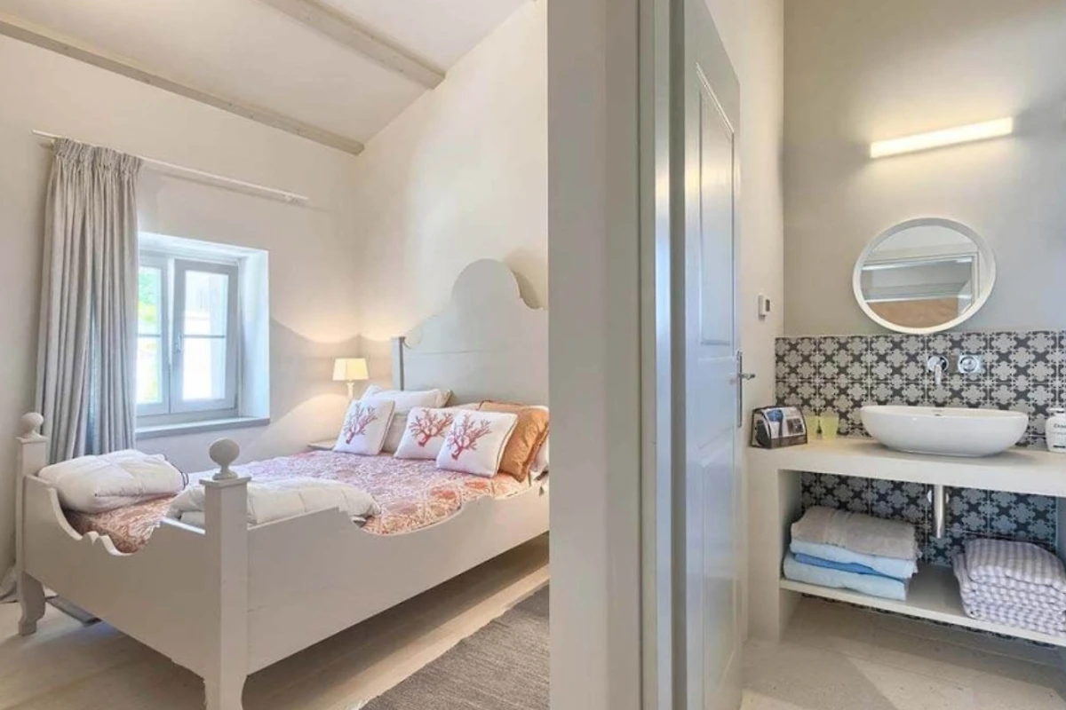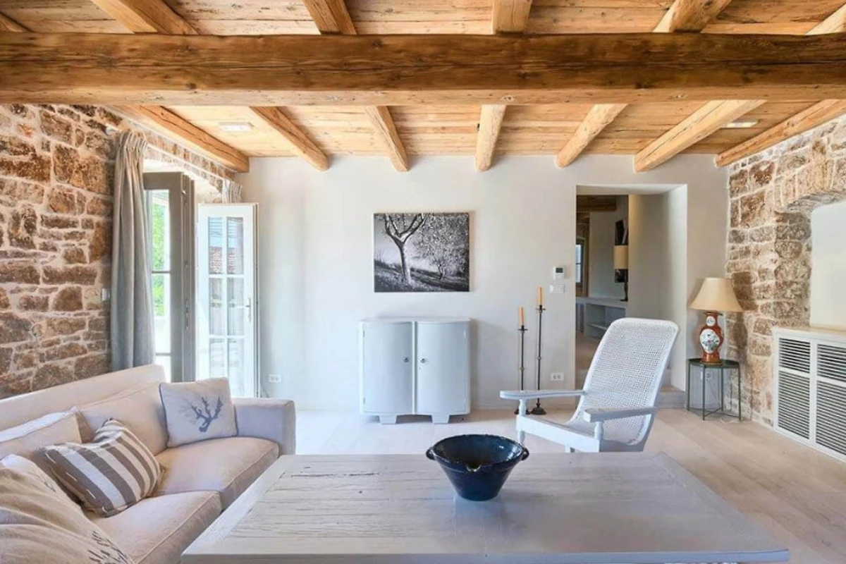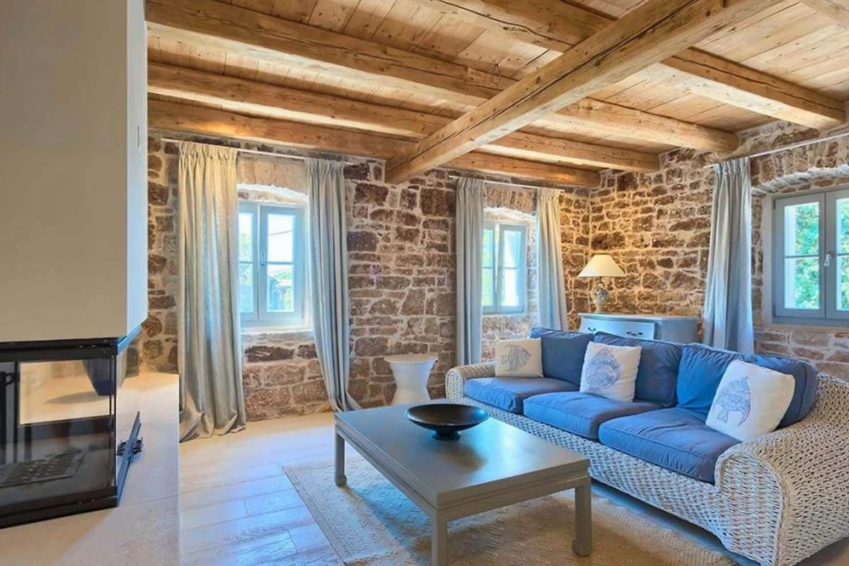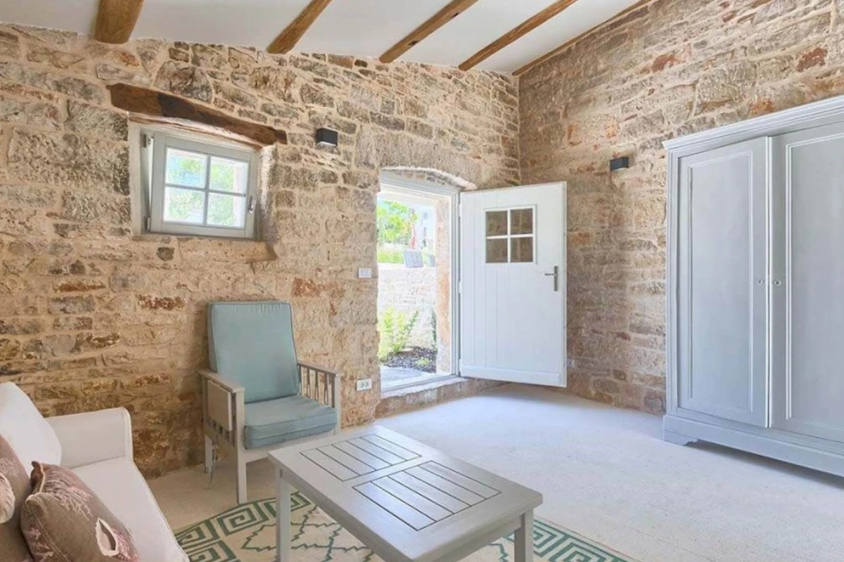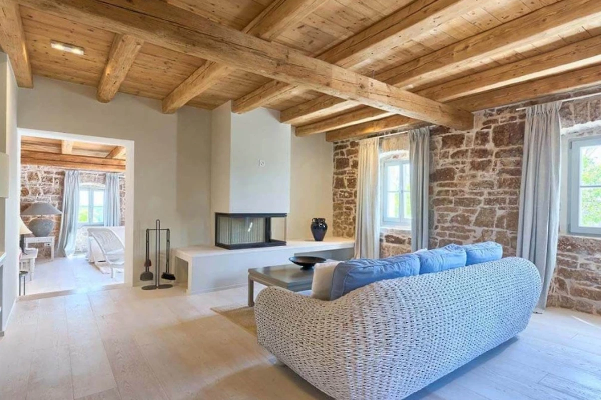Das Haupthaus empfängt Sie mit einer Kombination aus Stein, Holz und minimalistischer, moderner Einrichtung, ebenso wie die anderen Wohneinheiten. Helle Farben dominieren in allen Zimmern und schaffen eine entspannte Atmosphäre mit Blick auf das Grün aus den Fenstern. Alle Räume sind mit einer Fussbodenheizung ausgestattet, die zum allgemeinen Komfort beiträgt. Im Erdgeschoss befindet sich eine voll ausgestattete moderne Küche mit Induktionskochfeld und einem hellen Essbereich. Ausserdem gibt es im Erdgeschoss ein Gästebad. Im ersten Stock gibt es zwei Wohnzimmer - eines mit Flügeltüren, die direkt auf die Terrasse mit Meerblick führen, und das andere mit einem modernen Kamin für Gäste. Das Haupthaus bietet Platz für 7 Gäste und verfügt über 3 elegante Doppelschlafzimmer mit eigenem Bad und 1 Einzelzimmer. Die modernen Bäder sind mit Toilettenartikeln und Haartrocknern ausgestattet.
