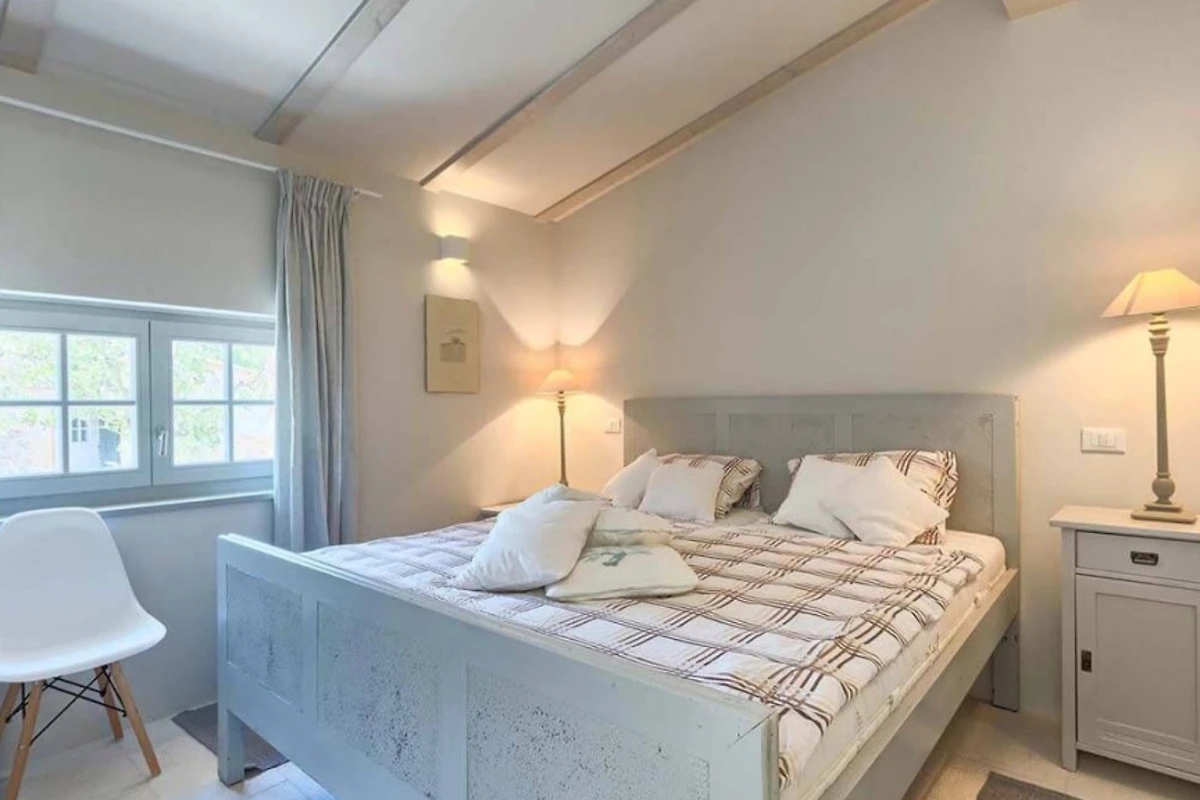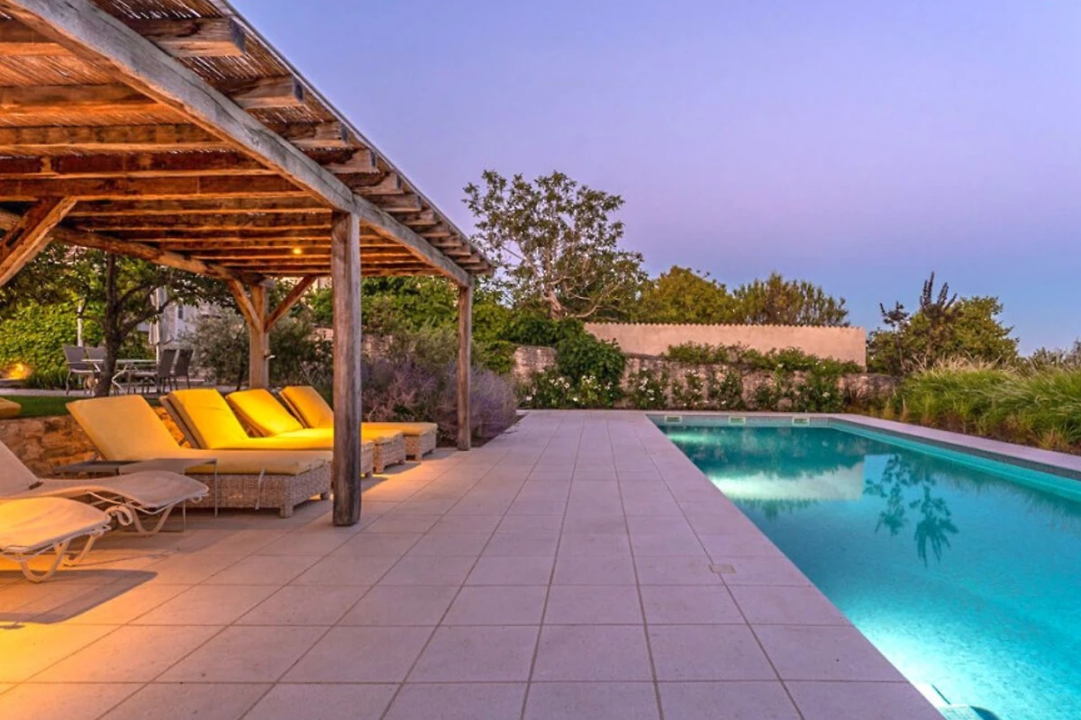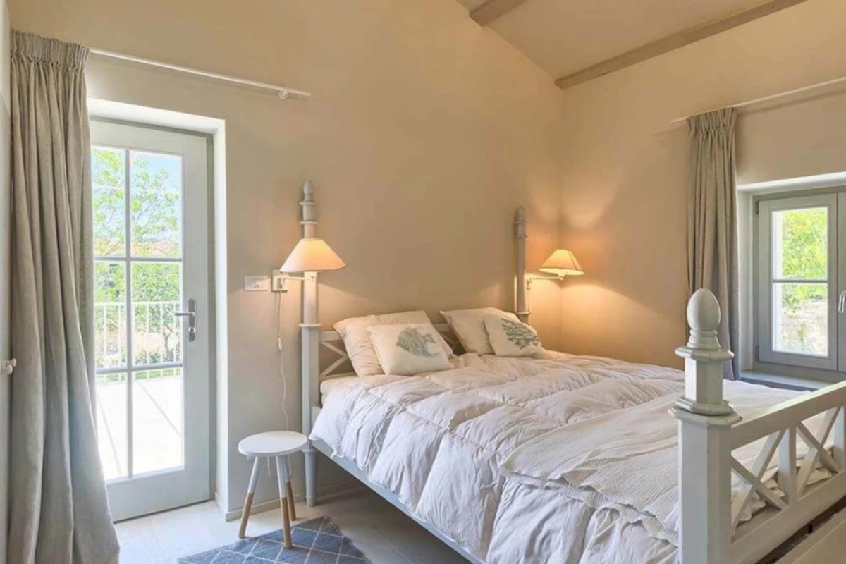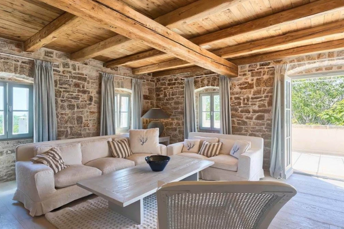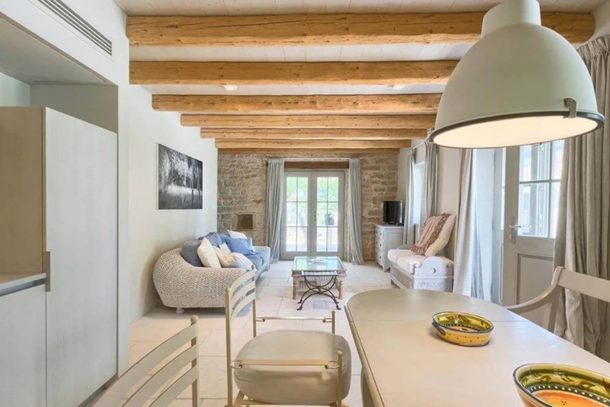 Das Haupthaus empfängt Sie mit einer Kombination aus Stein, Holz und minimalistischer, moderner Einrichtung, ebenso wie die anderen Wohneinheiten. Helle Farben dominieren in allen Zimmern und schaffen eine entspannte Atmosphäre mit Blick auf das Grün aus den Fenstern. Alle Räume sind mit einer Fussbodenheizung ausgestattet, die zum allgemeinen Komfort beiträgt. Im Erdgeschoss befindet sich eine voll ausgestattete moderne Küche mit Induktionskochfeld und einem hellen Essbereich. Ausserdem gibt es im Erdgeschoss ein Gästebad. Im ersten Stock gibt es zwei Wohnzimmer - eines mit Flügeltüren, die direkt auf die Terrasse mit Meerblick führen, und das andere mit einem modernen Kamin für Gäste. Das Haupthaus bietet Platz für 7 Gäste und verfügt über 3 elegante Doppelschlafzimmer mit eigenem Bad und 1 Einzelzimmer. Die modernen Bäder sind mit Toilettenartikeln und Haartrocknern ausgestattet.