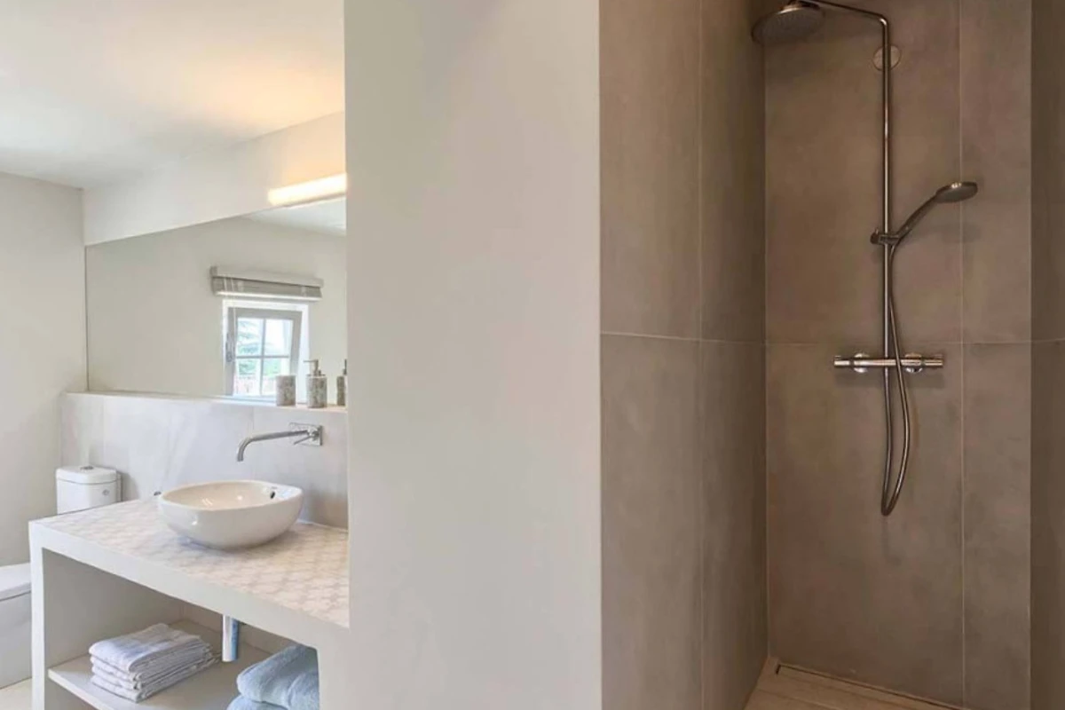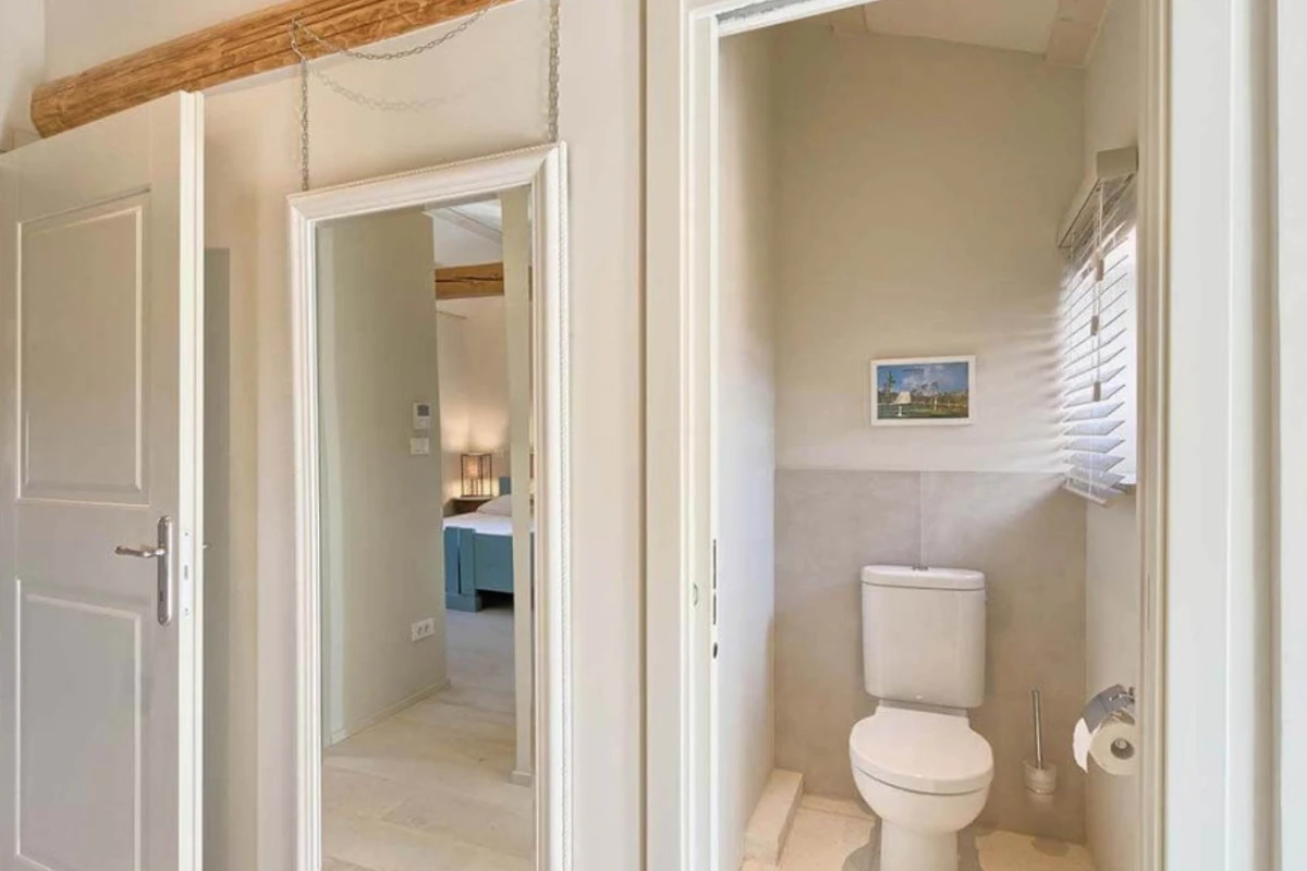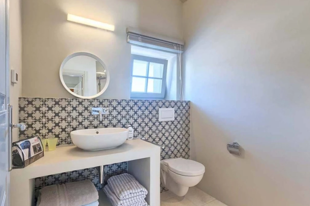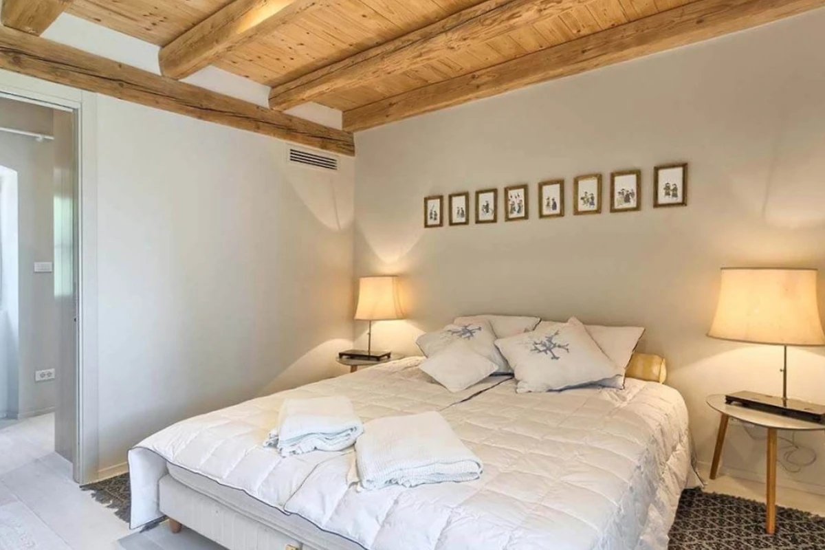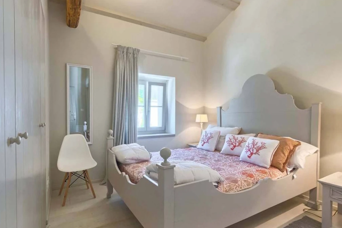 Das Haupthaus empfängt Sie mit einer Kombination aus Stein, Holz und minimalistischer, moderner Einrichtung, ebenso wie die anderen Wohneinheiten. Helle Farben dominieren in allen Zimmern und schaffen eine entspannte Atmosphäre mit Blick auf das Grün aus den Fenstern. Alle Räume sind mit einer Fussbodenheizung ausgestattet, die zum allgemeinen Komfort beiträgt. Im Erdgeschoss befindet sich eine voll ausgestattete moderne Küche mit Induktionskochfeld und einem hellen Essbereich. Ausserdem gibt es im Erdgeschoss ein Gästebad. Im ersten Stock gibt es zwei Wohnzimmer - eines mit Flügeltüren, die direkt auf die Terrasse mit Meerblick führen, und das andere mit einem modernen Kamin für Gäste. Das Haupthaus bietet Platz für 7 Gäste und verfügt über 3 elegante Doppelschlafzimmer mit eigenem Bad und 1 Einzelzimmer. Die modernen Bäder sind mit Toilettenartikeln und Haartrocknern ausgestattet.