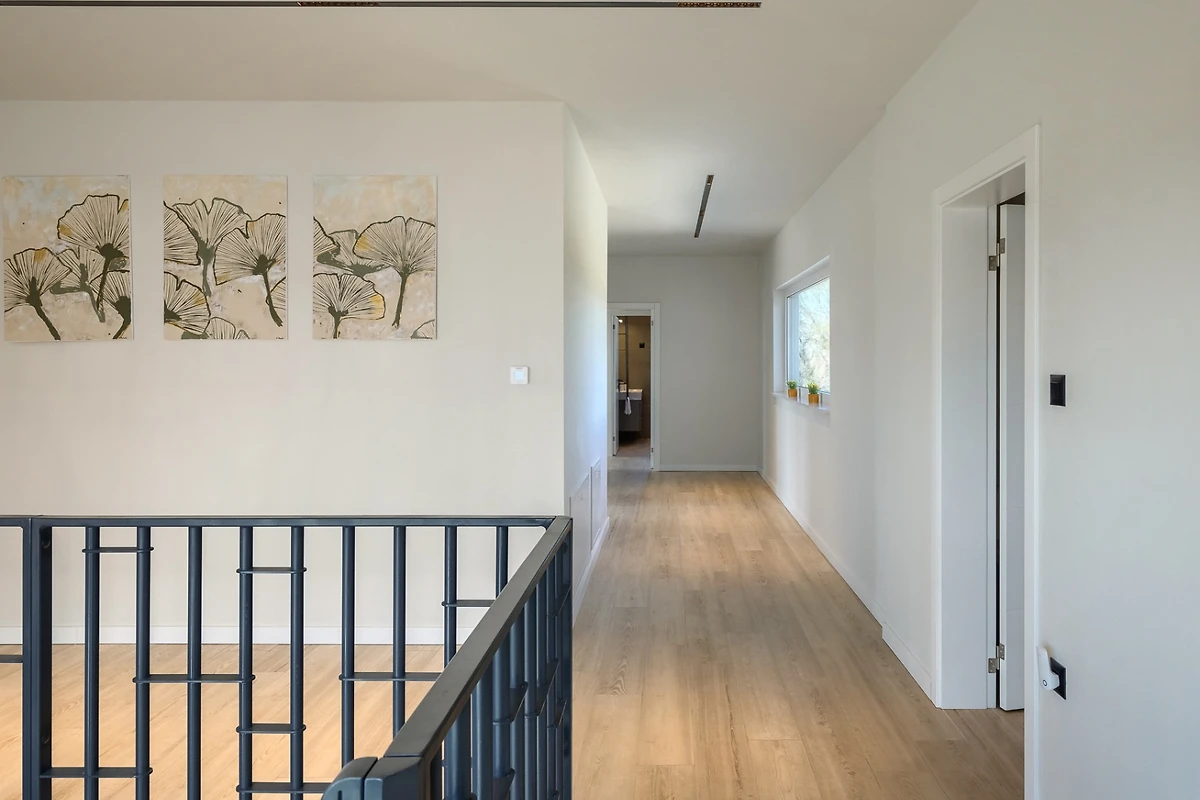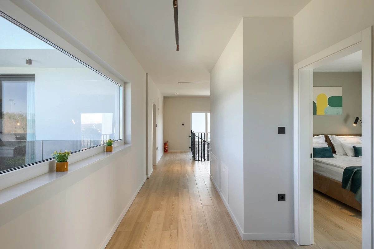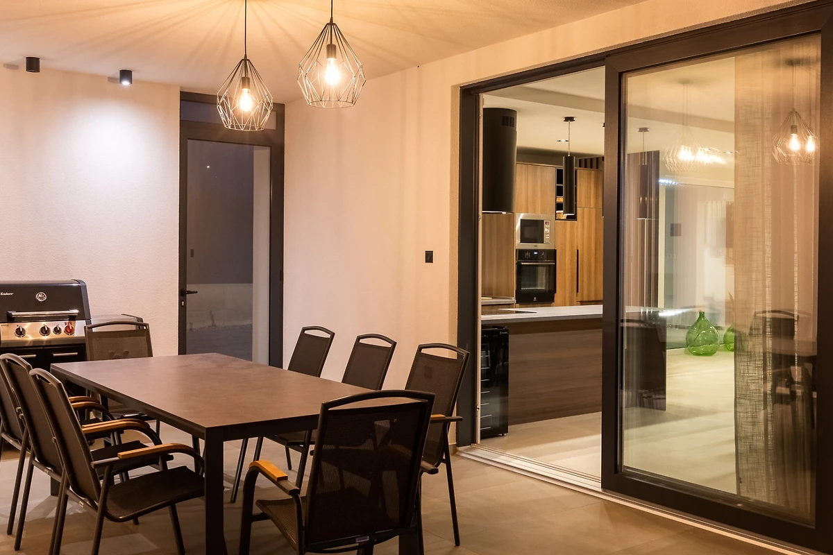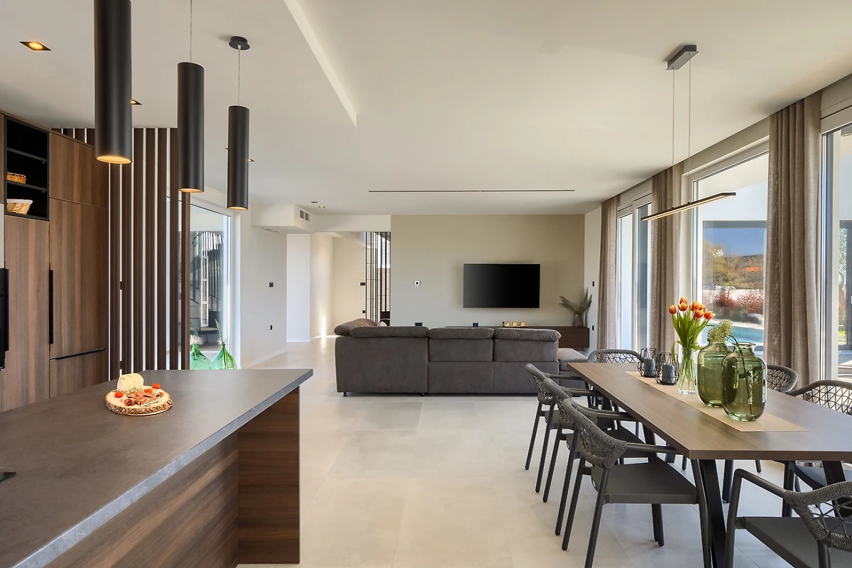 Die Villa umfasst eine Fläche von 270 m² und besteht aus einem Erdgeschoss und einem Obergeschoss. Das Erdgeschoss zeichnet sich durch einen offenen Grundriss aus, in dem Sie ein Wohnzimmer und eine voll ausgestattete Küche mit einem Esszimmer finden. Das Wohnzimmer ist mit einem grossen Sofa und einem Fernseher ausgestattet, und der Esstisch mit 8 Stühlen ist ideal zum Entspannen und Unterhalten. Die Küche ist mit allen notwendigen Geräten ausgestattet, um köstliche Mahlzeiten zuzubereiten, die sowohl am Esstisch im Haus als auch am Esstisch im Freien genossen werden können. Neutrale Farben in Erdtönen, kombiniert mit dunklen Metallelementen, dominieren den Raum. Alle Räume sind klimatisiert und für die kälteren Tage gibt es Fussboden- und Zentralheizung.