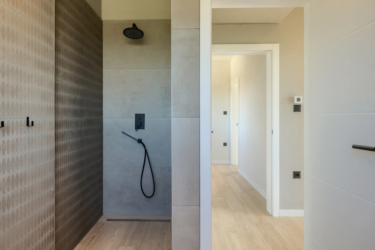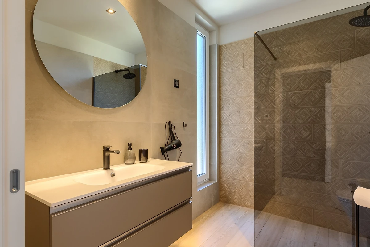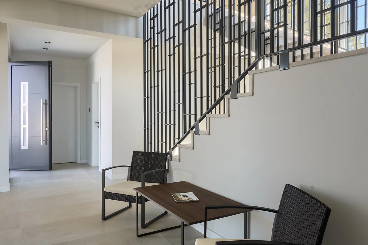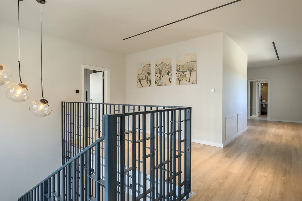 Die Villa umfasst eine Fläche von 270 m² und besteht aus einem Erdgeschoss und einem Obergeschoss. Das Erdgeschoss zeichnet sich durch einen offenen Grundriss aus, in dem Sie ein Wohnzimmer und eine voll ausgestattete Küche mit einem Esszimmer finden. Das Wohnzimmer ist mit einem grossen Sofa und einem Fernseher ausgestattet, und der Esstisch mit 8 Stühlen ist ideal zum Entspannen und Unterhalten. Die Küche ist mit allen notwendigen Geräten ausgestattet, um köstliche Mahlzeiten zuzubereiten, die sowohl am Esstisch im Haus als auch am Esstisch im Freien genossen werden können. Neutrale Farben in Erdtönen, kombiniert mit dunklen Metallelementen, dominieren den Raum. Alle Räume sind klimatisiert und für die kälteren Tage gibt es Fussboden- und Zentralheizung.