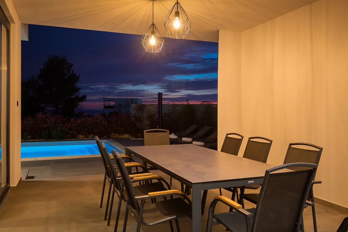 Neben der modernen Einrichtung bietet die Villa Tonka auch einen wunderschön angelegten Garten von 800 m². In der Mitte des Gartens befindet sich ein beheizter Salzwasser-Swimmingpool mit 8 Liegestühlen zum Sonnenbaden und Entspannen, und vor der Villa gibt es eine überdachte Aussenterrasse mit einem Grillplatz. Wir sind sicher, dass der Aussenbereich an Sommerabenden ein beliebter Treffpunkt sein wird, da er einen magischen Blick auf den Sonnenuntergang bietet. Das Grundstück ist komplett eingezäunt, um ein Maximum an Privatsphäre zu gewährleisten, und es gibt auch einen privaten Parkplatz für 2 Autos.