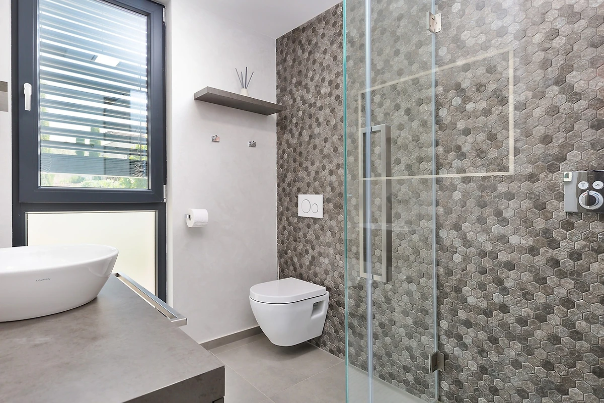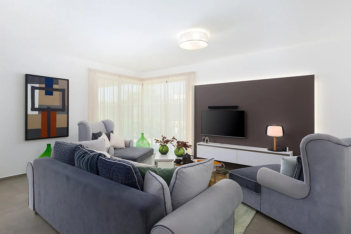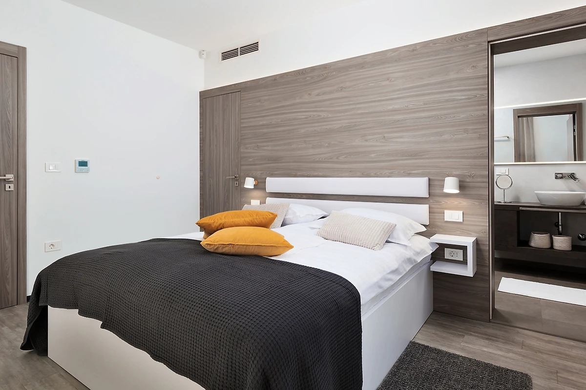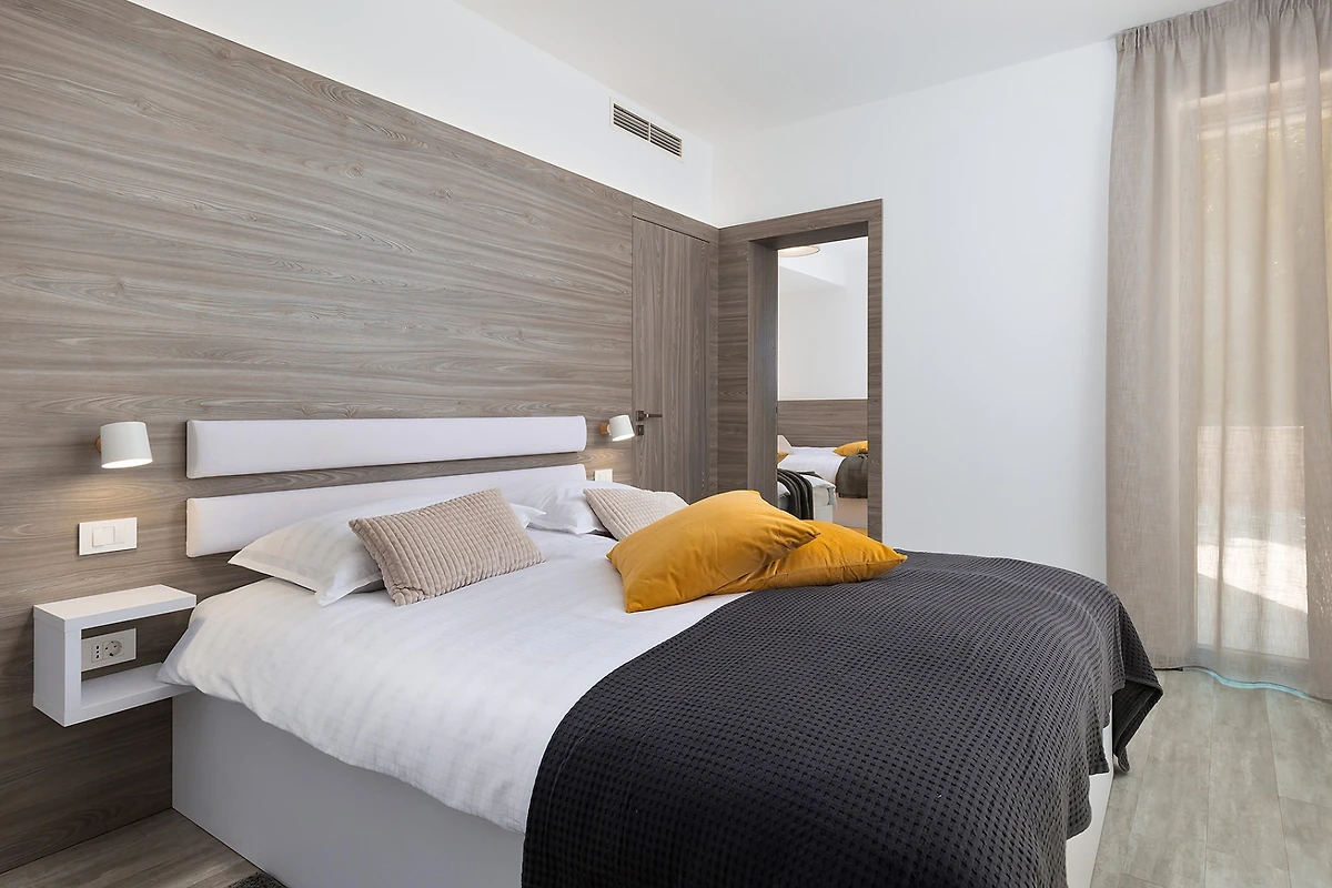 Die Schlafzimmer sind so angeordnet, dass sich 3 Zimmer im Erdgeschoss und 3 im ersten Stock befinden. Jedes Zimmer verfügt über eine Klimaanlage und einen Fernseher für maximalen Komfort. Alle Zimmer sind mit Doppelbetten ausgestattet, mit Ausnahme eines Zimmers mit 2 Einzelbetten. Die Zimmer sind in neutralen Farben und Weiss gehalten, was zusammen mit den modernen, minimalistischen Möbeln eine ideale Atmosphäre für die Entspannung am Ende des Tages schafft. Vom ersten Stock aus können Sie den Sonnenuntergang in aller Ruhe geniessen - 2 Zimmer haben einen eigenen Balkon. Die Villa besteht aus fünf Schlafzimmern, jedes mit eigenem Bad, ausgestattet mit einer begehbaren Dusche und beruhigendem grau-weissem Dekor. Alle sechs Bäder der Villa sind mit einem Haartrockner ausgestattet.