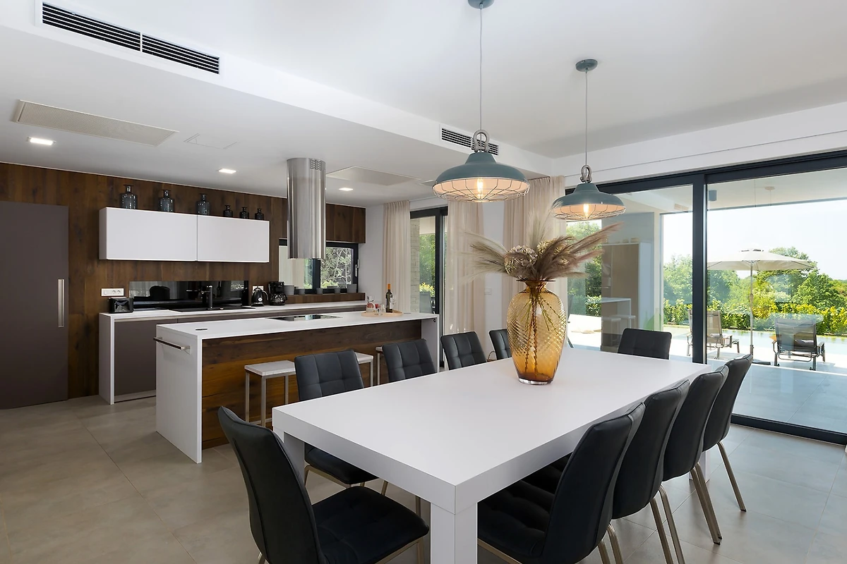 Im Erdgeschoss befindet sich ein heller und offener Wohnbereich mit Wohnzimmer, Küche und Esszimmer. Der Raum wird durch grosse Glaswände erhellt, die auf die Terrasse und den Pool mit herrlichem Gartenblick führen. Die modernen Möbel und die schlichte Einrichtung unterstreichen den anspruchsvollen Stil, während die neutralen Farben dem Raum Wärme verleihen. Im Wohnzimmer finden Sie ein bequemes Sofa und einen Smart-TV. Die Küche ist ebenfalls modern, voll ausgestattet und geschmackvoll eingerichtet. Die Kücheninsel ist ideal für die Zubereitung des Frühstücks und der grosse Esstisch eignet sich perfekt für gemeinsame Mahlzeiten. Ausserdem ist ein Kinderhochstuhl für das jüngste Familienmitglied vorhanden.