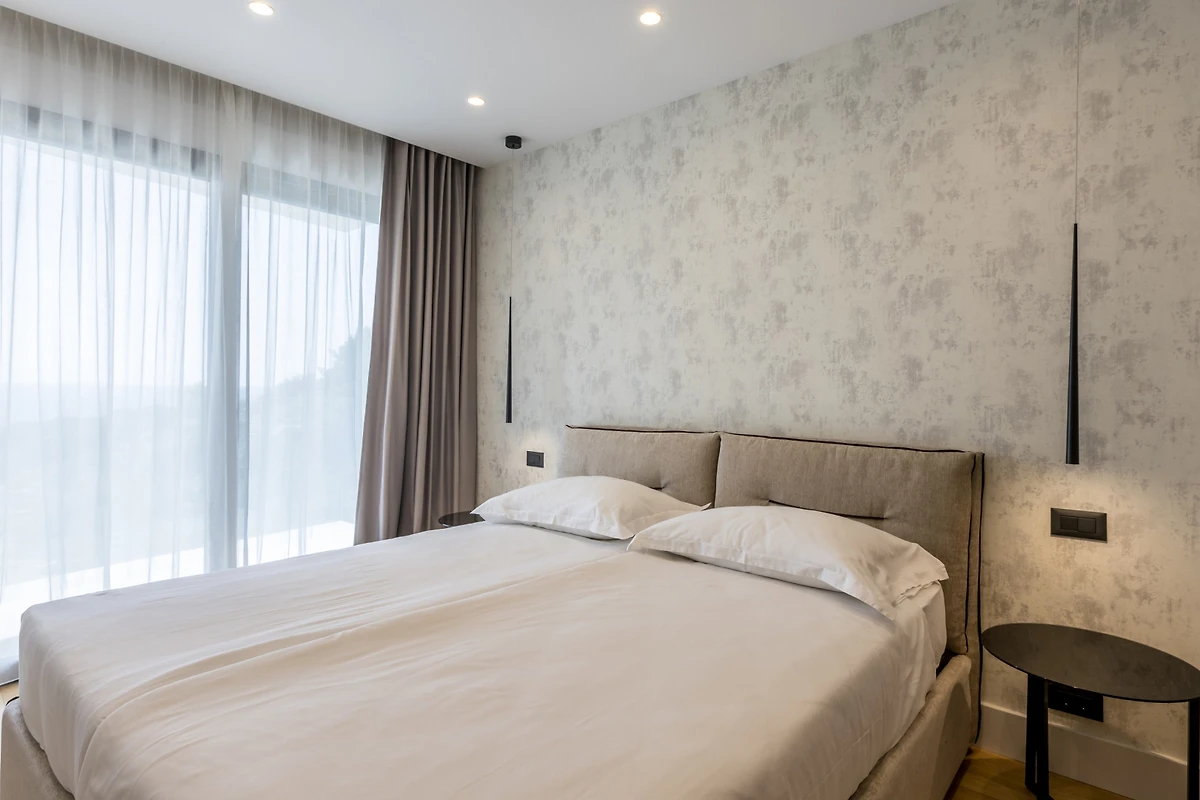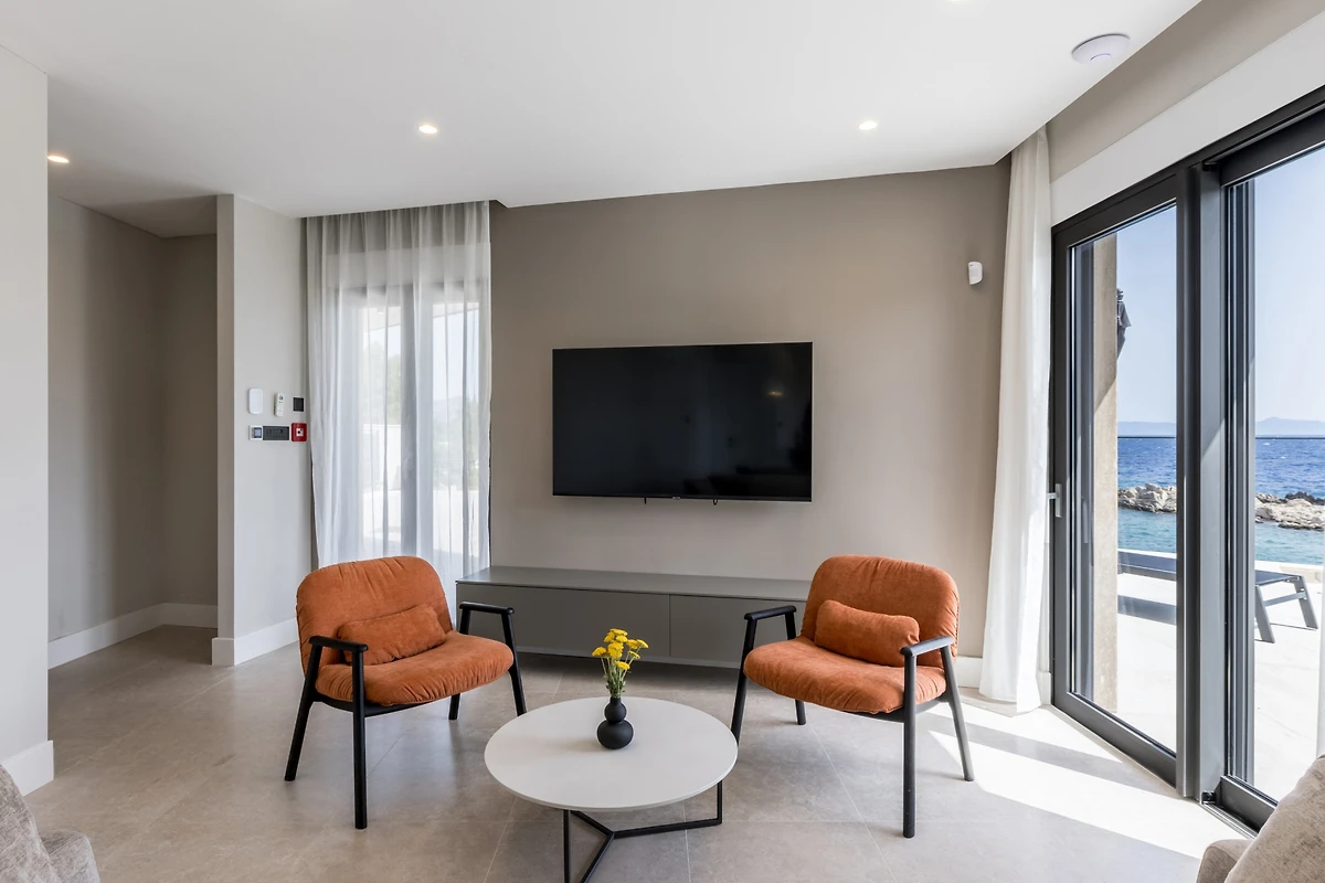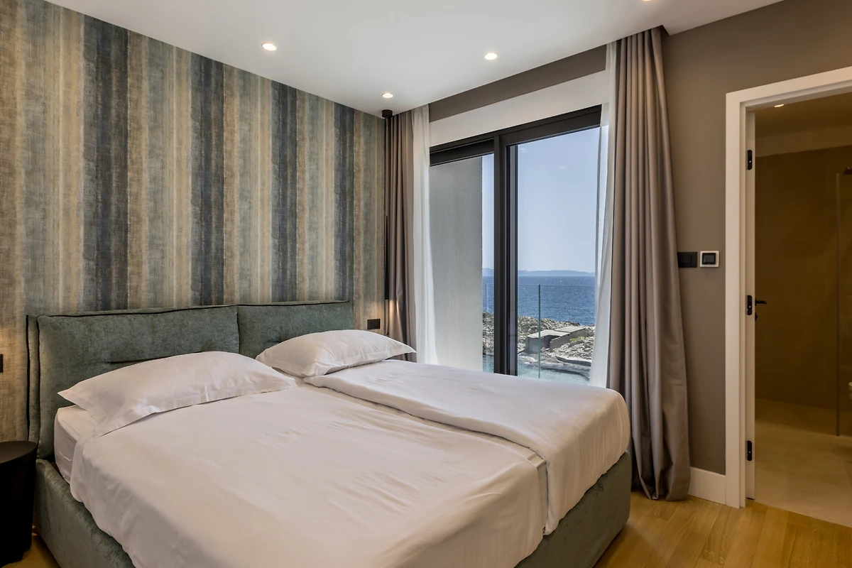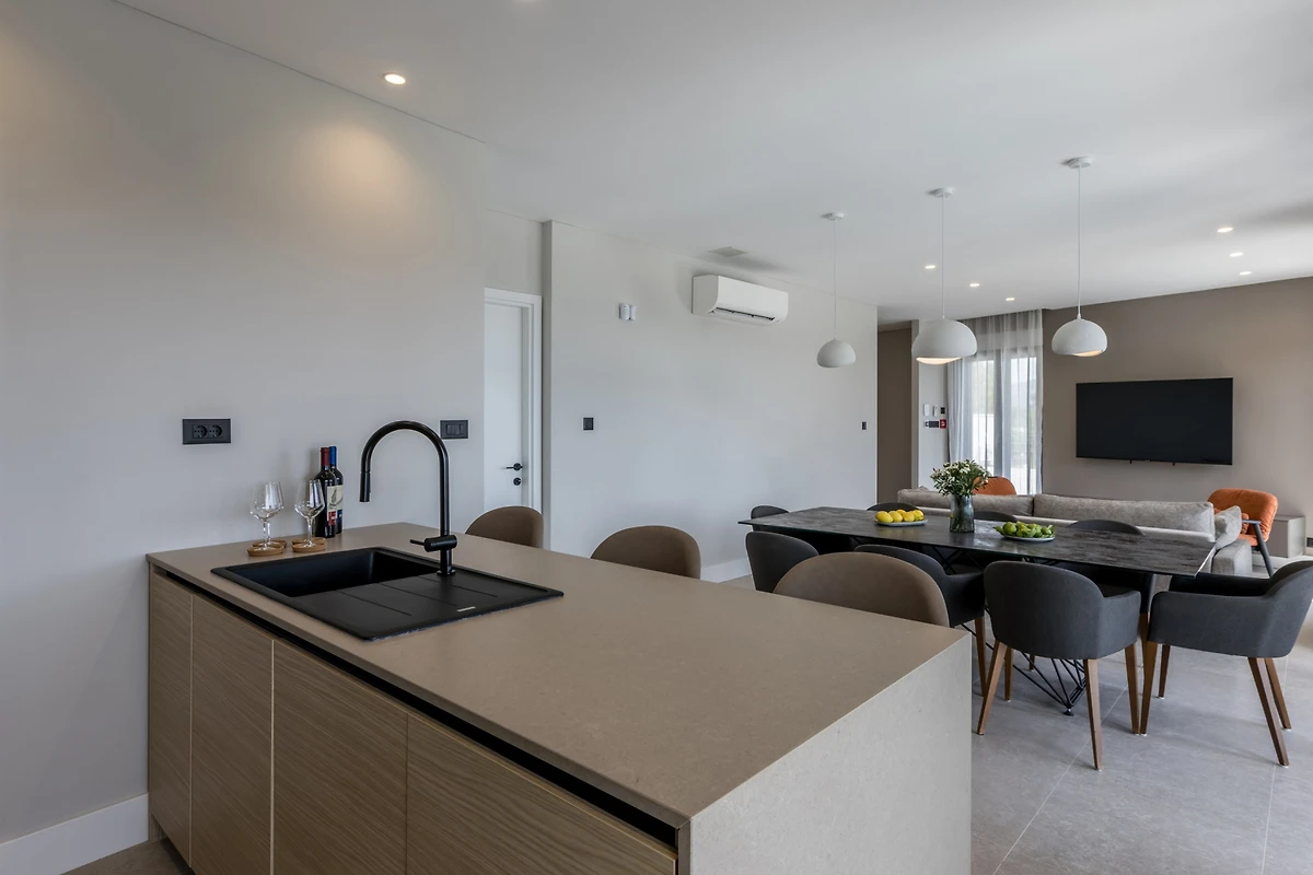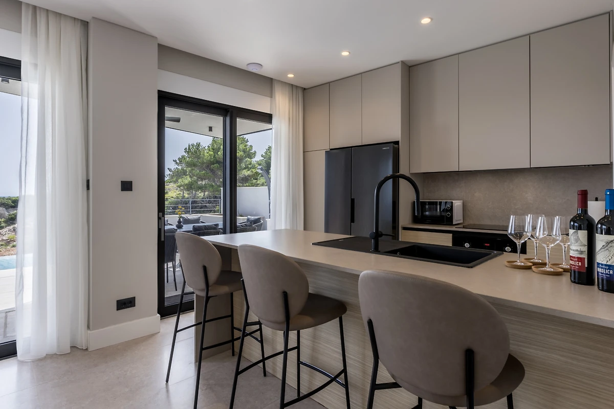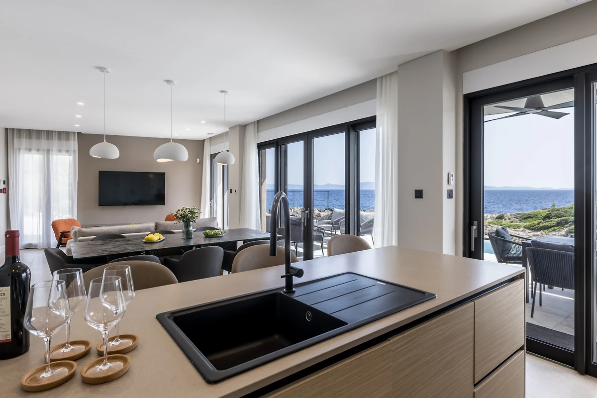 Das Innere der Villa Luca ist 226 m² gross und besteht aus 2 Etagen. Im Erdgeschoss befindet sich ein grosser, heller, offener Raum, bestehend aus einer voll ausgestatteten Küche mit einer grossen Insel, einem Esszimmer mit 8 Sitzplätzen und einem Wohnzimmer mit TV. Der Raum ist komplett zum Meer hin ausgerichtet, um die Aussicht optimal zu nutzen, und zahlreiche Balkontüren schaffen die Illusion einer Verbindung zwischen Innen und Aussen. Wir glauben, dass das Kochen und Entspannen in einem solchen Raum ein wahres Vergnügen sein wird, und was auch immer Sie tun, Sie werden in der Lage sein, Ihre Augen auf das Schönste zu richten - die blaue Adria.