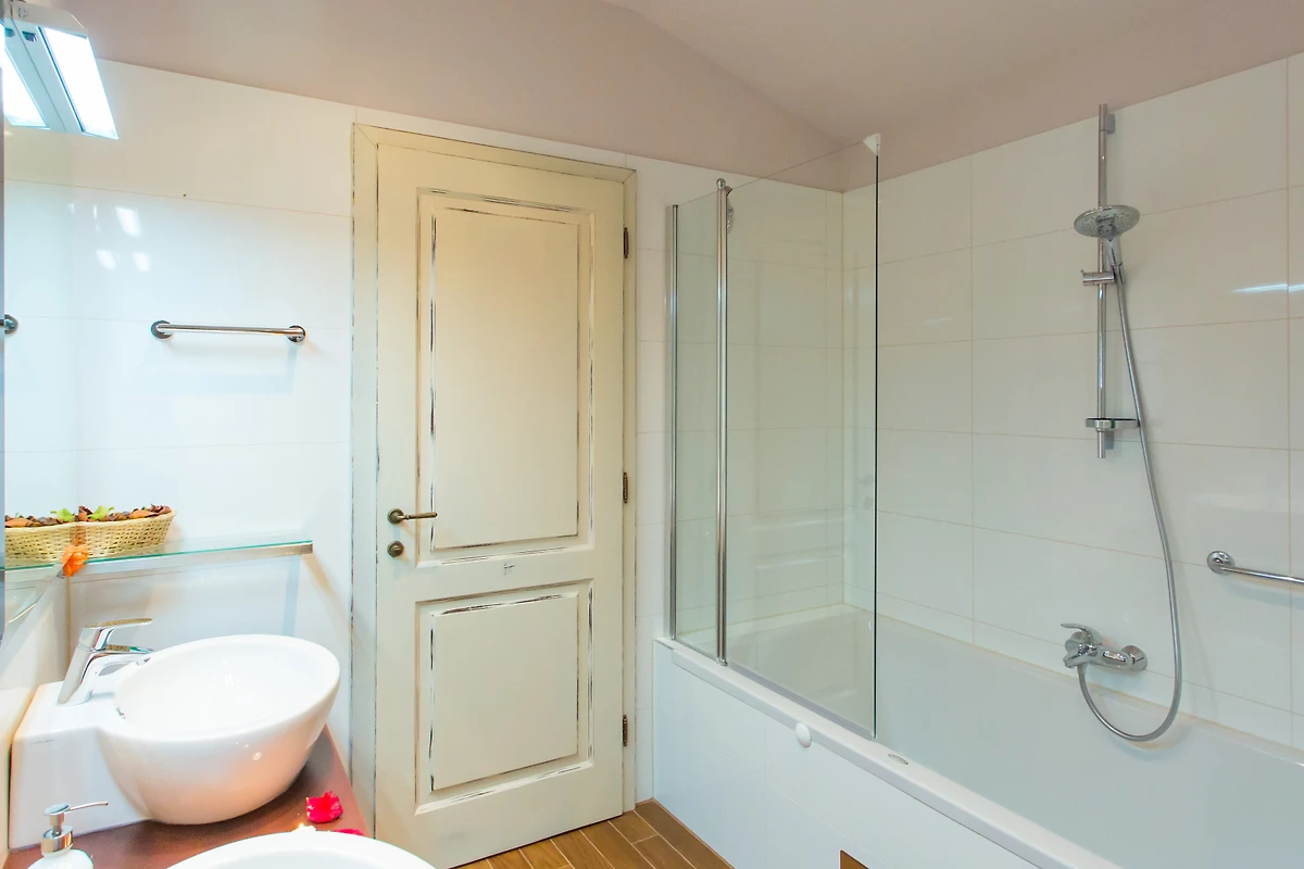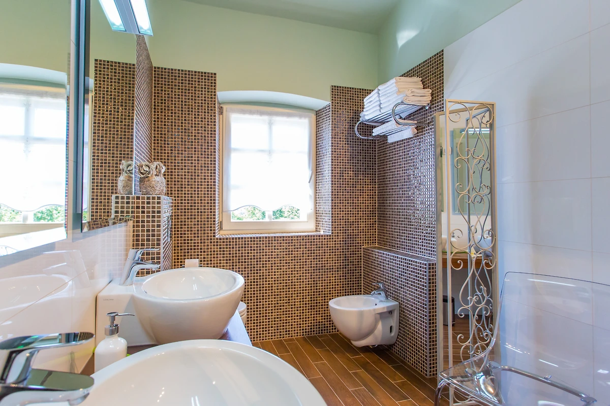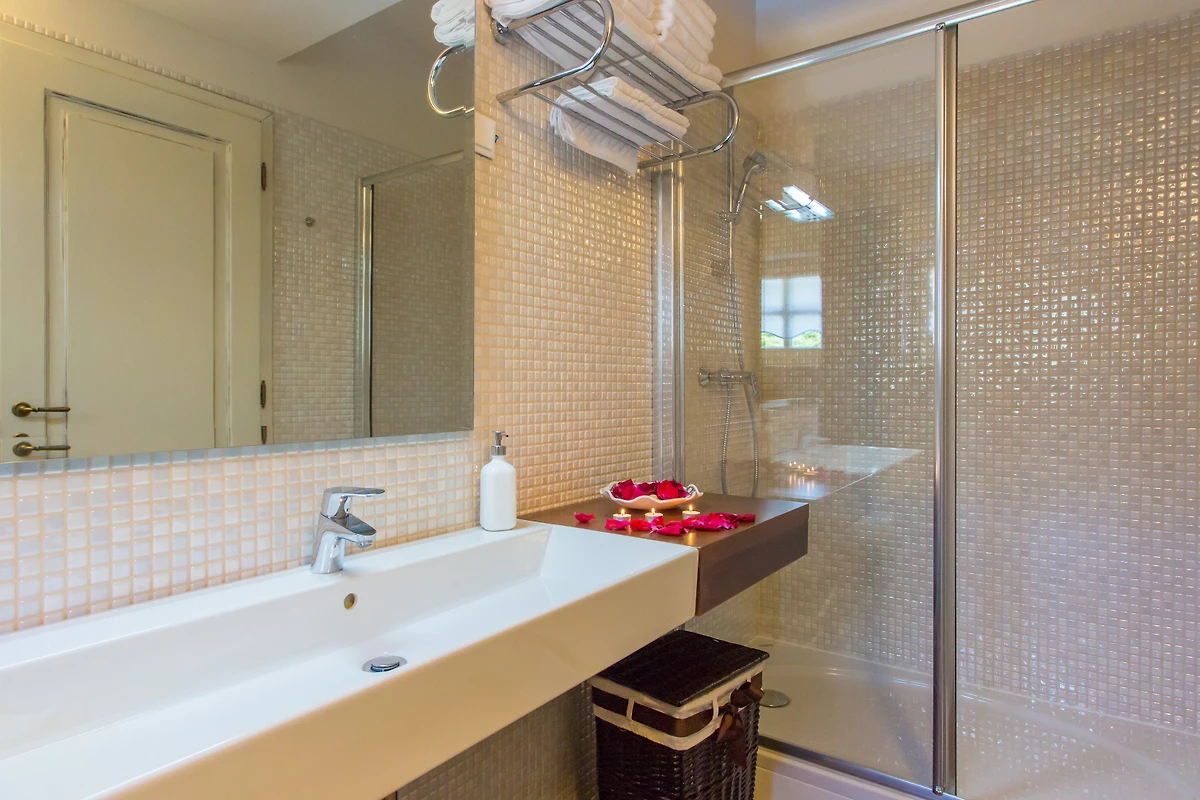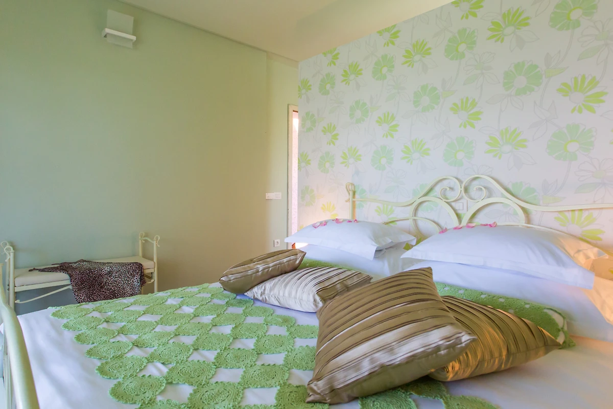Die Villa verfügt über 5 Schlafzimmer und 4 Bäder plus ein Gäste-WC. 1 Schlafzimmer mit Bad befindet sich im Erdgeschoss, die anderen 4 befinden sich im 1. Jedes Schlafzimmer ist auf seine eigene Art und Weise spezifisch, von der Farbe der Wände über die Tapete bis hin zur Dekoration. 3 haben ein Doppelbett, 2 haben 2 Einzelbetten, von denen eines ein Etagenbett ist. Dank der französischen Fenster haben alle Zimmer viel natürliches Licht, und das Zimmer im Erdgeschoss hat Zugang zu einer kleinen Terrasse mit Sitzgelegenheit - ideal, um den Morgenkaffee in aller Ruhe zu geniessen. Die Bäder sind modern und mit Handtüchern, Haartrockner und Toilettenartikeln ausgestattet.