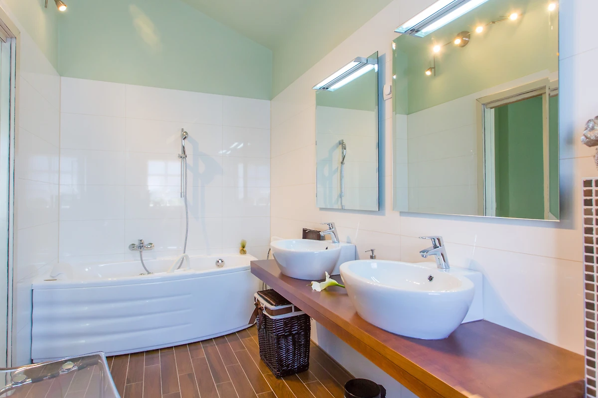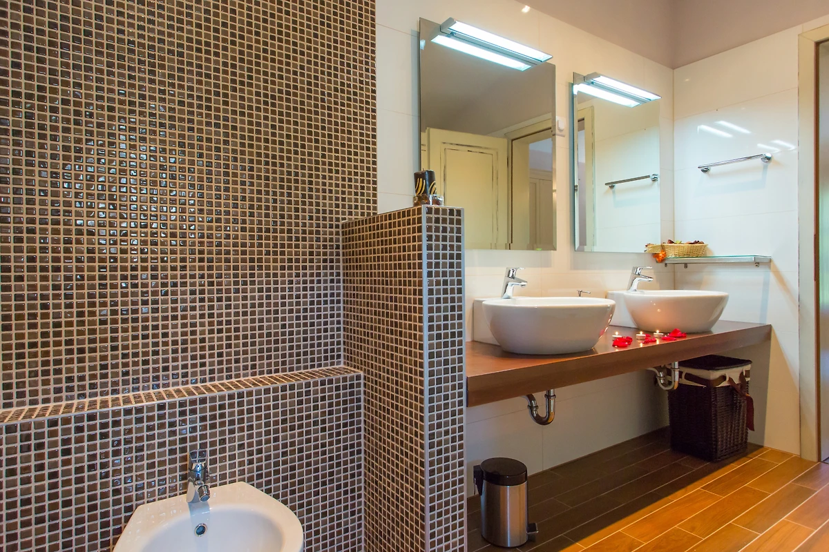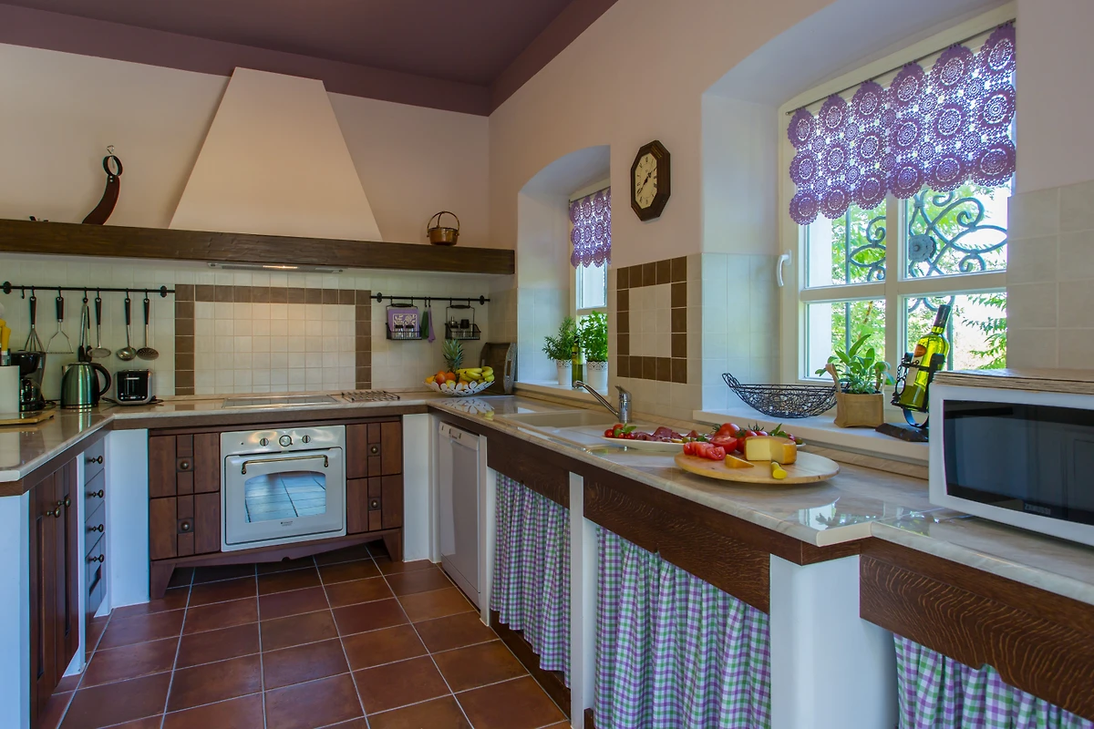 Die Villa ist 200 m² gross und besteht aus 2 Etagen - Erdgeschoss und Obergeschoss. Im Erdgeschoss gibt es ein Wohnzimmer mit einem offenen Kamin und sogar 2 Essbereiche. In einem separaten Raum befindet sich eine grosse Eckküche, die mit allen Geräten ausgestattet ist, die Sie für die Zubereitung einer Mahlzeit benötigen. Jedes Zimmer hat Flügeltüren, die auf die Aussenterrasse führen. Im Erdgeschoss ist die Einrichtung im rustikalen Stil gehalten, sowohl die Möbel als auch die Dekoration, was zur Schönheit und Einzigartigkeit des Raumes beiträgt. Wir glauben, dass der Aufenthalt an einem solchen Ort ein wahres Vergnügen sein wird und vielleicht als Inspiration für die Einrichtung Ihres eigenen Raumes dienen kann!
