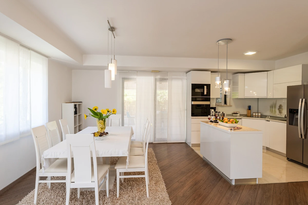 Das Herzstück des Hauses ist die amerikanische Küche, ausgestattet mit hochwertigen Geräten, darunter ein Induktionsherd, Kühlschrank, Gefrierschrank, Geschirrspüler, Backofen, Mikrowelle, Kaffeemaschine und Toaster. Vollständig bestückt mit Küchenutensilien und Geschirr ist sie perfekt zum Zubereiten von Familienmahlzeiten und zum Schaffen bleibender Erinnerungen.