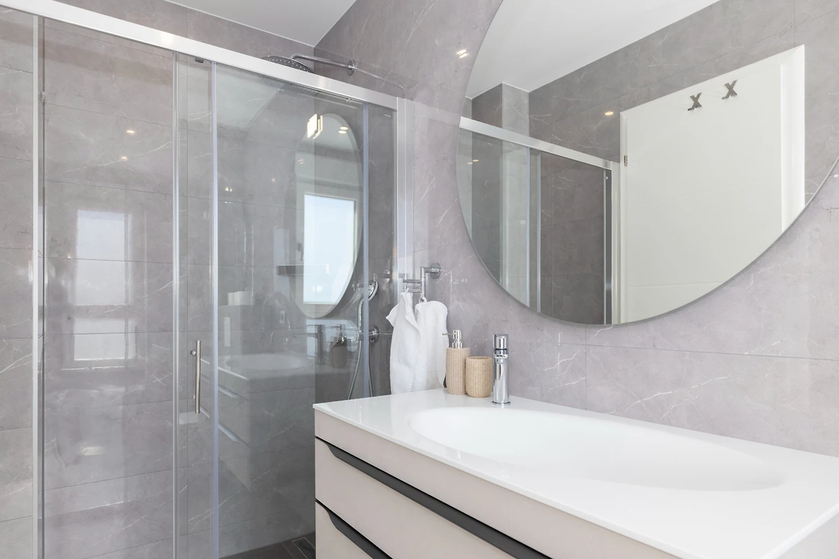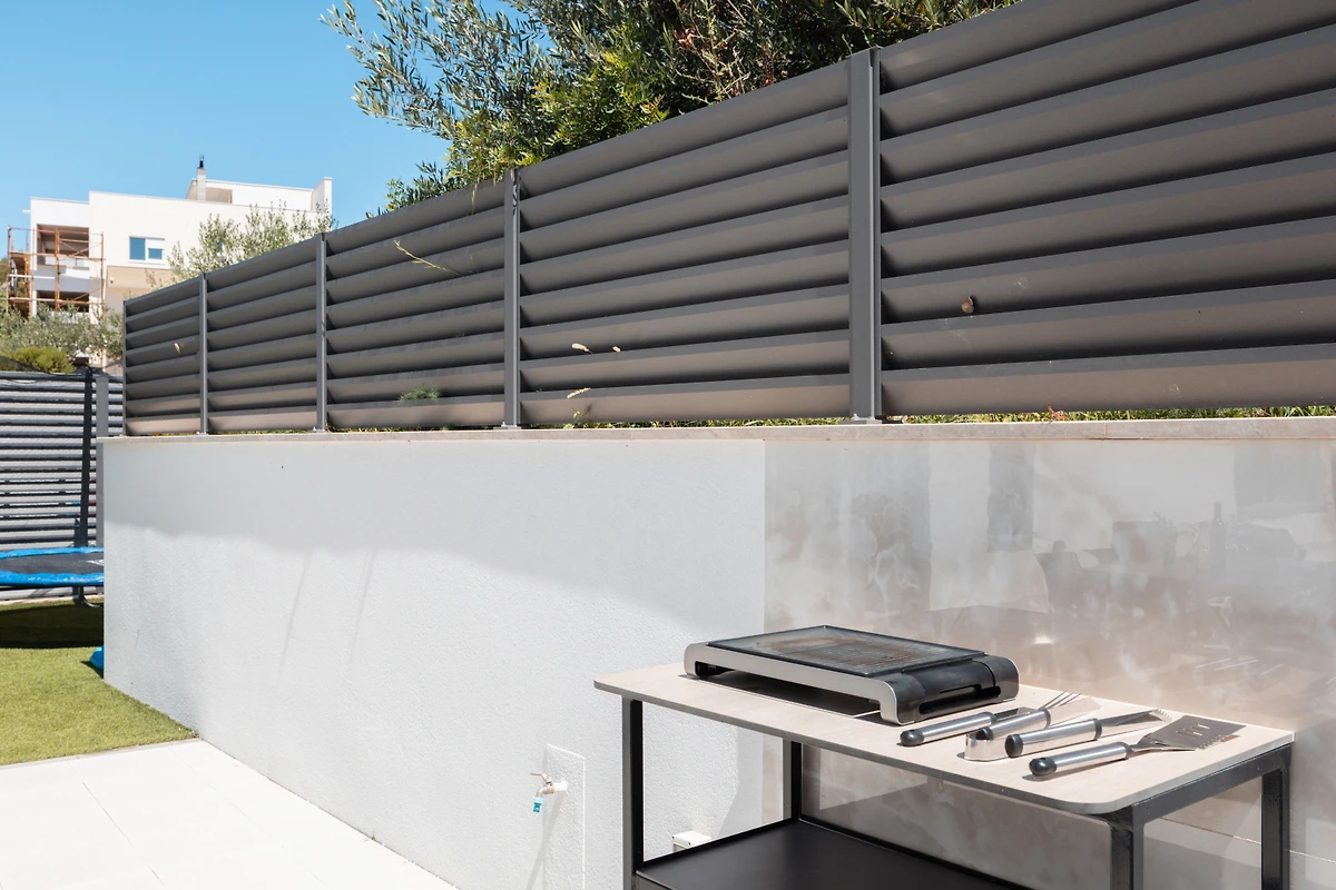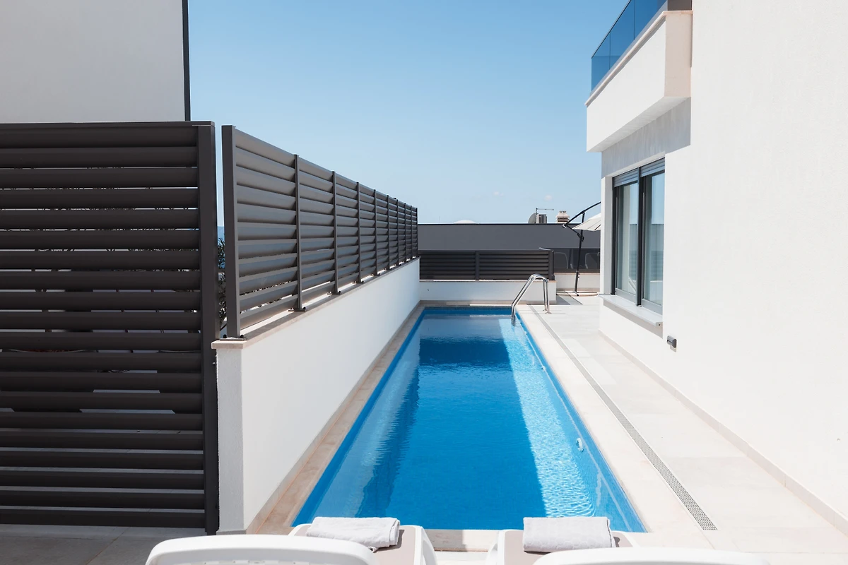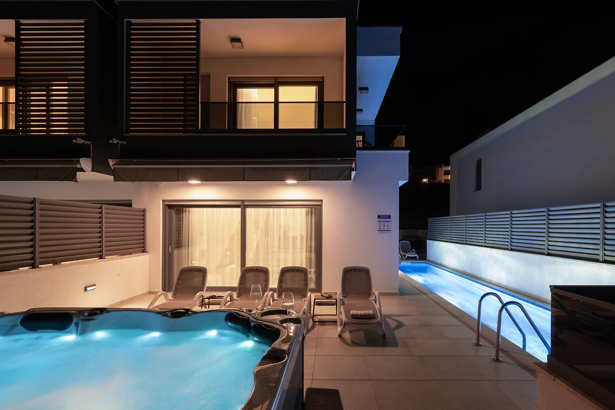 Entdecken Sie eine moderne und wunderschöne Villa in einer charmanten Wohnanlage in Makarska, die einen aussergewöhnlichen Rückzugsort für Familien und Paare bietet, die einen luxuriösen Urlaub suchen. Diese geräumige 180 Quadratmeter grosse Immobilie bietet komfortable Unterbringung für bis zu 6 Gäste und verfügt über 3 Schlafzimmer mit Doppelbetten und 5 gut ausgestattete Badezimmer.
