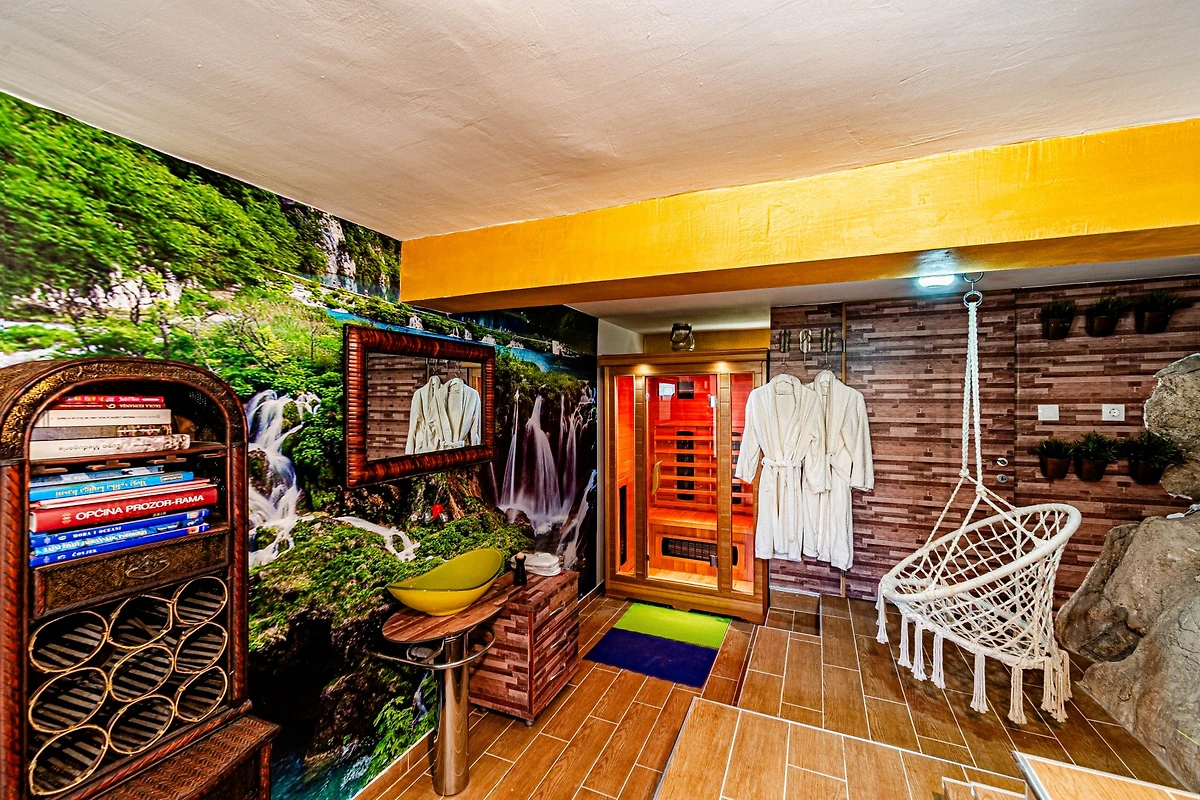 Geniessen Sie ultimative Entspannung mit privaten Annehmlichkeiten, darunter ein beheizter 4x8 Meter grosser Swimmingpool, Sauna, Spa und Whirlpool. Die Unterkunft bietet Klimaanlage, WLAN und Satellit-TV, um alle zu unterhalten. Draussen verfügt ein wunderschönes 500 Quadratmeter grosses Grundstück über einen eingezäunten Garten, Gartenmöbel, Grill und eine geräumige Terrasse, die perfekt für Outdoor-Dining und Entspannung ist.