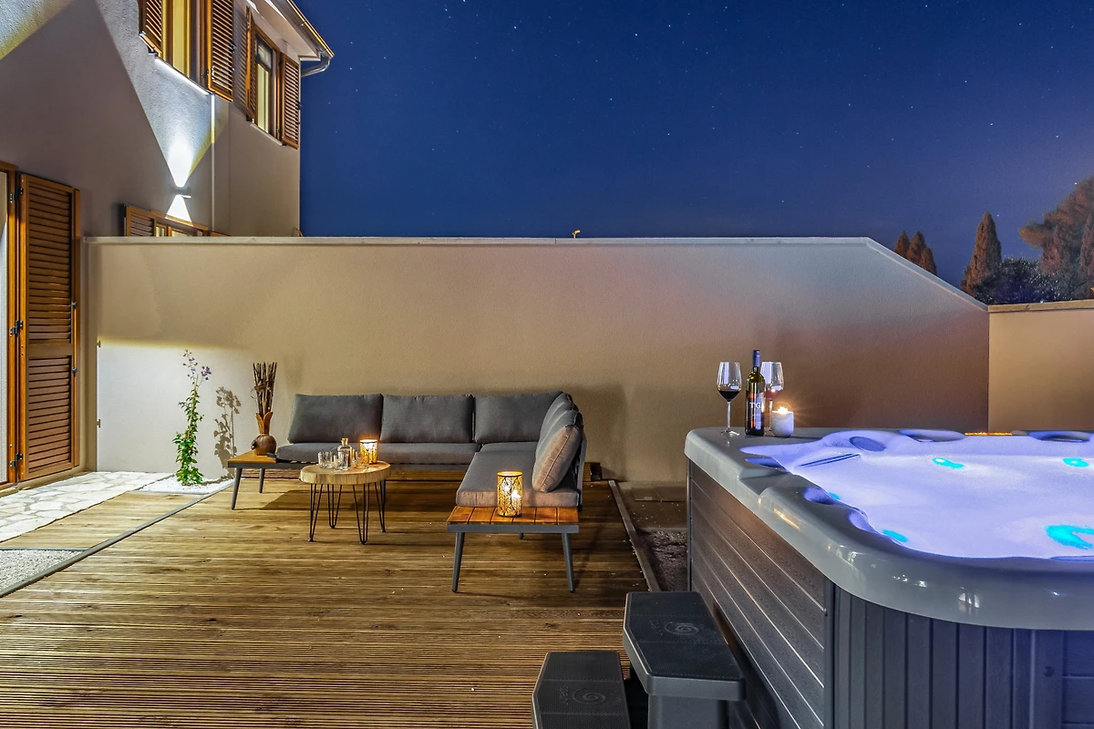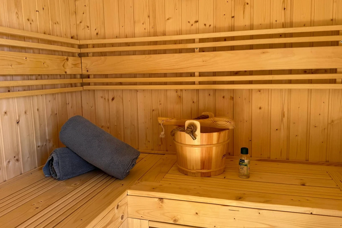 Entspannen Sie sich in der privaten Spa-Bereich der Villa, der eine Sauna, einen Whirlpool und einen atemberaubenden 3,5 x 7 Meter grossen Swimmingpool umfasst. Das Innere bietet zusätzlichen Komfort mit Klimaanlage, Wärmepumpenheizung und einem gemütlichen Kamin für kühlere Abende. Hochgeschwindigkeits-WLAN und Satellitenfernsehen sorgen dafür, dass Sie verbunden und unterhalten bleiben.