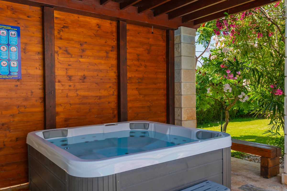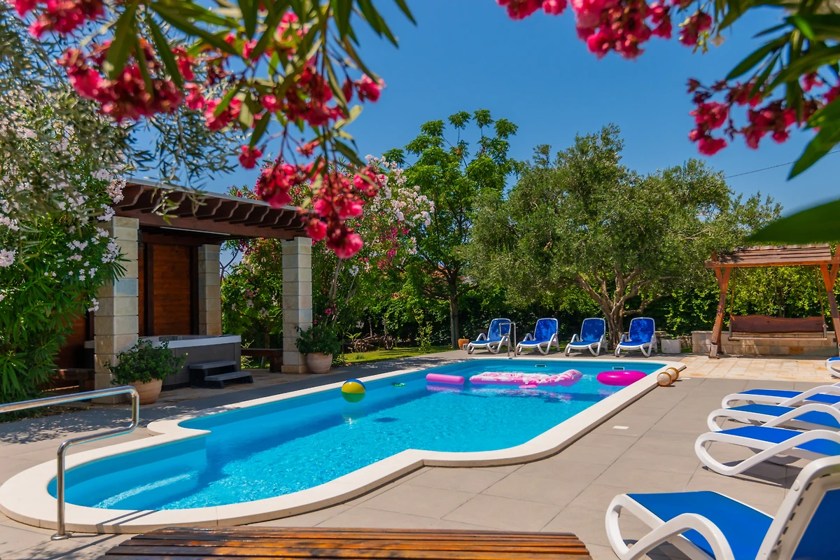 Naturliebhaber werden den privaten Swimmingpool mit einer Grösse von 11x4 Metern zu schätzen wissen, der perfekt für erfrischende Abkühlung und gemütliche Nachmittage ist. Die Villa verfügt über einen wunderschönen Garten, ein eingezäuntes Grundstück und eine Terrasse, die ideal für Mahlzeiten im Freien und Grillabende ist. Gäste können atemberaubende Ausblicke auf den Pool und die Gartenanlagen geniessen.