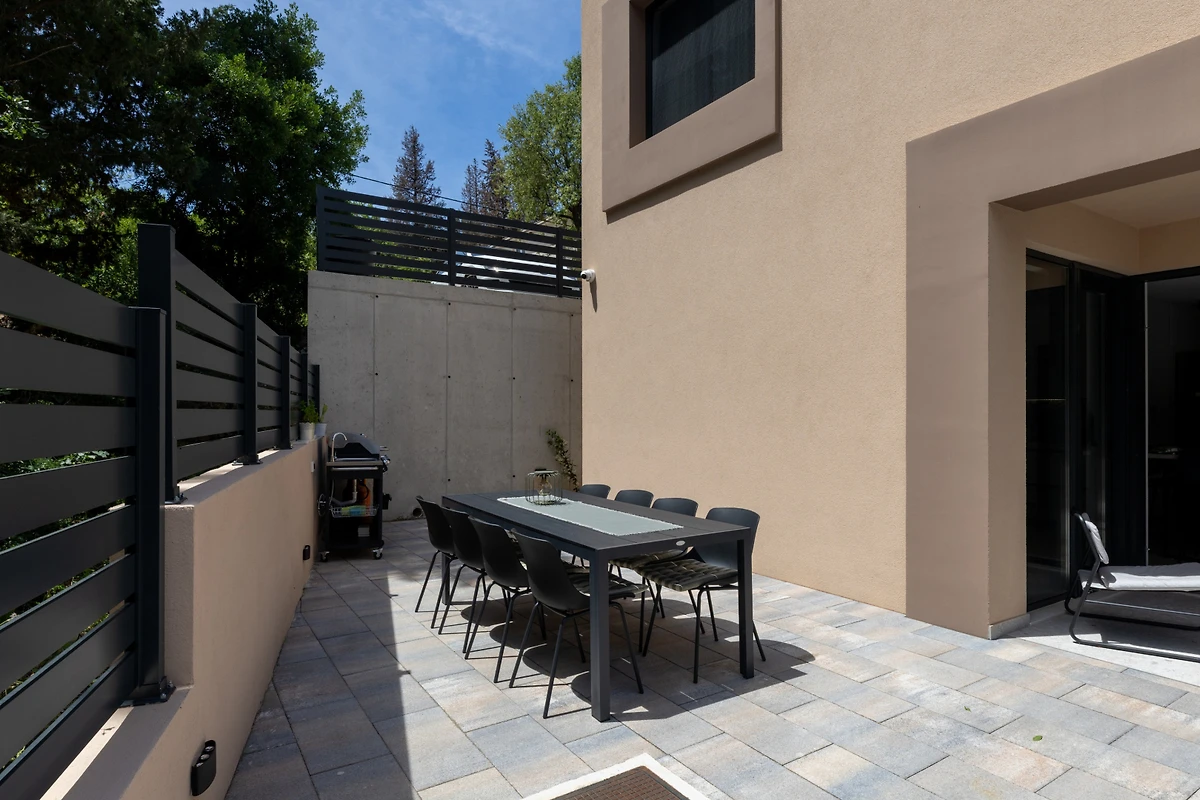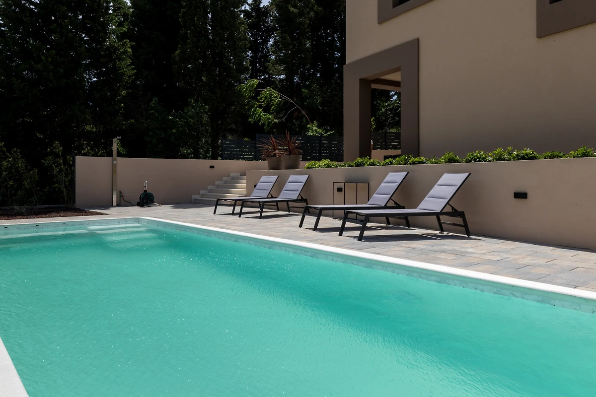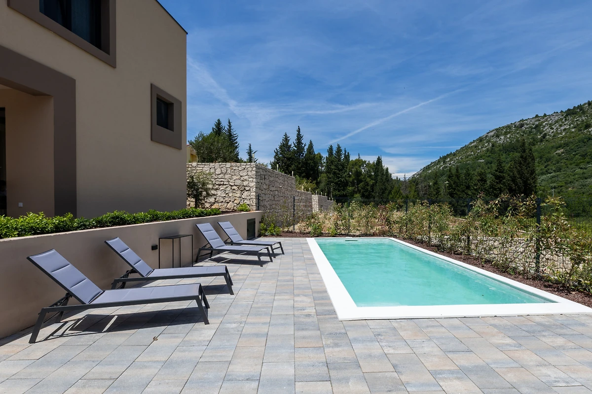 Draussen wartet ein privater 3x8 Meter grosser Swimmingpool, perfekt für erfrischende Abkühlung und Entspannung. Das 250 Quadratmeter grosse Grundstück verfügt über einen wunderschönen Garten mit Gartenmöbeln und einem Grillbereich, ideal zum Speisen im Freien und zum Geniessen der atemberaubenden Berge, des Pools und der Gartenaussicht. Zwei private Aussenparkplätze stehen für Ihre Fahrzeuge zur Verfügung.