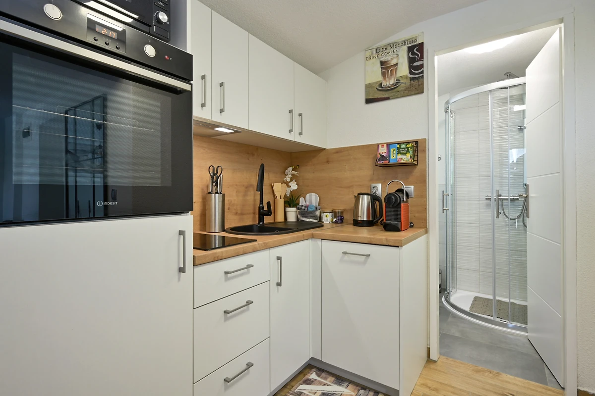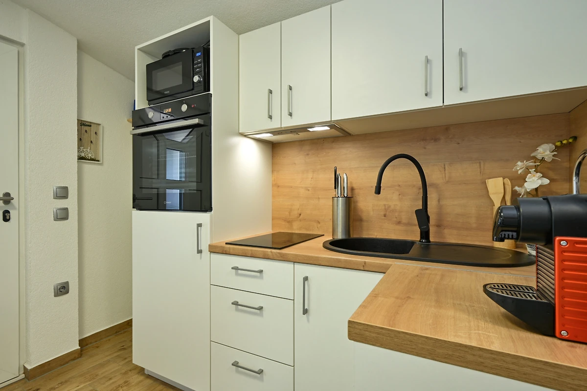 Die gut ausgestattete amerikanische Küche verfügt über Induktionskochen, eine umfassende Auswahl an Geräten, einschliesslich Kühlschrank, Gefrierschrank, Backofen, Mikrowelle, Geschirrspüler und Kaffeemaschine. Gäste können Mahlzeiten mit bereitgestelltem Küchengeschirr und Komfort zubereiten.
