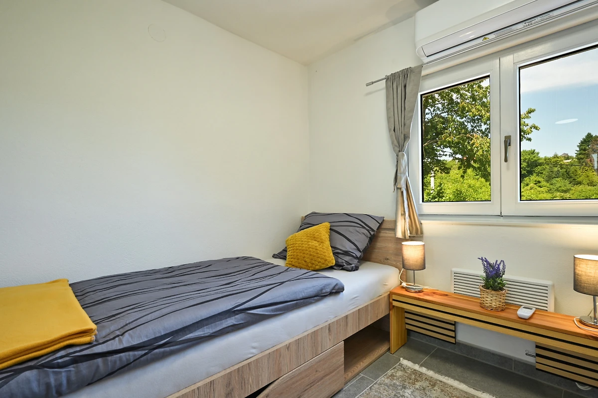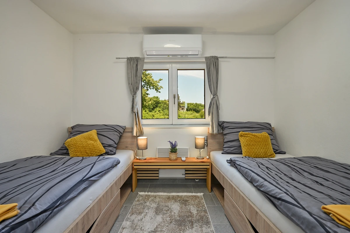 Diese entzückende Villa beherbergt bequem bis zu 5 Gäste mit 2 Schlafzimmern, die ein Kingsize-Bett und zwei Einzelbetten umfassen. Das geräumige Innere ist mit Blick auf Komfort und Zweckmässigkeit gestaltet und bietet moderne Annehmlichkeiten, um einen unvergesslichen Aufenthalt zu gewährleisten.
