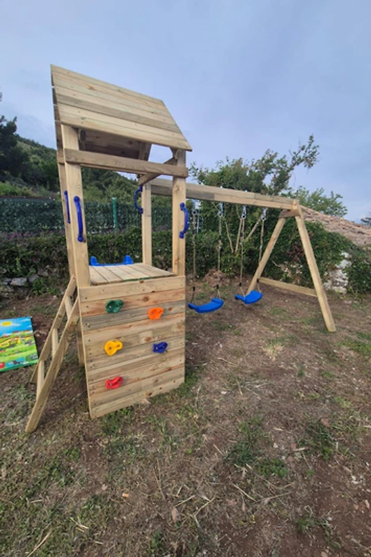Im Freien können Gäste im privaten Garten entspannen, der mit Gartenmöbeln und einem Grillbereich ausgestattet ist. Der Höhepunkt ist der private 3,5x6 Meter grosse Swimmingpool, der perfekt zum Abkühlen an warmen Tagen ist. Die Immobilie bietet atemberaubende Ausblicke auf Berge, den Pool und den umliegenden Garten und schafft so eine malerische Kulisse für Ihren Urlaub.