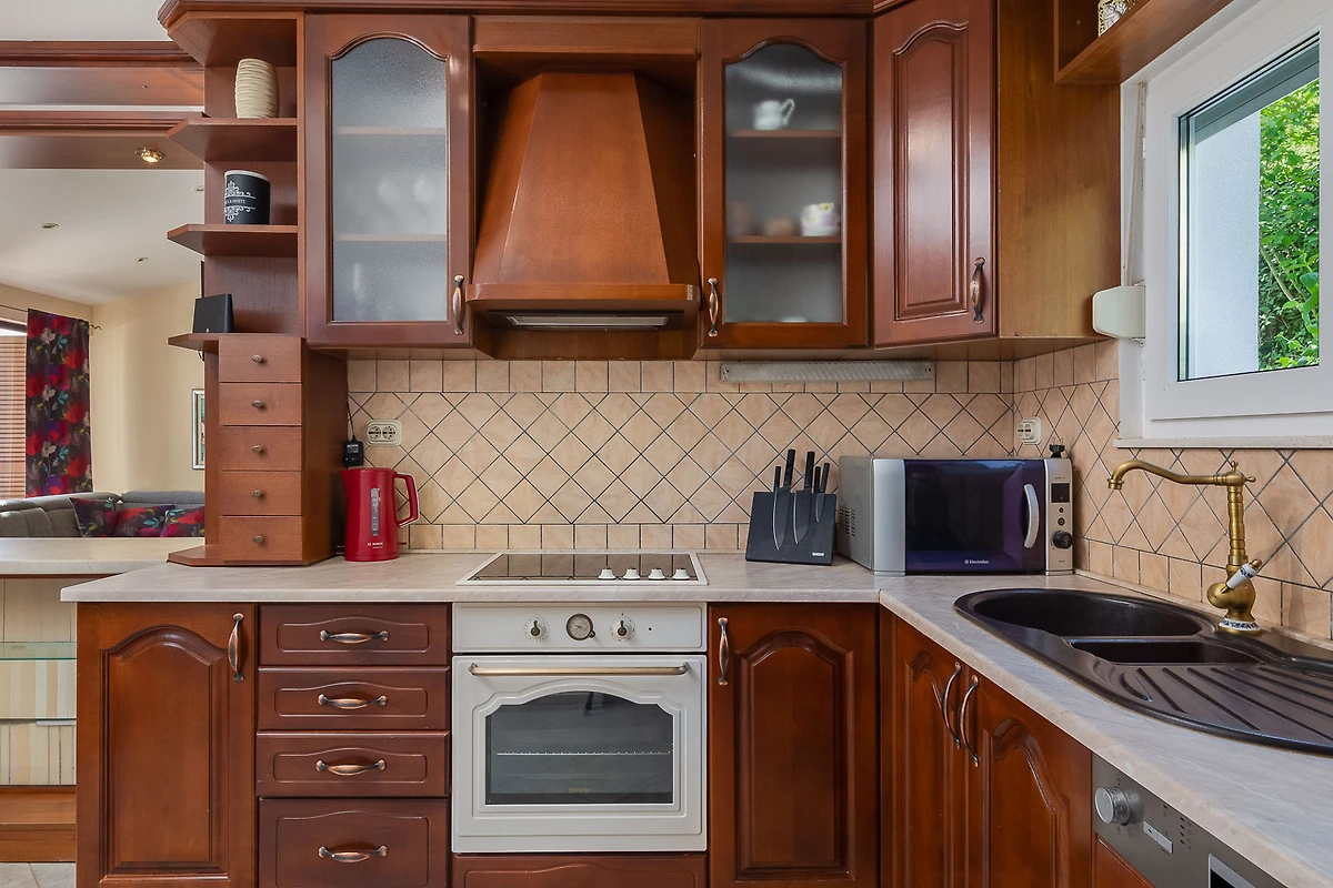 In der Glaskeramik-Kochplatte der offenen Küche sind Kühlschrank, Mikrowelle, Ofen, Gefrierschrank, Geschirrspüler, Geschirr/Besteck, Küchenutensilien, Kaffeemaschine und Toaster vorhanden.
