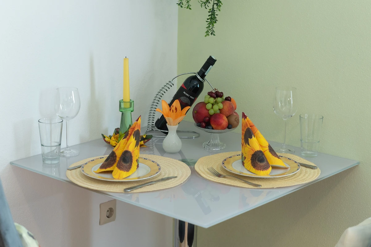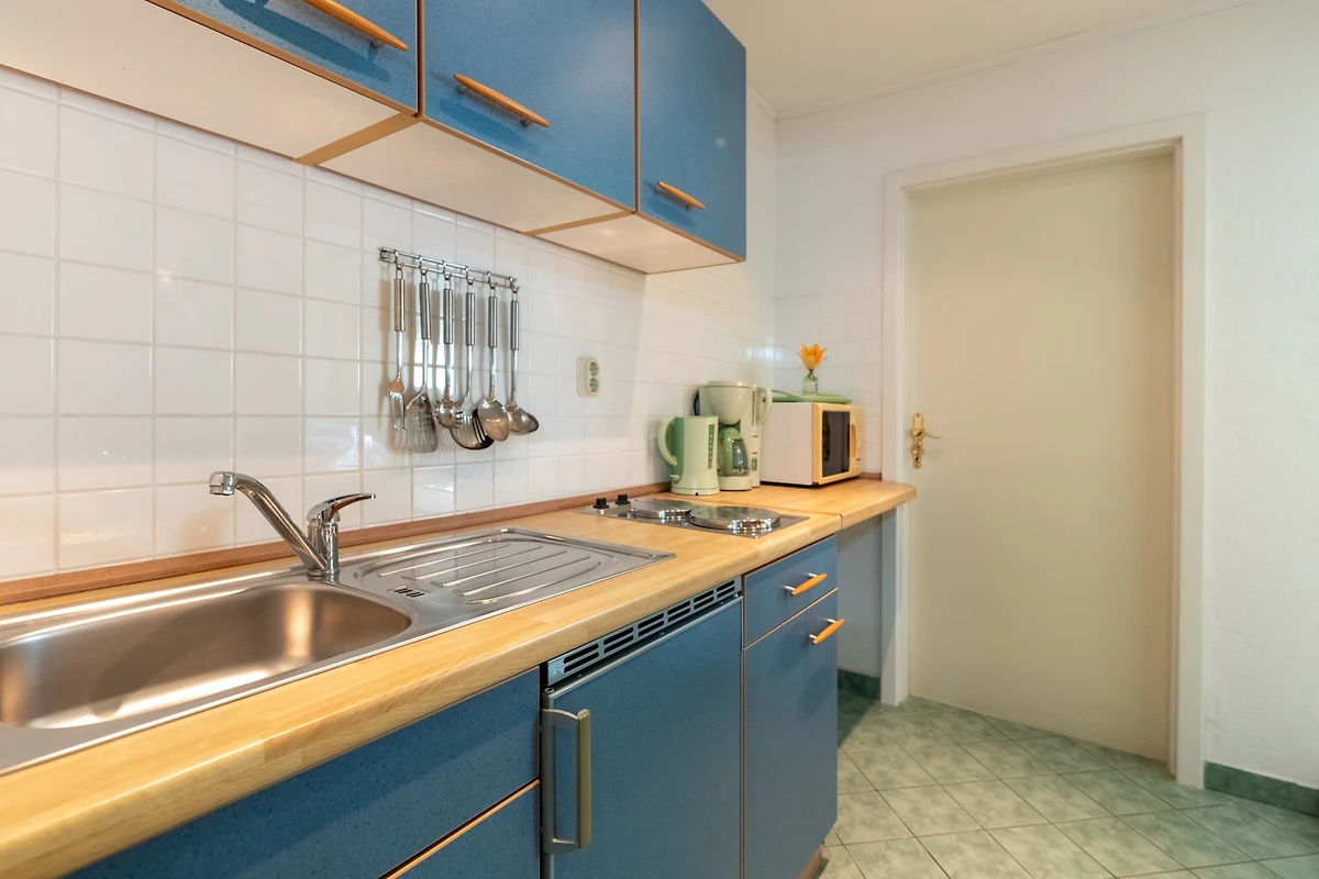 Die Wohnung verfügt über eine moderne amerikanische Küche, ausgestattet mit essentiellen Geräten, einschliesslich Kühlschrank, Waschmaschine, Kaffeemaschine, Mikrowelle und kompletter Küchenausstattung. Bleiben Sie mit kostenlosem WLAN verbunden und geniessen Sie Unterhaltung auf dem Satelliten-TV.