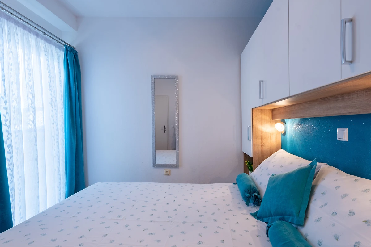 Komfort ist in dieser Unterkunft von grösster Bedeutung, mit Klimaanlage, um eine angenehme Temperatur während warmer Sommertage zu gewährleisten. Die Wohnung verfügt über ein Badezimmer mit Dusche, was den Gästen Bequemlichkeit bietet. Der Schlafbereich verfügt über ein komfortables Kingsize-Bett und zwei zusätzliche Betten, die flexible Übernachtungsmöglichkeiten bieten.