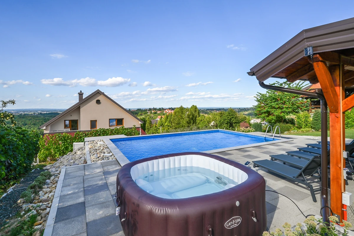 Entspannen und erholen Sie sich im privaten Spa-Bereich der Villa mit einem luxuriösen Whirlpool oder nehmen Sie ein erfrischendes Bad im 5,5x8 Meter grossen privaten Swimmingpool. Die Aussenbereiche sind ebenso beeindruckend, mit einem wunderschönen Garten, Grillbereich, Gartenmöbeln und einer Terrasse, die atemberaubende Ausblicke auf die umliegende Landschaft bietet.