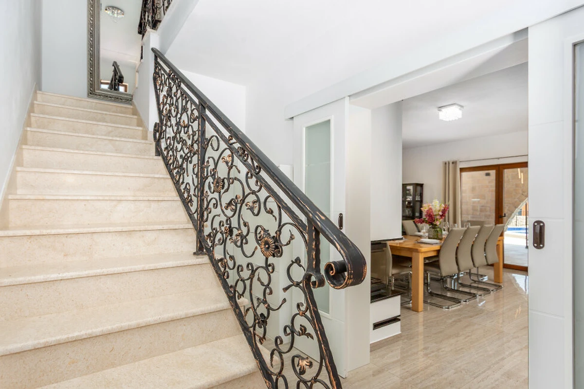 Das Herz des Hauses ist die moderne amerikanische Küche, vollständig ausgestattet mit Induktionskochen, einer umfassenden Auswahl an Geräten einschliesslich Kühlschrank, Gefrierschrank, Backofen, Geschirrspüler und Kaffeemaschine. Die Gäste werden das durchdachte Küchengeschirr und die Teller zu schätzen wissen, die für eine bequeme Mahlzubereitung bereitgestellt werden.