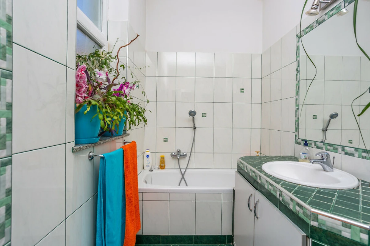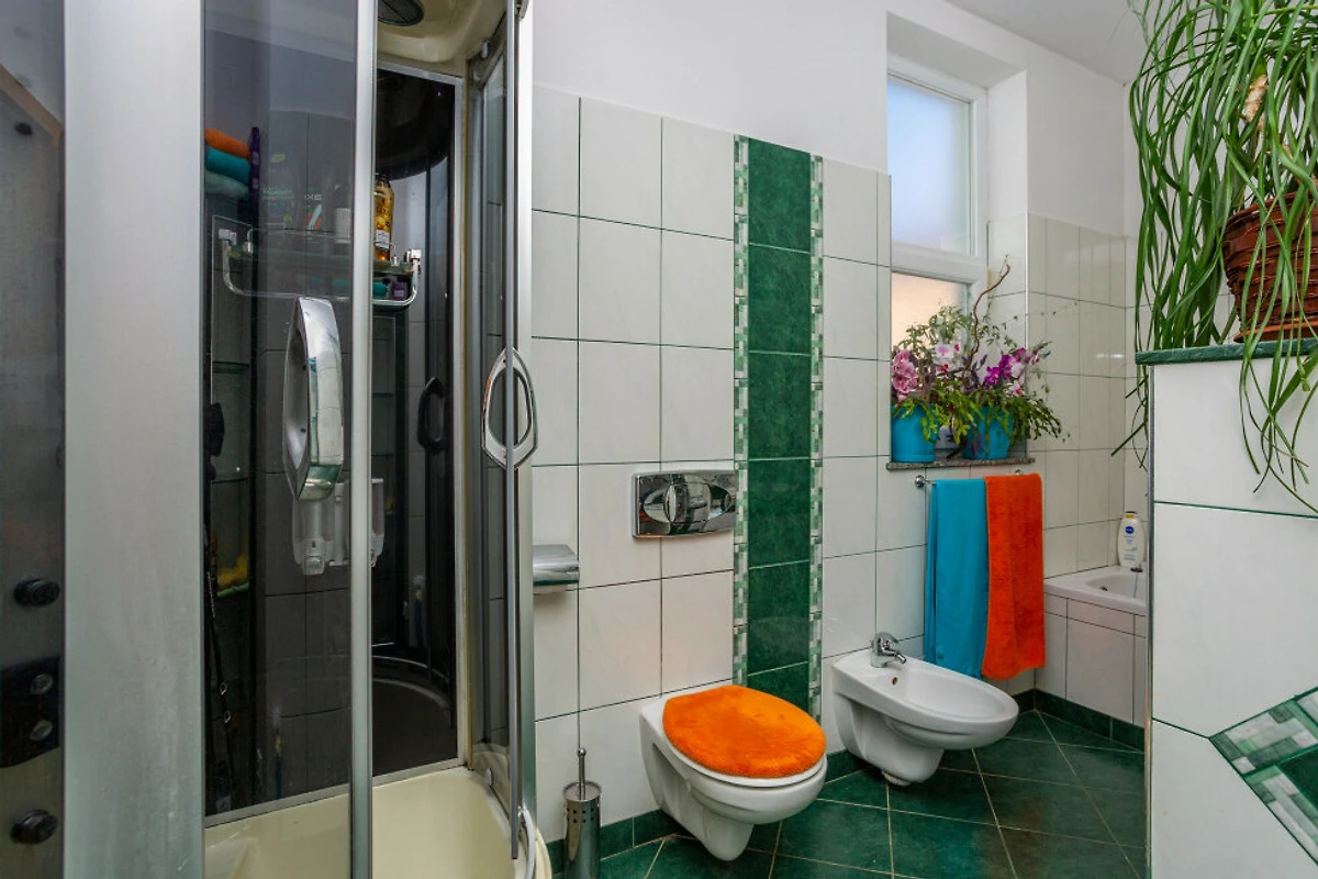 Die Wohnung verfügt über drei gut ausgestattete Badezimmer, darunter eines mit Dusche, ein anderes mit Badewanne und eine separate Toilette, die Bequemlichkeit und Privatsphäre für alle Gäste bieten. Die voll ausgestattete amerikanische Küche ist ein kulinarisches Paradies und verfügt über moderne Geräte wie Kühlschrank, Gefrierschrank, Geschirrspüler, Backofen, Mikrowelle, Kaffeemaschine sowie ein umfangreiches Set an Küchenutensilien und Geschirr.