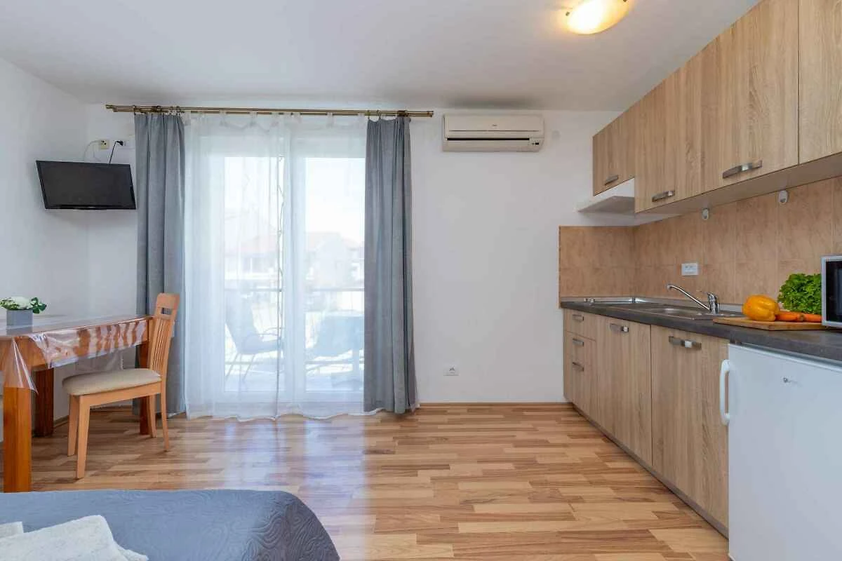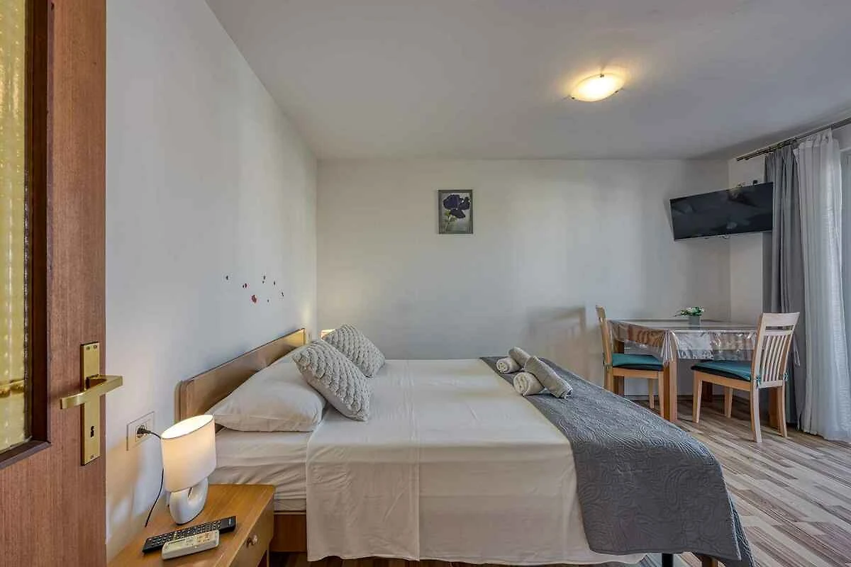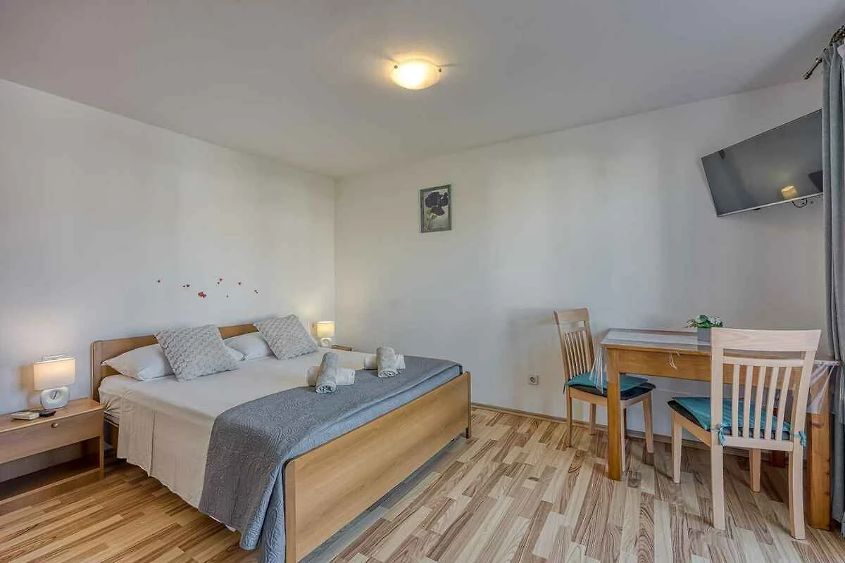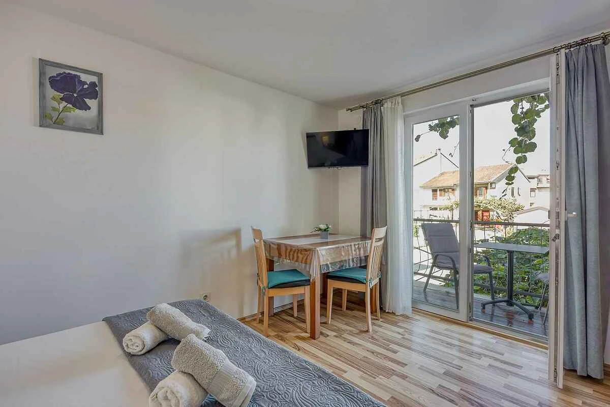 Wohn/Schlafzimmer mit 1 Doppelbett (Kingsize), TV, Essecke und Zugang zum Balkon (Gartenmöbel). Kochecke im Wohn/Schlafzimmer mit Gasherd, Kühlschrank und Kaffeemaschine. Bad mit Dusche und WC.