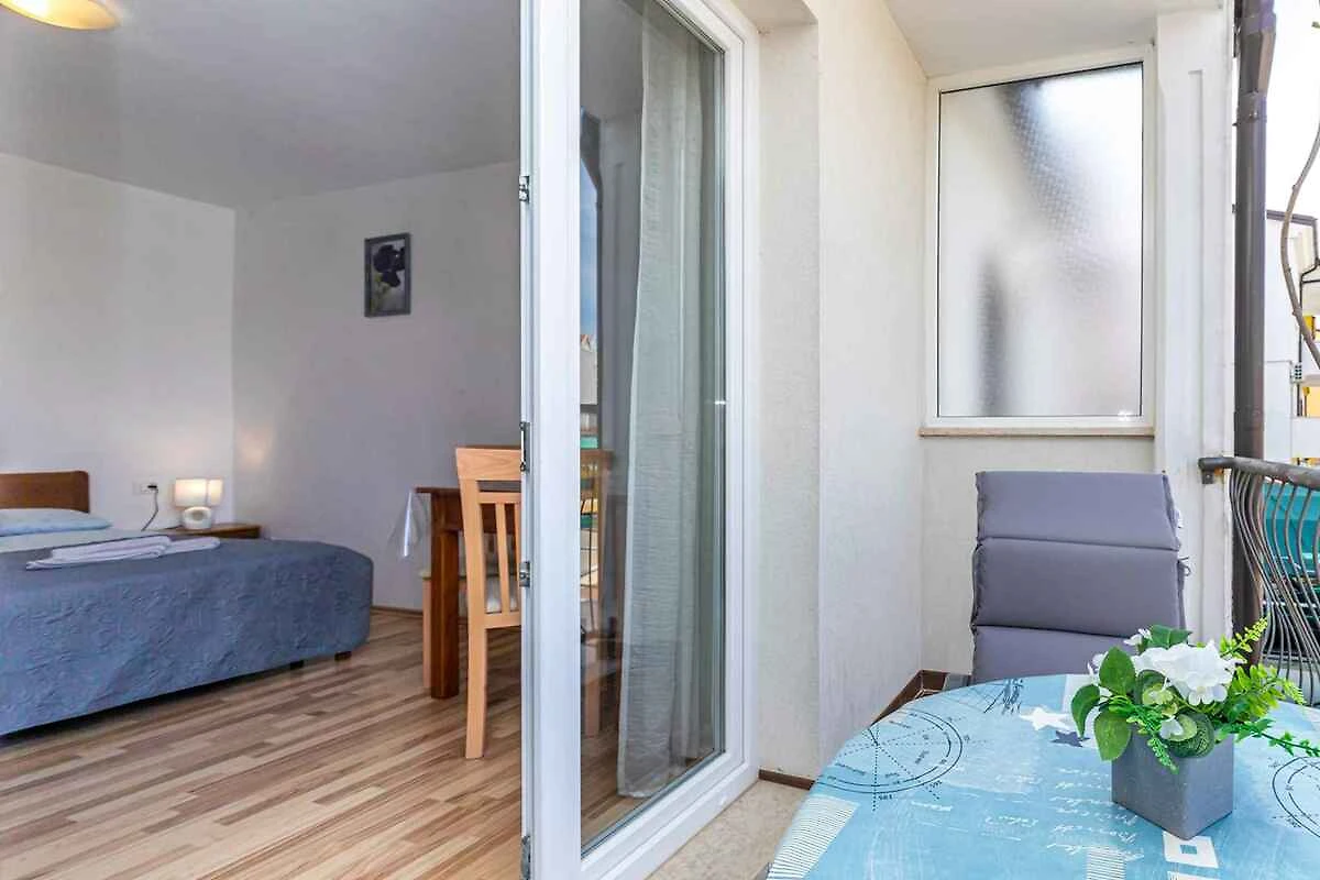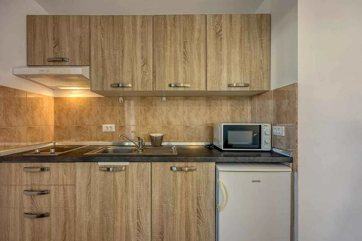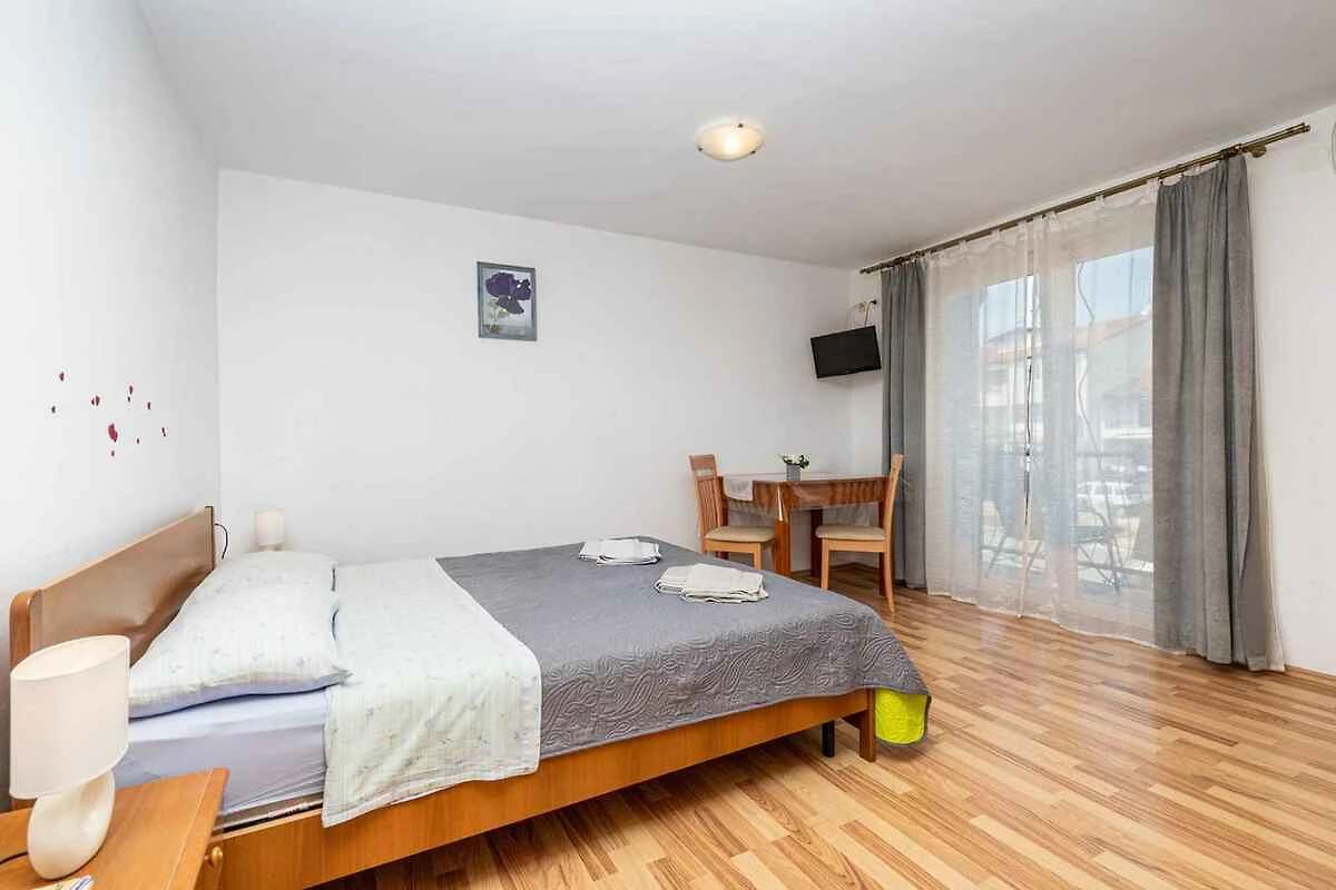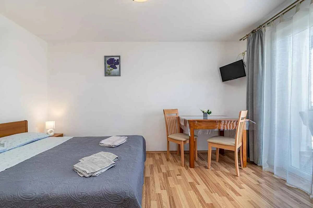 Wohn/Schlafzimmer mit 1 Doppelbett (Kingsize), TV, Essecke und Zugang zum Balkon (Gartenmöbel). Kochecke im Wohn/Schlafzimmer mit Gasherd, Kühlschrank und Kaffeemaschine. Bad mit Dusche und WC.