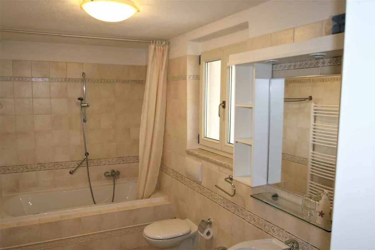 . Wohnzimmer mit 1 Zusatzbett auf Couch/Sofa und Zugang zur Terrasse (Gartenmöbel). Schlafzimmer mit 1 Doppelbett. Kochnische im Wohnzimmer mit Elektroherd, Backofen, Geschirrspüler, Kühlschrank (Eisfach), Mikrowelle, Kaffeemaschine, Toaster und elektrischem Wasserkocher. Bad mit Badewanne und Föhn.