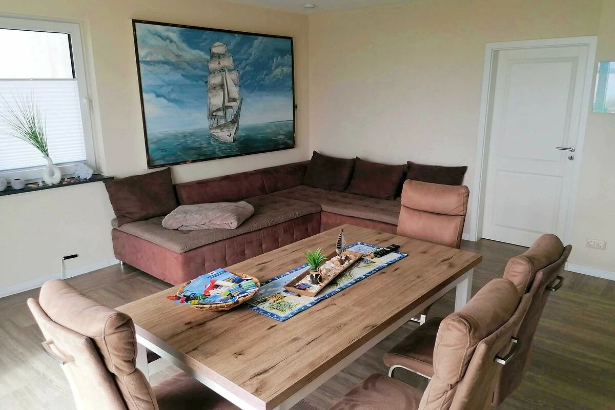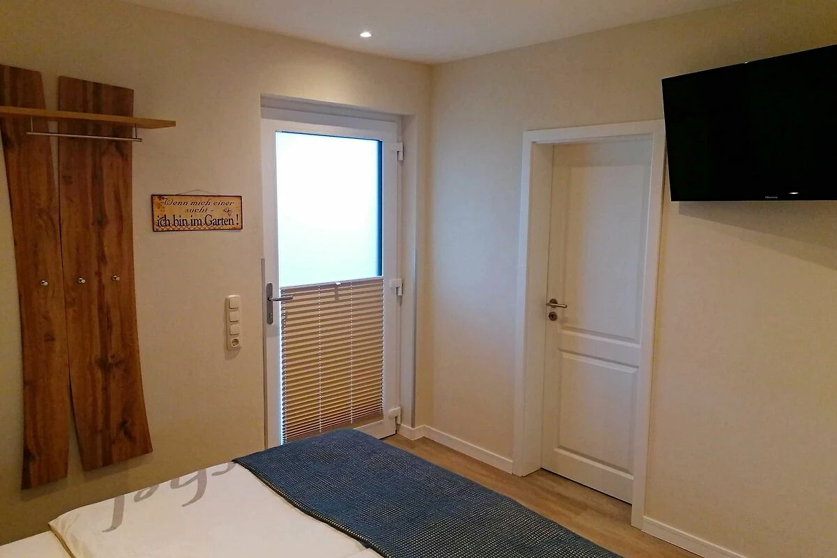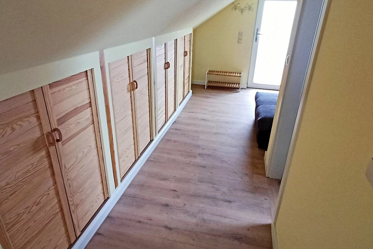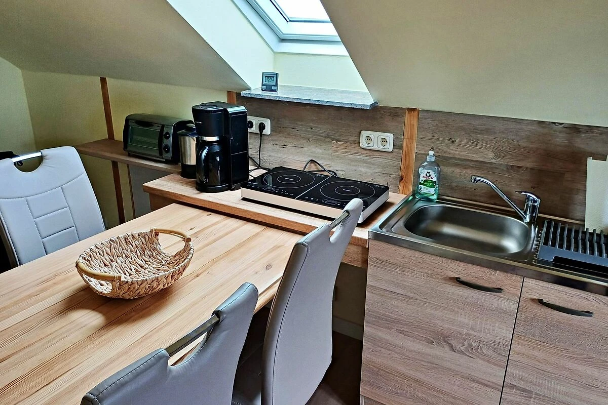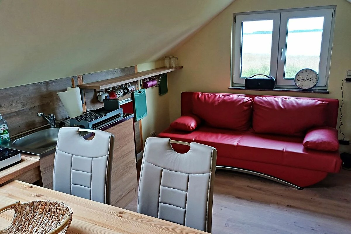 Das Dachgeschoss (mit Dachschrägen) mit sep. Eingang über eine Treppe von aussen ist ausgestattet mit Schlafcouch für 2 Personen, separater Küchenzeile mit 2-Platten-Herd, Kühlschrank, Kaffeemaschine, Wasserkocher sowie Toaster. Das kleine Bad verfügt über DU/WC. Auf der ca. 9 qm grossen möblierten Terrasse mit Strandkorb können Sie morgens Ihren Kaffee geniessen oder den Abend bei einem Glas Wein ausklingen lassen. Es stehen Ihnen 2 Pkw-Stellplätze zur Verfügung.