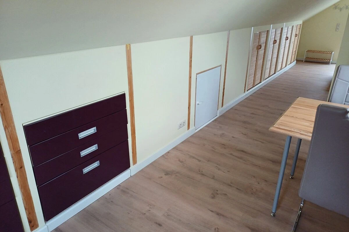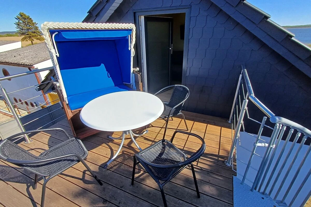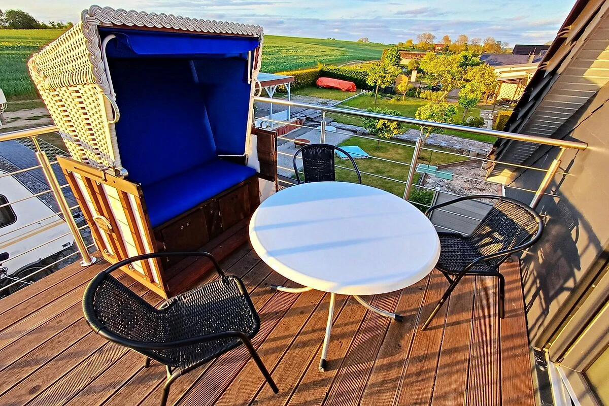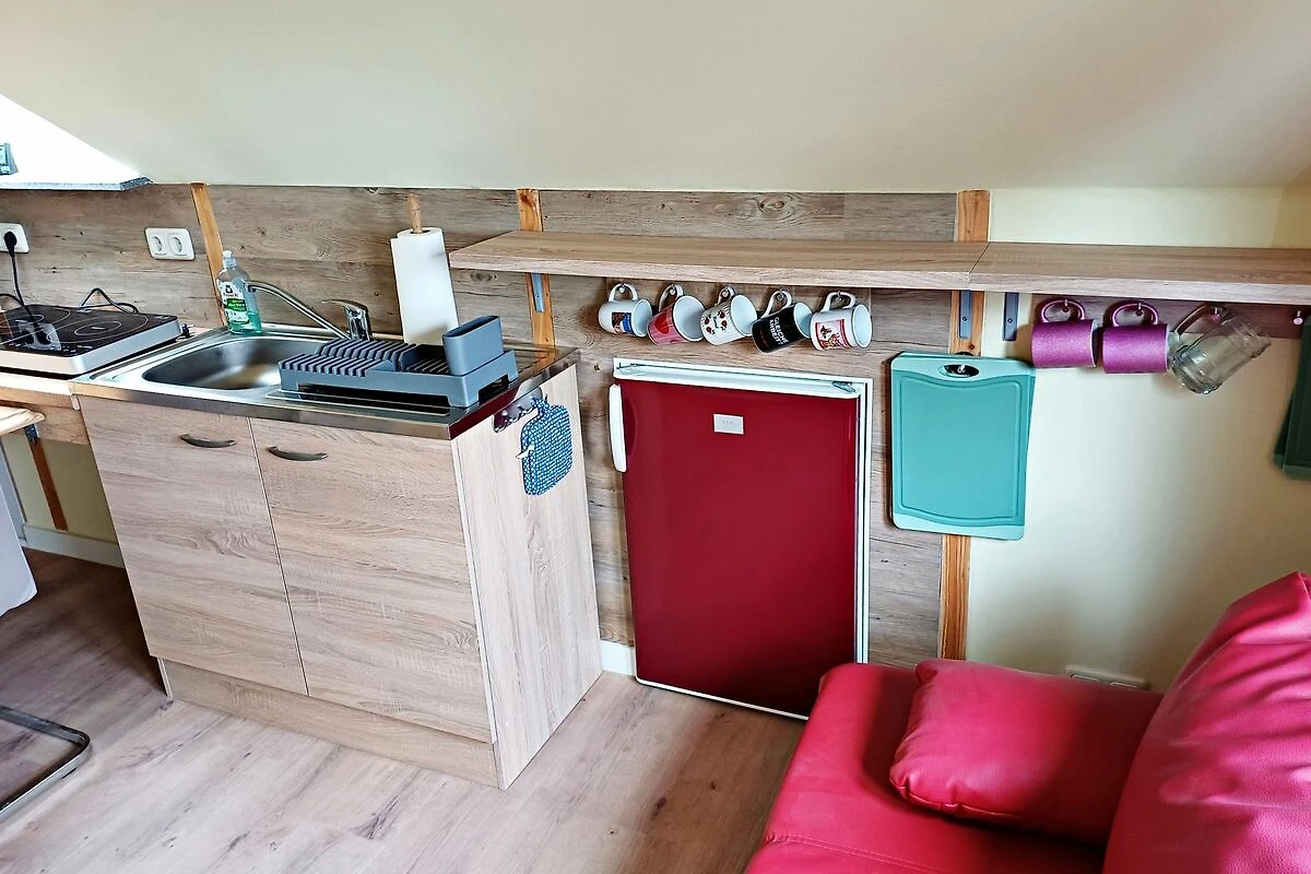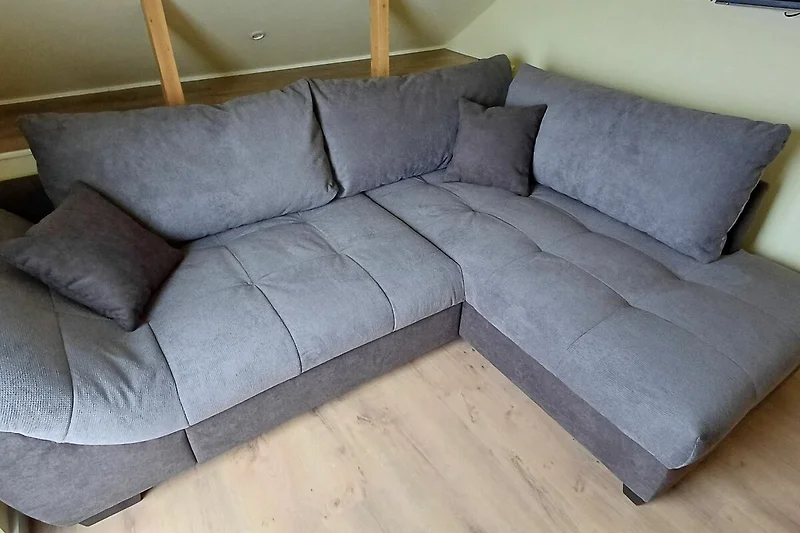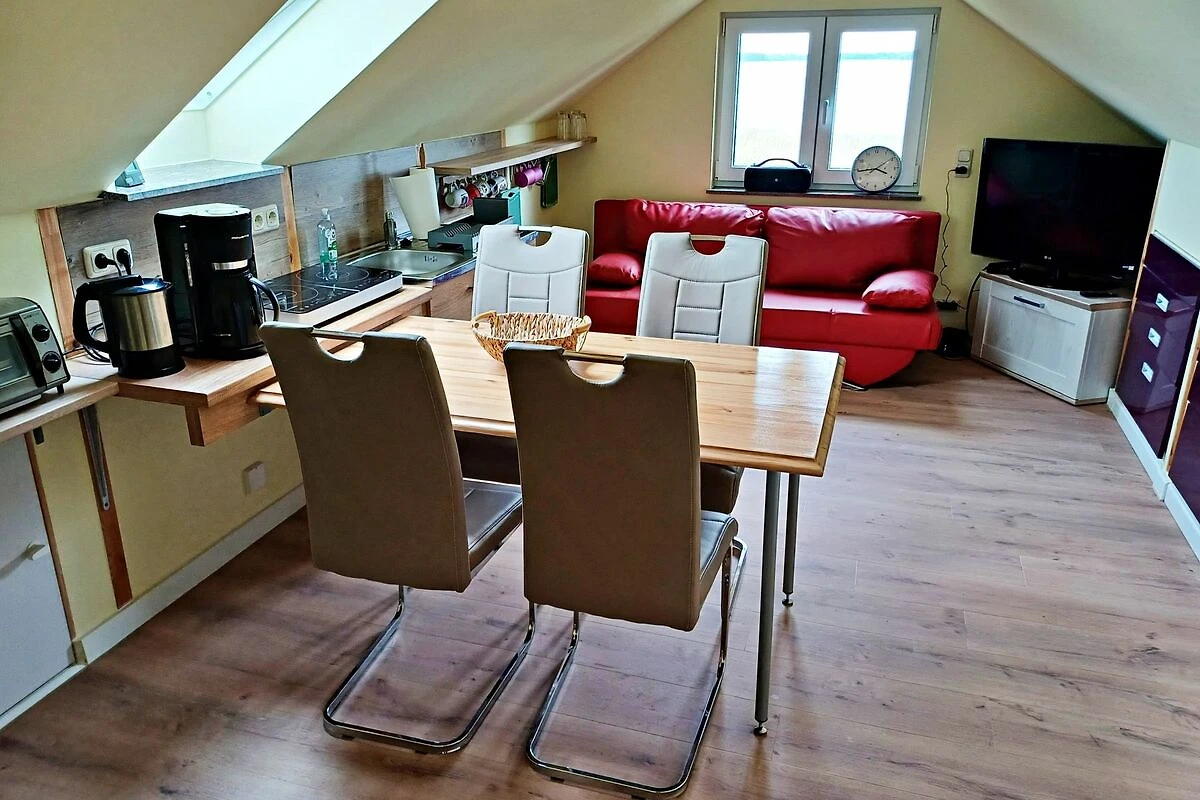 Die Ferienwohnung im Oberschoss ( Dachgeschoss mit Dachschrägen) mit sep. Eingang über eine Treppe von aussen ist ausgestattet mit einer Schlafcouch für 2 Personen, separater Küchenzeile mit 2-Platten-Herd, Kühlschrank, Kaffeemaschine, Wasserkocher sowie Toaster. Das kleine Bad verfügt über DU/WC. Auf der ca. 9 qm grossen möblierten Terrasse mit Strandkorb können Sie morgens Ihren Kaffee geniessen oder den Abend bei einem Glas Wein ausklingen lassen.