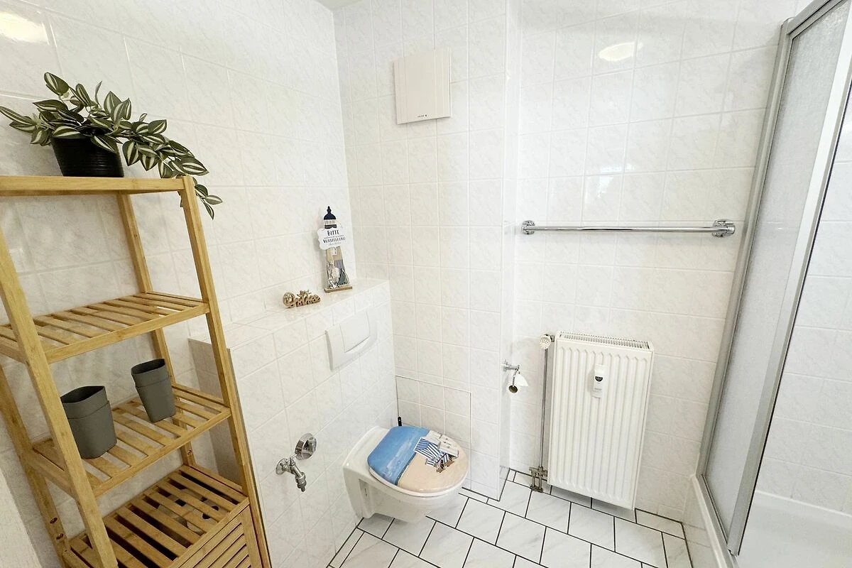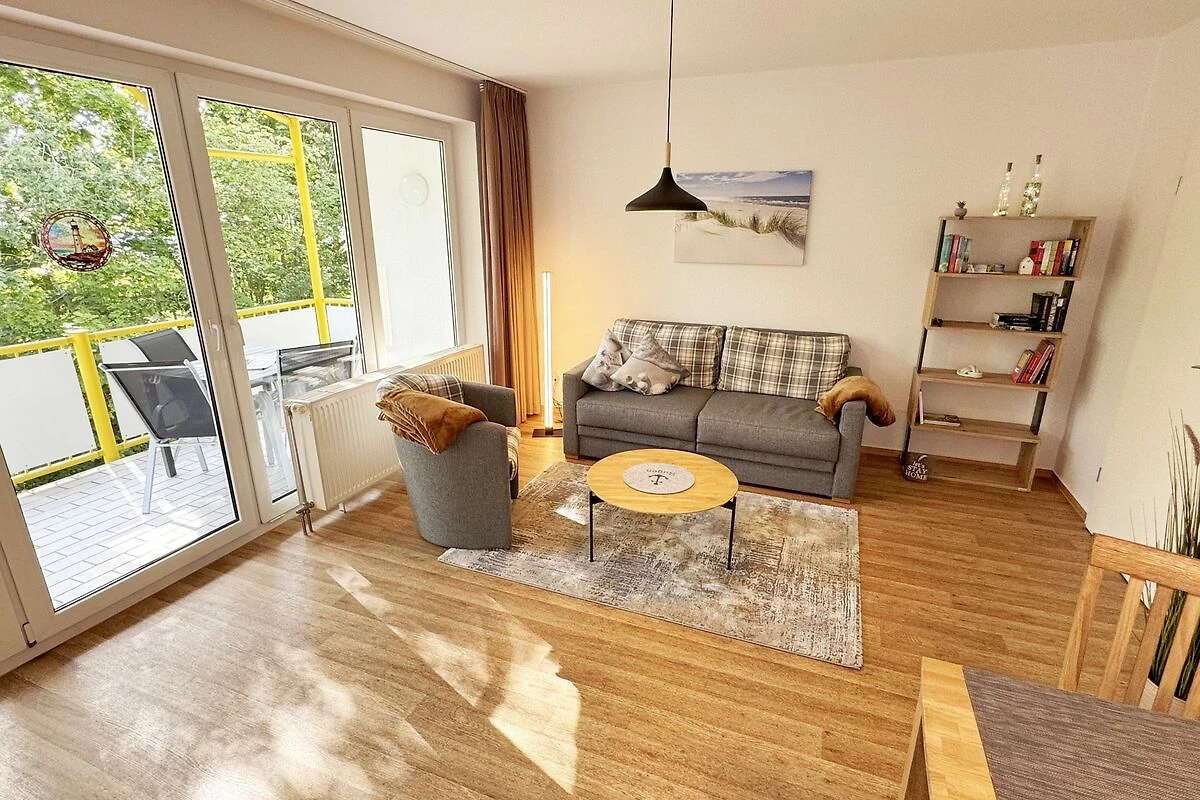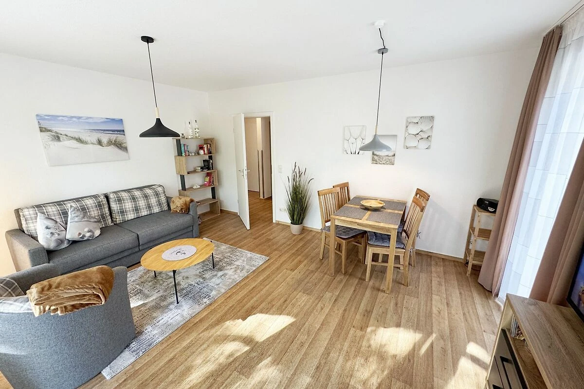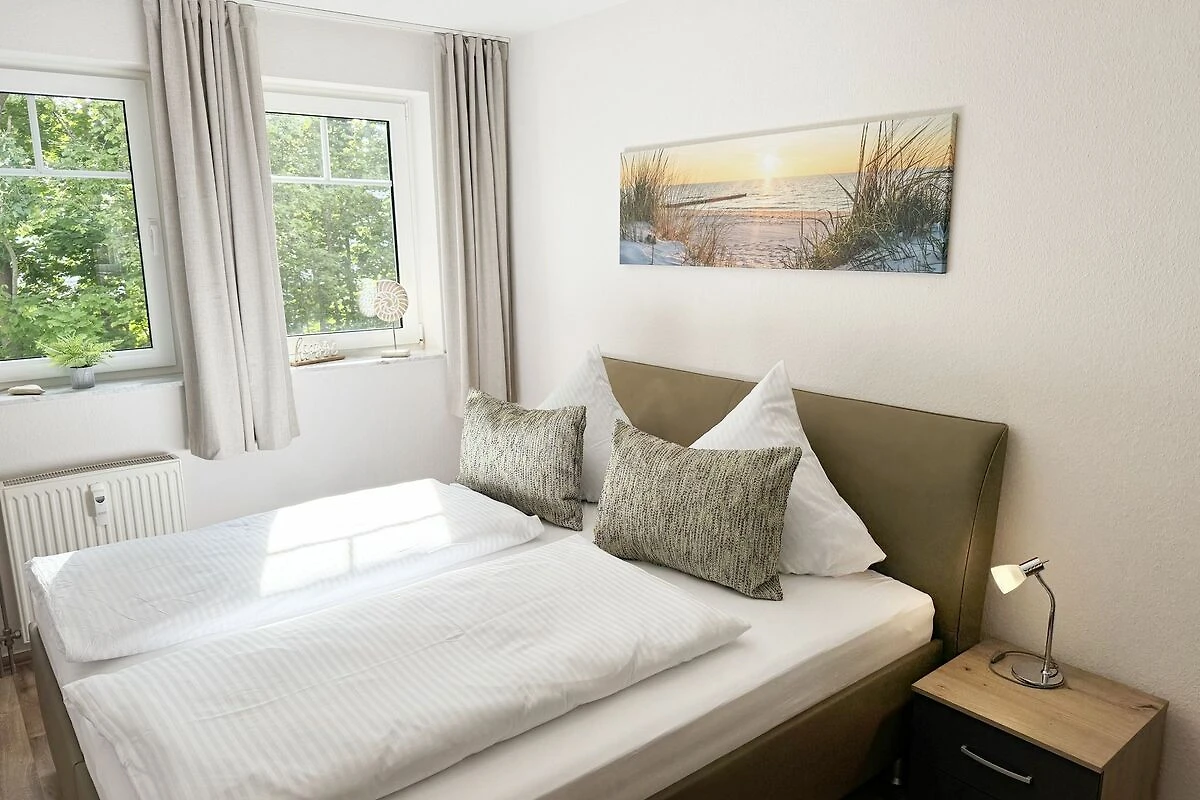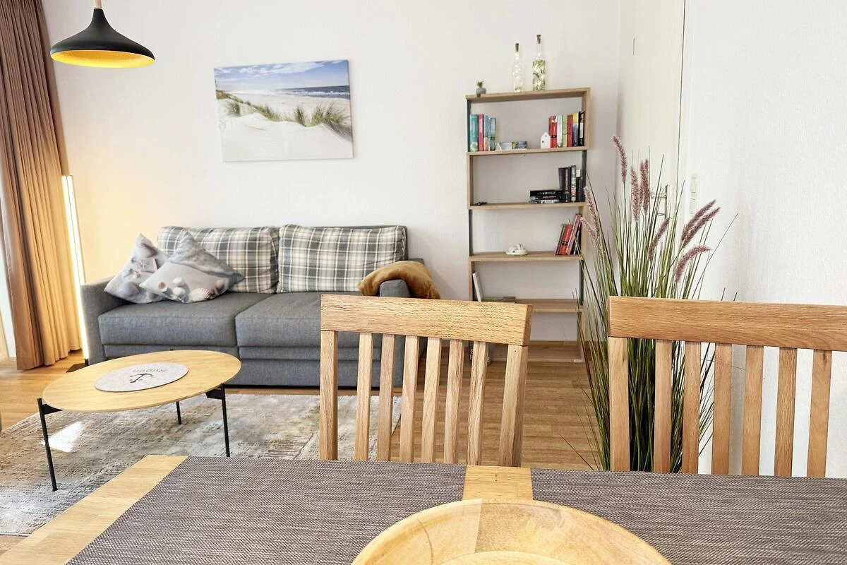 Die gemütliche ca. 52 m² grosse Nichtraucher-Oase der Ruhe liegt idyllisch im 1. Obergeschoss der Villa Störtebeker (Nr. 15) und bietet Ihnen für max. 2 bis 4 Personen, einen herrlichen Blick ins Grüne. Vom grossen Flur aus, mit Garderobe, einem Spiegel und einem Schrank, gelangen Sie in alle Räume. Die in allen Räumen verwendeten Möbel und Accessoires strahlen Ruhe und Gemütlichkeit aus perfekt, um dem Alltag zu entfliehen. Der grosszügige, lichtdurchflutete Wohnbereich lädt mit einer Essecke, einer komfortablen Schlafcouch (1,60m x 2,00m, Aufbettung für 3./4. Person), einem Sessel, einen Relaxesessel, einer Stehlampe, einem TV-Board und einem 55-Zoll-Smart-TV zum Entspannen ein. Auch bei nicht so gutem Wetter kommt keine Langeweile auf: denn Spiele, ein DAB-Radio und eine Bücherecke sorgen für zusätzliche Unterhaltung. Ein kostenfreier WLAN-Zugang ist ebenfalls vorhanden. Stilvolle, teilweise dimmbare Lampen sorgen für eine Wohlfühlatmosphäre. Vom Wohnbereich gelangen Sie auf den 10 m² grosse, überdachten und nach Osten ausgerichteten Balkon, umgeben von Grün und Bäumen, ist es der perfekte Ort für entspannte Stunden. Je nach Windrichtung können Sie auch das Meer zart rauschen hören. Die separate Küche ist komplett ausgestattet mit einem Cerankochfeld, einem Backofen, einem Geschirrspüler, einem Kühlschrank mit Eisfach, einer Spüle sowie weiteren Elektrogeräten wie einer Nespresso-Kaffeemaschine, einer Kaffeemaschine, einen Eierkocher, einem Wasserkocher, einem Toaster, einer Mikrowelle und einem Rührgerät/Mixer. Im geräumigen Schlafzimmer erwartet Sie ein erholsamer Schlaf in einem Doppelbett in Komforthöhe (1,80m x 2,00m) mit verstellbaren Lattenrosten. Nachttischablagen mit Beleuchtung, ein Herrendiener, ein Kleiderschrank und ein weiterer Flachbild-TV sind ebenfalls vorhanden. Die Verdunklungsmöglichkeit, sowie Insektenschutzgitter und die ruhige Lage sind beste Voraussetzungen für ruhige Nächte. Das innenliegende Badezimmer, mit einem WC, einer Dusche, einem Fön, einem Kosmetikspiegel und einem Waschplatz, bietet Ihnen den täglichen Komfort. Eine Waschmaschine und ein Trockner stehen gegen Gebühr im Waschraum zur Verfügung. Haustiere sind nicht erlaubt. Ihre Fahrräder können Sie im gemeinschaftlichen, abschliessbaren Fahrradhäuschen hinter dem Haus oder im abschliessbaren Keller des Hauses abstellen. Ihr PKW-Stellplatz (Nr. 15) befindet sich direkt vor dem Haus. Die Erstausstattung eines Wäschepaketes (komplette Bettwäsche, 1 Duschhandtuch, 1 kleines Handtuch) können Sie bis 14 Tage vor Anreise gegen Aufpreis dazu buchen oder durch eigene Ergänzen. Ab 2 gebuchten Paketen erhalten Sie einmalig 1 Geschirrhandtuch und 1 Duschvorleger dazu.