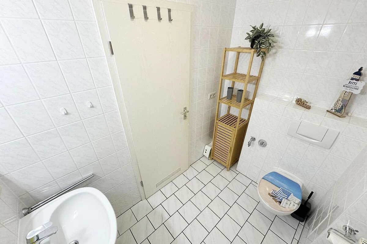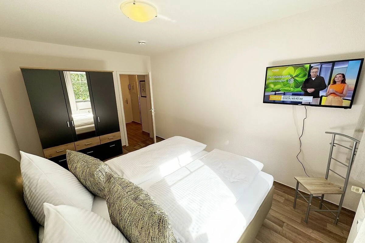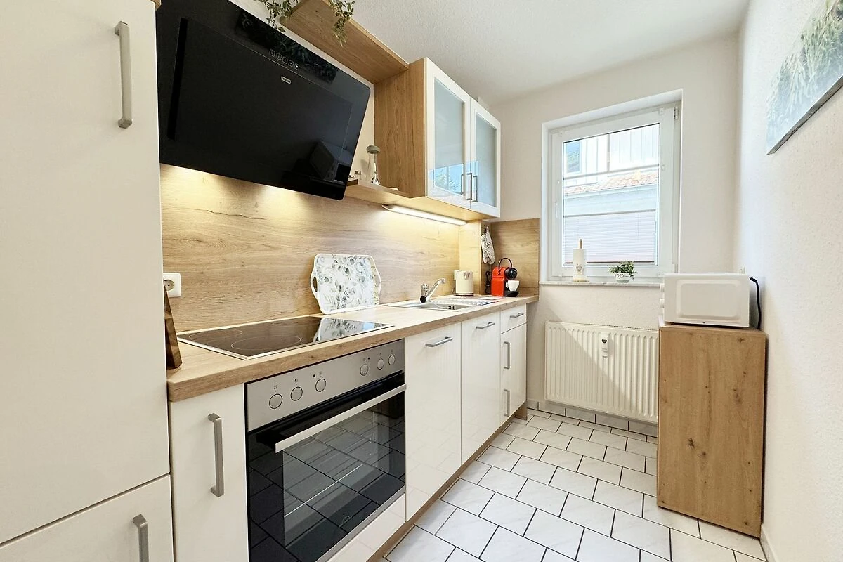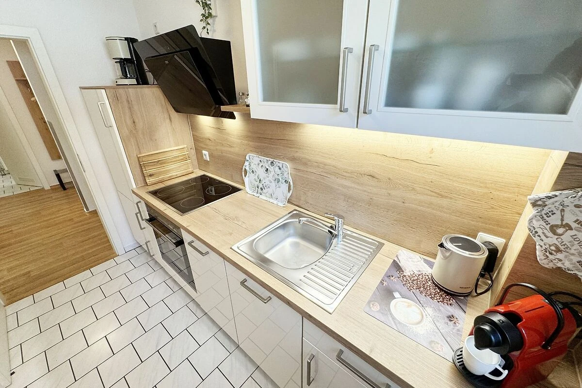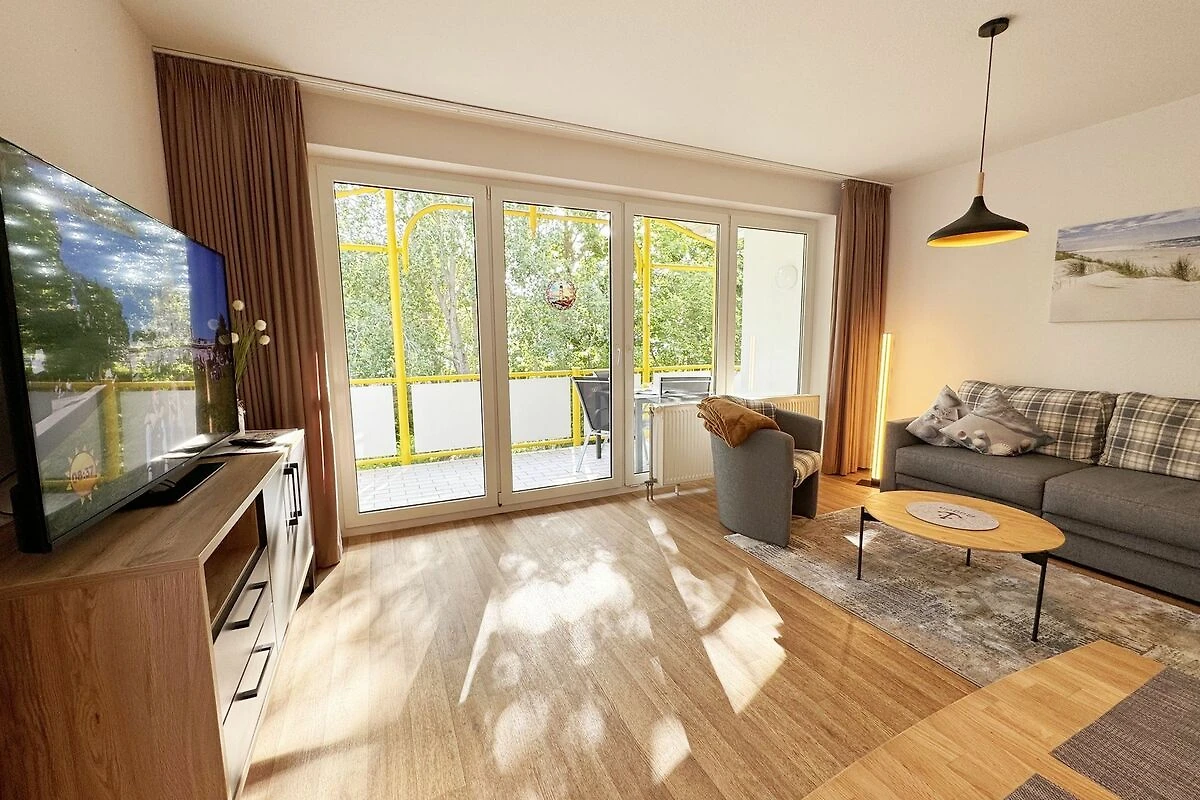 Die gemütliche ca. 52 m² grosse Nichtraucher-Oase der Ruhe liegt idyllisch im 1. Obergeschoss der Villa Störtebeker (Nr. 15) und bietet Ihnen für max. 2 bis 4 Personen, einen herrlichen Blick ins Grüne. Vom grossen Flur aus, mit Garderobe, einem Spiegel und einem Schrank, gelangen Sie in alle Räume. Die in allen Räumen verwendeten Möbel und Accessoires strahlen Ruhe und Gemütlichkeit aus perfekt, um dem Alltag zu entfliehen. Der grosszügige, lichtdurchflutete Wohnbereich lädt mit einer Essecke, einer komfortablen Schlafcouch (1,60m x 2,00m, Aufbettung für 3./4. Person), einem Sessel, einen Relaxesessel, einer Stehlampe, einem TV-Board und einem 55-Zoll-Smart-TV zum Entspannen ein. Auch bei nicht so gutem Wetter kommt keine Langeweile auf: denn Spiele, ein DAB-Radio und eine Bücherecke sorgen für zusätzliche Unterhaltung. Ein kostenfreier WLAN-Zugang ist ebenfalls vorhanden. Stilvolle, teilweise dimmbare Lampen sorgen für eine Wohlfühlatmosphäre. Vom Wohnbereich gelangen Sie auf den 10 m² grosse, überdachten und nach Osten ausgerichteten Balkon, umgeben von Grün und Bäumen, ist es der perfekte Ort für entspannte Stunden. Je nach Windrichtung können Sie auch das Meer zart rauschen hören. Die separate Küche ist komplett ausgestattet mit einem Cerankochfeld, einem Backofen, einem Geschirrspüler, einem Kühlschrank mit Eisfach, einer Spüle sowie weiteren Elektrogeräten wie einer Nespresso-Kaffeemaschine, einer Kaffeemaschine, einen Eierkocher, einem Wasserkocher, einem Toaster, einer Mikrowelle und einem Rührgerät/Mixer. Im geräumigen Schlafzimmer erwartet Sie ein erholsamer Schlaf in einem Doppelbett in Komforthöhe (1,80m x 2,00m) mit verstellbaren Lattenrosten. Nachttischablagen mit Beleuchtung, ein Herrendiener, ein Kleiderschrank und ein weiterer Flachbild-TV sind ebenfalls vorhanden. Die Verdunklungsmöglichkeit, sowie Insektenschutzgitter und die ruhige Lage sind beste Voraussetzungen für ruhige Nächte. Das innenliegende Badezimmer, mit einem WC, einer Dusche, einem Fön, einem Kosmetikspiegel und einem Waschplatz, bietet Ihnen den täglichen Komfort. Eine Waschmaschine und ein Trockner stehen gegen Gebühr im Waschraum zur Verfügung. Haustiere sind nicht erlaubt. Ihre Fahrräder können Sie im gemeinschaftlichen, abschliessbaren Fahrradhäuschen hinter dem Haus oder im abschliessbaren Keller des Hauses abstellen. Ihr PKW-Stellplatz (Nr. 15) befindet sich direkt vor dem Haus. Die Erstausstattung eines Wäschepaketes (komplette Bettwäsche, 1 Duschhandtuch, 1 kleines Handtuch) können Sie bis 14 Tage vor Anreise gegen Aufpreis dazu buchen oder durch eigene Ergänzen. Ab 2 gebuchten Paketen erhalten Sie einmalig 1 Geschirrhandtuch und 1 Duschvorleger dazu.