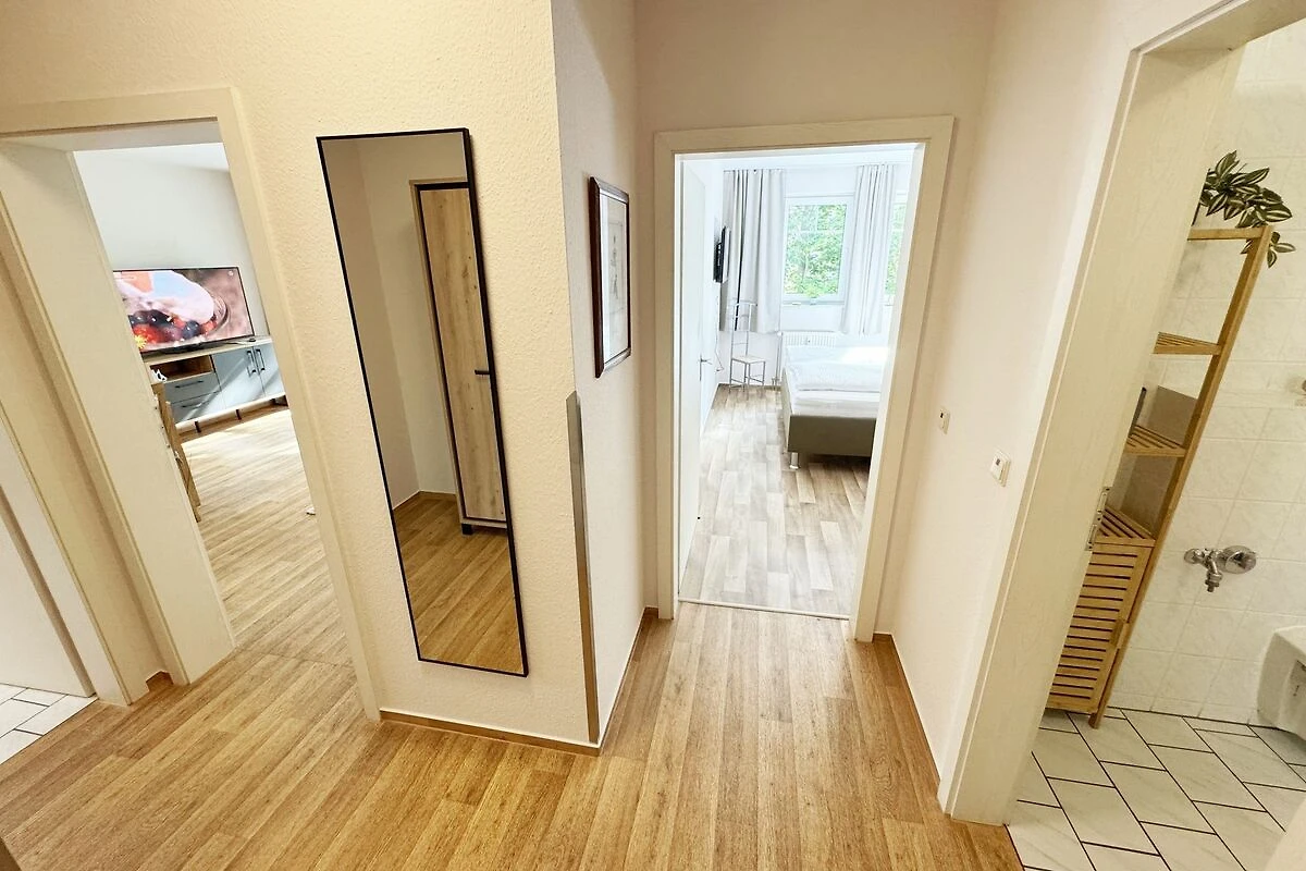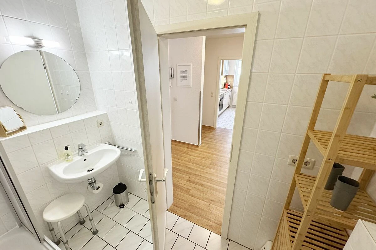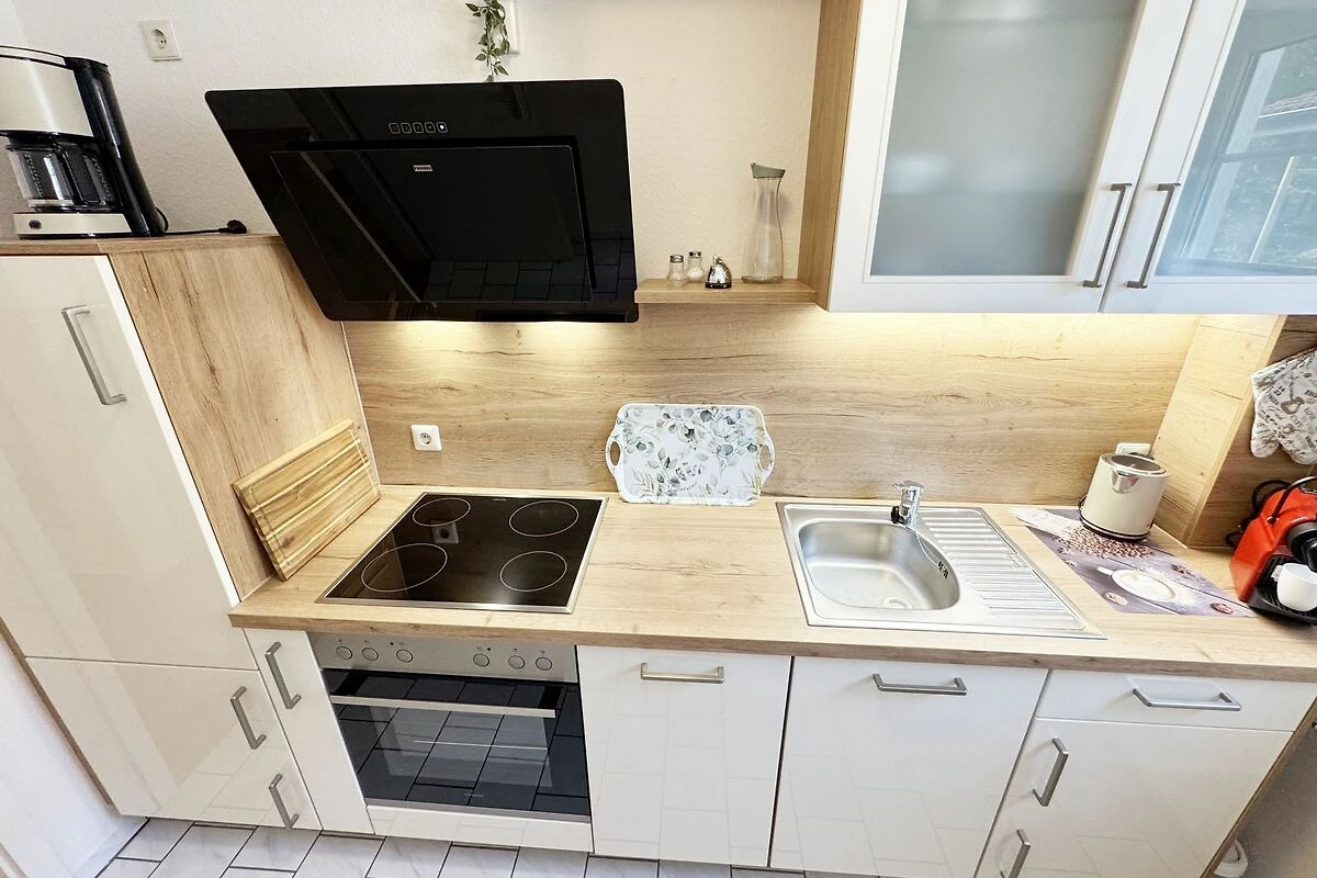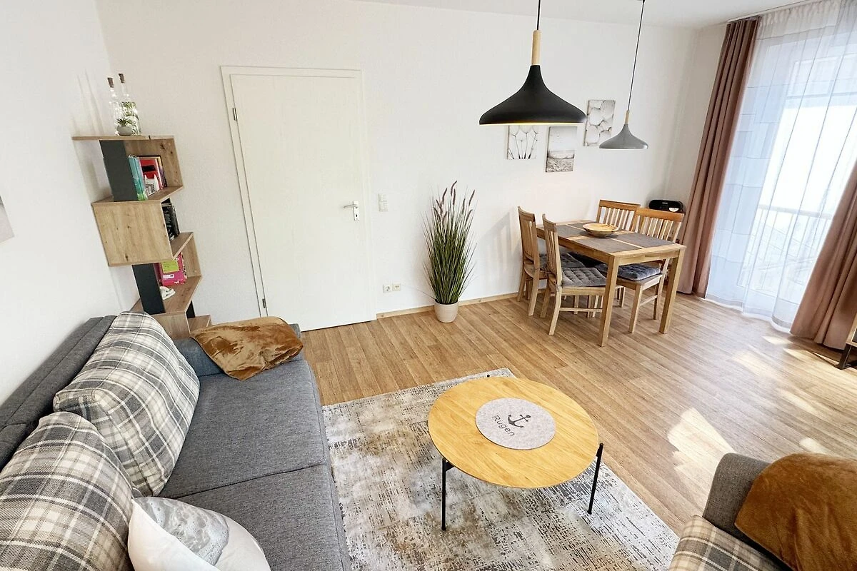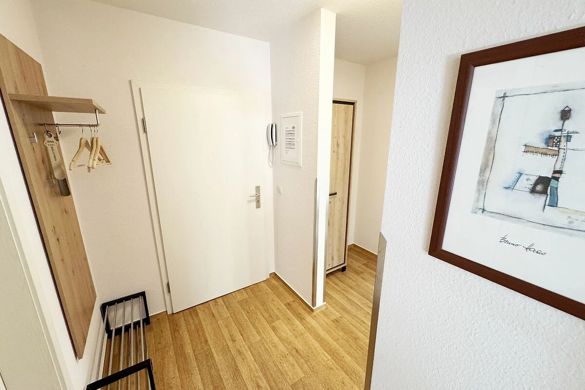 Die gemütliche ca. 52 m² grosse Nichtraucher-Oase der Ruhe liegt idyllisch im 1. Obergeschoss der Villa Störtebeker (Nr. 15) und bietet Ihnen für max. 2 bis 4 Personen, einen herrlichen Blick ins Grüne. Vom grossen Flur aus, mit Garderobe, einem Spiegel und einem Schrank, gelangen Sie in alle Räume. Die in allen Räumen verwendeten Möbel und Accessoires strahlen Ruhe und Gemütlichkeit aus perfekt, um dem Alltag zu entfliehen. Der grosszügige, lichtdurchflutete Wohnbereich lädt mit einer Essecke, einer komfortablen Schlafcouch (1,60m x 2,00m, Aufbettung für 3./4. Person), einem Sessel, einen Relaxesessel, einer Stehlampe, einem TV-Board und einem 55-Zoll-Smart-TV zum Entspannen ein. Auch bei nicht so gutem Wetter kommt keine Langeweile auf: denn Spiele, ein DAB-Radio und eine Bücherecke sorgen für zusätzliche Unterhaltung. Ein kostenfreier WLAN-Zugang ist ebenfalls vorhanden. Stilvolle, teilweise dimmbare Lampen sorgen für eine Wohlfühlatmosphäre. Vom Wohnbereich gelangen Sie auf den 10 m² grosse, überdachten und nach Osten ausgerichteten Balkon, umgeben von Grün und Bäumen, ist es der perfekte Ort für entspannte Stunden. Je nach Windrichtung können Sie auch das Meer zart rauschen hören. Die separate Küche ist komplett ausgestattet mit einem Cerankochfeld, einem Backofen, einem Geschirrspüler, einem Kühlschrank mit Eisfach, einer Spüle sowie weiteren Elektrogeräten wie einer Nespresso-Kaffeemaschine, einer Kaffeemaschine, einen Eierkocher, einem Wasserkocher, einem Toaster, einer Mikrowelle und einem Rührgerät/Mixer. Im geräumigen Schlafzimmer erwartet Sie ein erholsamer Schlaf in einem Doppelbett in Komforthöhe (1,80m x 2,00m) mit verstellbaren Lattenrosten. Nachttischablagen mit Beleuchtung, ein Herrendiener, ein Kleiderschrank und ein weiterer Flachbild-TV sind ebenfalls vorhanden. Die Verdunklungsmöglichkeit, sowie Insektenschutzgitter und die ruhige Lage sind beste Voraussetzungen für ruhige Nächte. Das innenliegende Badezimmer, mit einem WC, einer Dusche, einem Fön, einem Kosmetikspiegel und einem Waschplatz, bietet Ihnen den täglichen Komfort. Eine Waschmaschine und ein Trockner stehen gegen Gebühr im Waschraum zur Verfügung. Haustiere sind nicht erlaubt. Ihre Fahrräder können Sie im gemeinschaftlichen, abschliessbaren Fahrradhäuschen hinter dem Haus oder im abschliessbaren Keller des Hauses abstellen. Ihr PKW-Stellplatz (Nr. 15) befindet sich direkt vor dem Haus. Die Erstausstattung eines Wäschepaketes (komplette Bettwäsche, 1 Duschhandtuch, 1 kleines Handtuch) können Sie bis 14 Tage vor Anreise gegen Aufpreis dazu buchen oder durch eigene Ergänzen. Ab 2 gebuchten Paketen erhalten Sie einmalig 1 Geschirrhandtuch und 1 Duschvorleger dazu.
