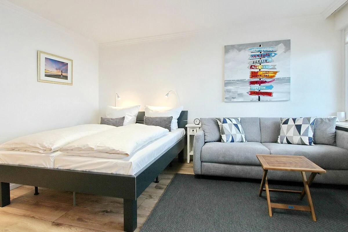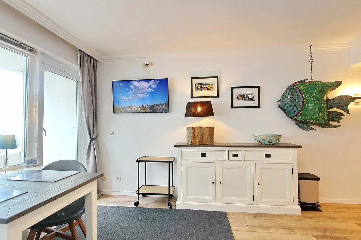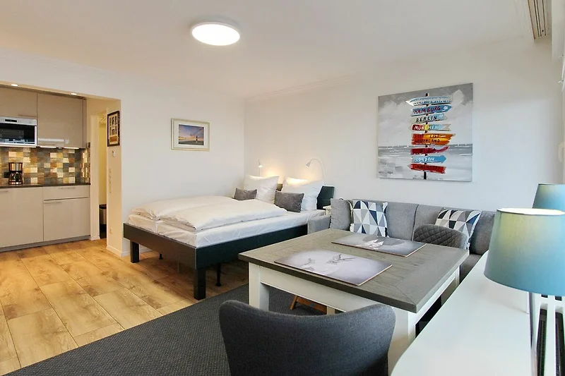 Modern und exklusiv eingerichtete 1 Zimmer-Wohnung im Herzen unserer Inselmetropole Westerland. Von der Wohnung und vom vorgelagerten Balkon zur Westseite haben Sie einen traumhaften Blick die Strandstrasse hoch auf die Nordsee. Der kombinierte Wohn-/Schlafraum verfügt über ein feststehendes Doppelbett, einer gemütlichen Couchgarnitur und einem Essplatz mit zwei Stühlen. In der Küchenzeile, die ebenfalls im Wohnzimmer integriert ist, finden Sie eine Mikrowelle, einen Geschirrspüler, ein grosses Induktion-Cerankochfeld und einem Kühlschrank mit Gefrierfach. Modernes Duschbad/WC mit einer Eckdusche mit tiefen Einstieg und einem Handtuchheizkörper. Smart-TV. Der Eigentümer hat ein eigenen Internetzugang ( Zugangsdaten in der Wohnung), der es Ihnen ermöglicht zu streamen oder zu arbeiten oder was das Herz begehrt. Haustiere sind nicht erlaubt. Nichtraucherwohnung. Wohnungsgrösse ca. 31m²