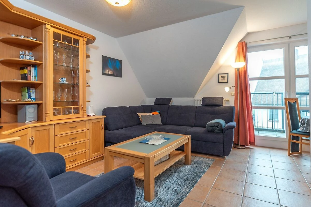 • Balkon mit Ausblick: Der Südbalkon eröffnet einen atemberaubenden Blick auf die umliegende Natur und das glitzernde Haff. Ein Ort, der zum Entspannen und Träumen einlädt.
