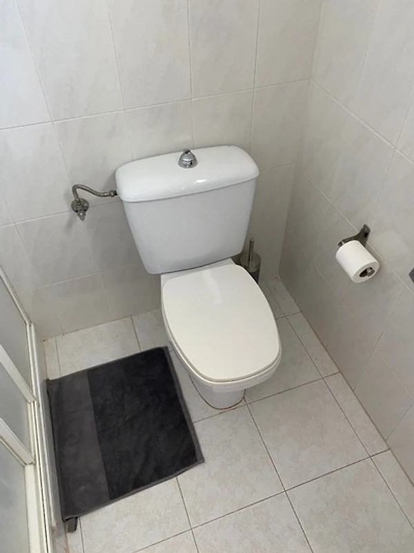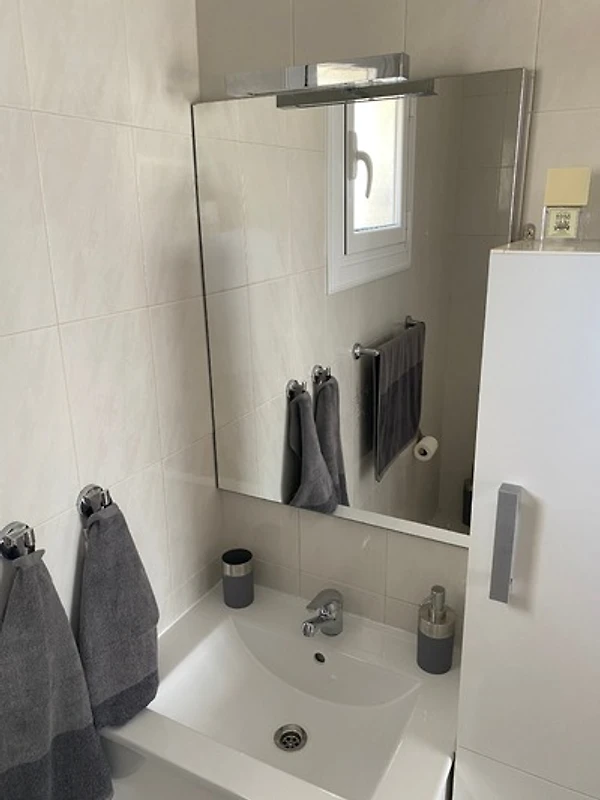 Das Badezimmer verfügt über eine Dusche, Waschbecken, Toilette und alle notwendigen Annehmlichkeiten wie Handtücher und Toilettenartikel.