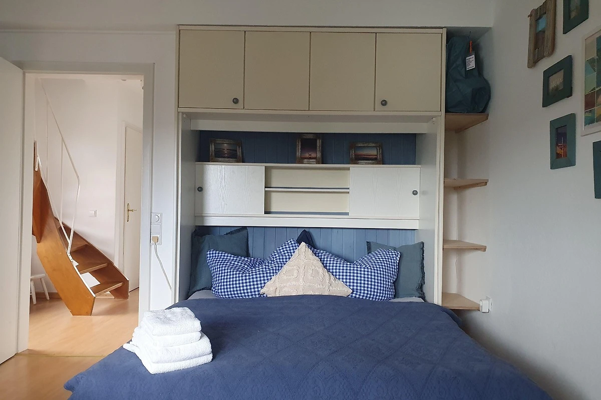 Im Erdgeschoss haben Sie Zugang zur Sonnenterrasse mit Strandkorb, Tisch und Stühle. Seitlich des Hauses befindet sich noch ein Gartenbereich mit Strandkorb, Tisch und Stühlen. Das grosses Wohnzimmer mit Comfort Schlafcouch ist auch als Schlafzimmer zu nutzen. Hier befindet sich auch die Essgruppe mit Tisch, eine separate voll ausgestattete Küche mit Backofen und Spülmaschine und ein Bad.