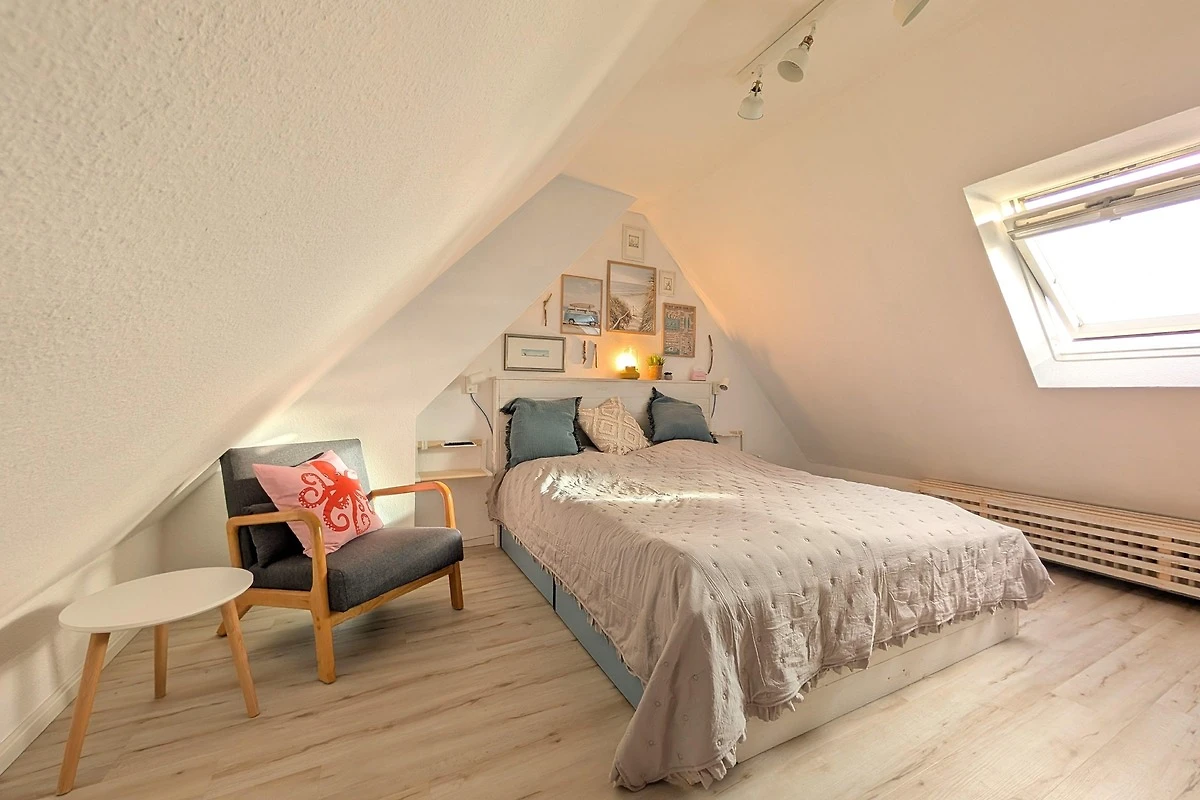 Im Dachgeschoss liegt ein weiteres Schlafzimmer mit Doppelbett, Schrank, Sessel und TV.