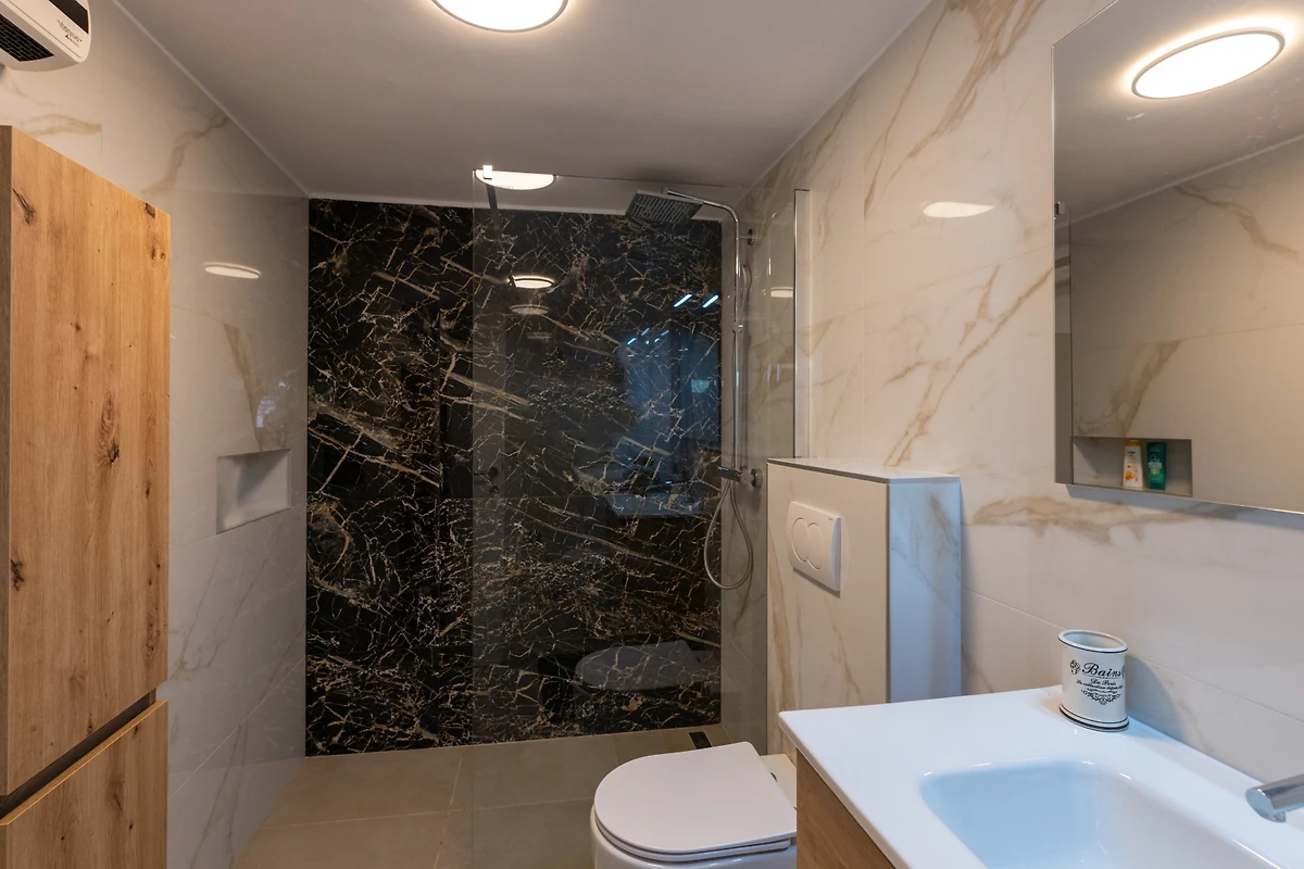 Die Villa verfügt über zwei moderne Badezimmer, die jeweils eine praktische Dusche haben und somit Komfort und Privatsphäre für alle Gäste gewährleisten. Die geräumige amerikanische Küche ist ein kulinarisches Paradies, ausgestattet mit einem beeindruckenden Angebot an Ausstattung, darunter ein Gasherd, Kühlschrank, Gefrierschrank, Geschirrspüler, Mikrowelle, Backofen, Kaffeemaschine sowie ein umfassendes Set an Küchenutensilien und Geschirr.